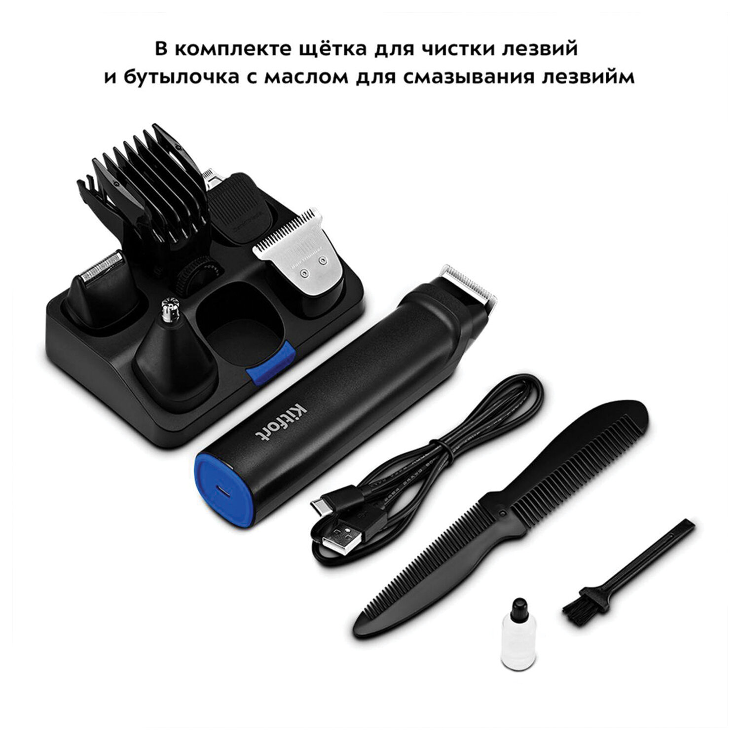 Триммер 4 в 1 KITFORT КТ-3140-3, 6 насадок, 20 установок длины 0,5-20 мм, беспроводной, черный Код товара: 458185 2 602,17 ₽ Купить Производитель:KITFORT Триммер "4 в 1" Kitfort KT-3140 – это прибор для бритья, стрижки, подравнивания бороды, усов или бакенбард, а также для стрижки волос в носу и ушах. Триммер Kitfort КТ-3140-3 – многофункциональное устройство, которое включается и выключается нажатием на одну кнопку. В комплектацию входит шесть насадок: с лезвием из нержавеющей стали шириной 40 мм, для носа и ушей, для точной стрижки и два гребня с возможностью регулировки длины среза от 0,5 до 10 мм и от 10 до 20 мм. Наличие базы-подставки делает хранение аксессуаров удобным. Прибор поставляется с расческой, маслом для смазки и щеточкой для чистки. Триммер отличается компактным размером 3,7х16,1х4,6 см и небольшим весом, равным 320 г, что делает процесс пользования удобным. За автономную работу в течение 60 минут отвечает интегрированный литий-ионный аккумулятор. О запуске и статусе зарядки информирует индикатор. Для восполнения ресурса батареи требуется до 120 минут, для чего задействуется USB-кабель длиной 0,5 м. Корпус изготовлен из пластика, стойкого к износу и механическим повреждениям. Производитель оставляет за собой право без предварительного уведомления вносить изменения в технические характеристики, комплектацию и конструкцию, не ухудшающие эксплуатационные характеристики изделия.Производство: КитайНазначение: для бороды, для волос, для носа и ушей, для телаМаксимальная длина стрижки: 20 ммМинимальная длина стрижки: 0.5 ммКоличество насадок для волос: 3 шт.Количество насадок для бороды: 2 шт.Способ регулировки длины: регулировка, смена насадокЧисло установок длины: 20 штШирина ножа: 40 ммМатериал лезвий: нержавеющая стальМощность: 5 ВтИндикация зарядки: даИдикатор установки длины: даПитание: от аккумулятораВремя работы от аккумулятора: 60 минВремя зарядки: 2 часМатериал корпуса: пластикЦвет корпуса: черный/синийВысота: 161 ммШирина: 46 ммГлубина: 37 ммВес изделия: 320 гВес: 230 грРазмер упаковки: 5 × 10 × 21 смОбъём: 0.0013 м3Промежуточная упаковка: 24 штТранспортная упаковка: 24 штШтрих-код: 4620129512053