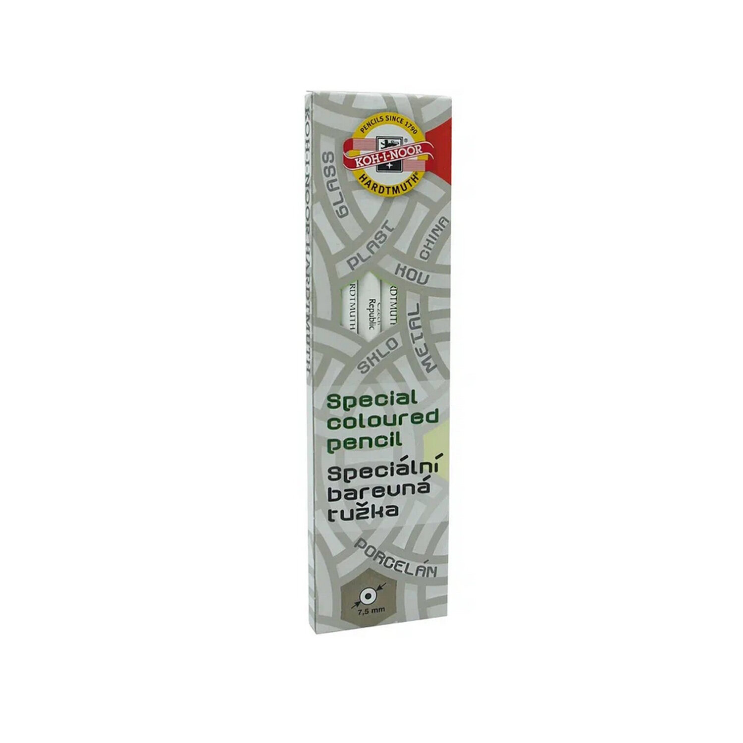 Карандаш по стеклу, металлу и пластику KOH-I-NOOR, 1 шт., грифель 4,3 мм, корпус белый Код товара: 182192 127,39 ₽ Купить Производитель:KOH-I-NOOR Специальный карандаш KOH-I-NOOR на восковой основе для рисования на стекле, фарфоре, пластике, металле и других гладких поверхностях. Лакированный корпус круглой формы выполнен из древесины. Имеет длину 175 мм с диаметром 7,5 мм.Производство: ЧехияВид карандаша: специальныйФорма корпуса: круглаяДиаметр грифеля: 4.3 ммКоличество в комплекте: 1 шт.Твердость грифеля: ВДлина корпуса: 175 ммМатериал корпуса: дерево Лакированный корпус: даМатериал грифеля: воскЦвет грифеля: белыйУпаковка: картонная коробкаВес: 8 грРазмер упаковки: 0.7 × 17.4 × 0.7 смОбъём: 0.0002 м3Промежуточная упаковка: 6 штТранспортная упаковка: 6 штШтрих-код: 8593539273356 Сертификат-1.jpg Сертификат-2.jpg Сертификат-3.jpg