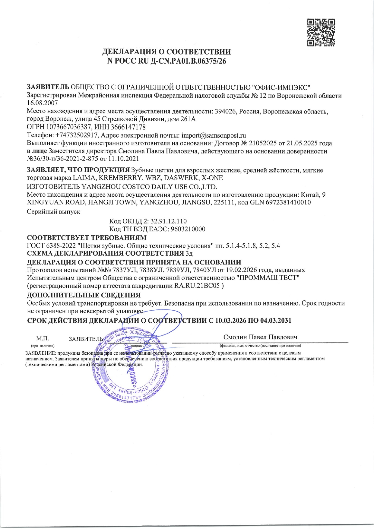 Зубная щетка монопучковая, для ухода за брекетами, для детей, КОМПЛЕКТ 2 шт., LAIMA DENT Код товара: 609321 226,56 ₽ Купить Производитель:LAIMA DENT Монопучковая зубная щетка LAIMA DENT– идеальный выбор для всей семьи. Обеспечивает качественную гигиену в труднодоступных местах Щетина средней жесткости для максимального очищение. Идеально подходит для ухода за брекетами. Подходит для детей и взрослых. Важно! Перед использованием новую зубную щетку промыть в теплой воде (не более 60 °С) с мылом. Более высокая температура воды может деформировать материал щетки и её ручки. Во время использования рекомендуется хранить щетку в вертикальном положении, щетиной вверх. Рекомендуемый срок службы зубной щетки – 2-3 месяца.Производство: КитайТип товара: зубная щеткаЖесткость щетины: средняяКоличество в упаковке: 2 шт.Особенности щетки: для ухода за брекетамиСерия: DENT SETВозрастная группа: взрослая, детскаяВес: 33 грРазмер упаковки: 1.6 × 22.3 × 5 смОбъём: 0.0003 м3Промежуточная упаковка: 12 штТранспортная упаковка: 144 штШтрих-код: 4606224439495 Файлы Сертификат-1.jpg Сертификат-2.jpg