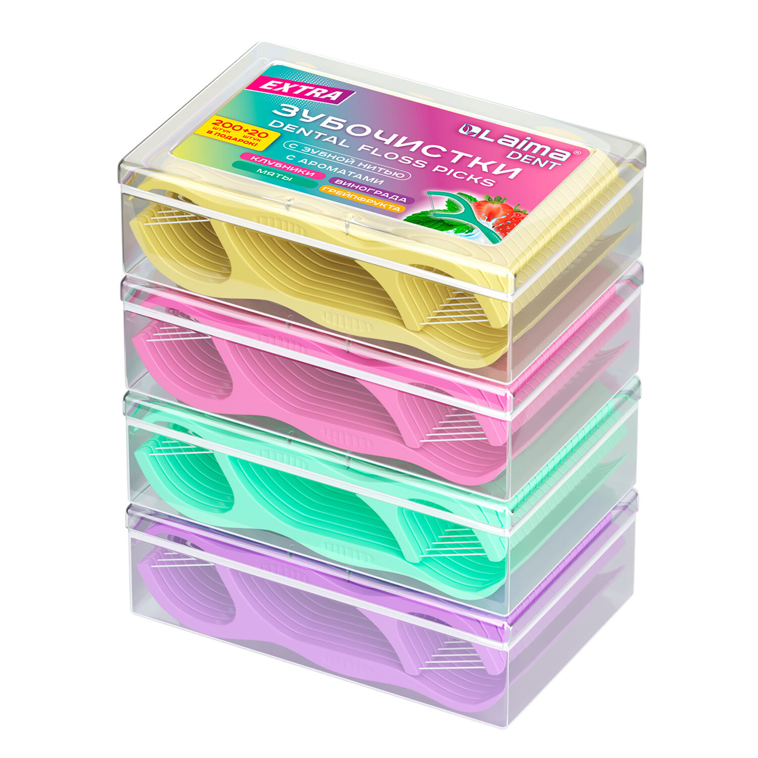 Зубочистки-флоссеры с зубной нитью "200 шт. (4х50 шт.) + 20 в подарок!", ВКУС МЯТЫ И ФРУКТОВ, LAIMA DENT Код товара: 609408 342,05 ₽ Купить Производитель:LAIMA DENT Зубочистки-флоссеры с зубной нитью предназначены для ежедневного ухода за полостью рта, предотвращают кариес и неприятный запах во рту. В комплекте 200 (+20) зубочисток-флоссеров с ароматами мяты, клубники, винограда, грейпфрута, упакованных в четыре отдельных пластиковых бокса по 55 штук. Зубочистки-флоссеры изготовлены из полистирола (ручка) и полиэтилена (нить). Прочные и безопасные благодаря гибкой структуре материала. Совмещают в себе две функции: зубочистку и зубную нить. С одной стороны ручка эргономичной формы имеет заостренный плоский конец, а с другой стороны – мягкую и прочную зубную нить. Зубочистки-флоссеры с зубной нитью – незаменимое средство для бережной очистки межзубных пространств от остатков пищи и зубного налета.Производство: КитайТип товара: зубочистки-флоссерыКоличество в упаковке: 220 шт.Длина: 76 ммДвусторонние: даАромат: мята, клубника, виноград, грейпфрутМатериал: полистирол и полиэтиленУпаковка: пластиковый боксВес: 180 грРазмер упаковки: 5.6 × 9.6 × 8.3 смОбъём: 0.0007 м3Промежуточная упаковка: 25 штТранспортная упаковка: 25 штШтрих-код: 4606224440828 Сертификат-1.jpg Сертификат-2.jpg