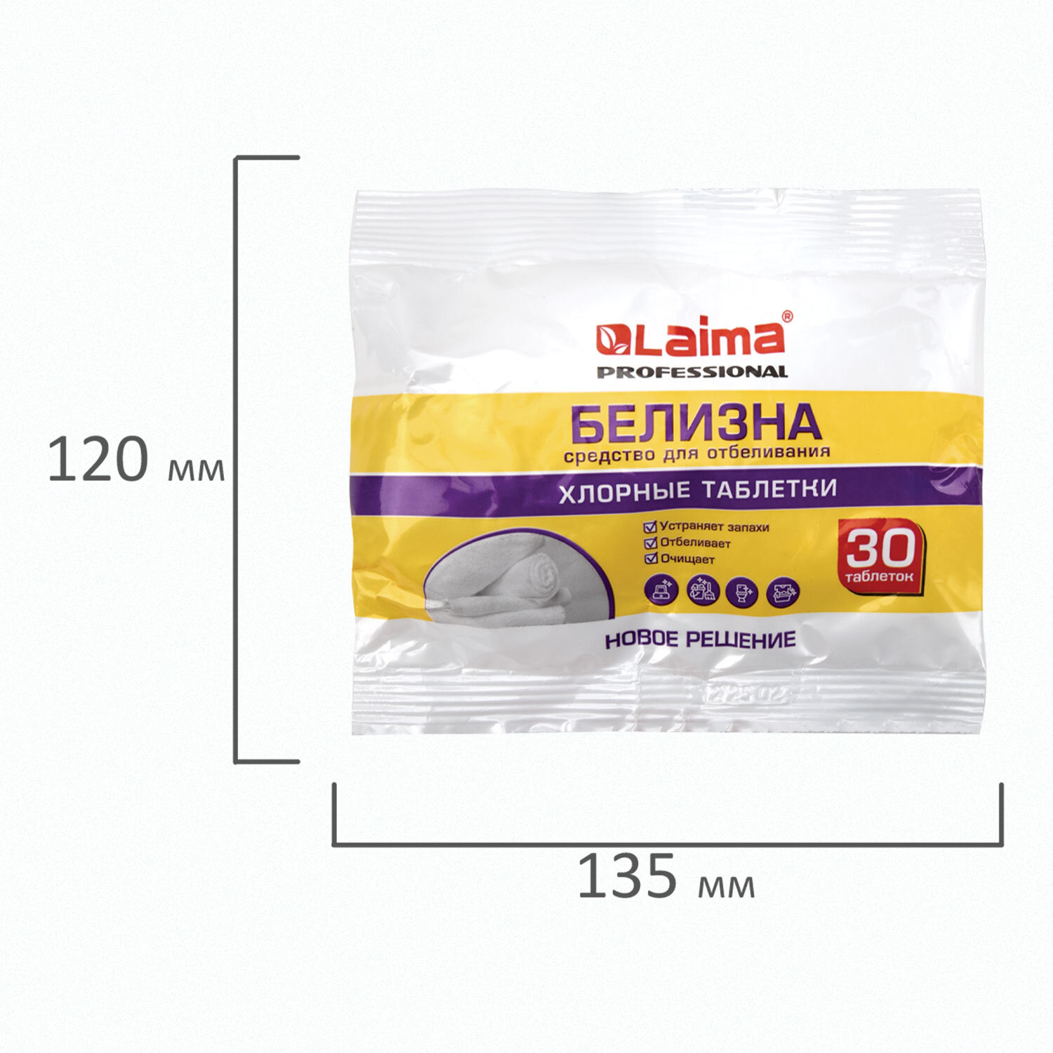 БЕЛИЗНА в хлорных таблетках для отбеливания, дезинфекции и уборки 30 шт., 0,1 кг, флоупак, LAIMA PROFESSIONAL Код товара: 609422 72,02 ₽ Купить Производитель:LAIMA Белизна в таблетках LAIMA PROFESSIONAL – это удобное средство на основе хлора. Предназначено для отбеливания, дезинфекции и уборки. Имеет широкую область применения и высокую эффективность обеззараживания. Средство представляет собой быстрорастворимые таблетки белого цвета с запахом хлора массой 3,2-3,5 г. Состав: натриевая соль дихлоризоциануровой кислоты 32,0-35,0%, адипиновая кислота, гидрокарбонат натрия (сода). Количество в упаковке – 30 таблеток. Возможно отклонение от номинального количества: ± 4,5% по ГОСТ 8.579-2002. Область применения средства: • Отбеливание ХБ и льняных тканей; • Удаление пятен, восстановление белизны на ХБ и льняных тканях; • Уборка поверхностей, удаление запахов, дезинфекция пола, стен, дверей, сантехники в помещениях (административные здания, гостиницы, общественные туалеты); • Очистка, удаление сложных загрязнений на поверхностях; • Мытье посуды в домашних условиях, в заведениях общественного питания (школьные столовые, рестораны, кафе); • Очистка резиновых, мягких и пластиковых игрушек; • Уборка транспортных средств (автобусы, трамваи, троллейбусы, такси); • Удаление запаха и очистка клеток домашних животных. • Применение в стиральных машинах. Меры предосторожности: не превышать норму таблеток при приготовлении рабочего раствора. Не использовать для окрашенных тканей! После обработки ткани обильно прополоскать! Применение в стиральных машинках возможно, если производитель допускает применение хлорсодержащих средств. Работу со средством проводить в резиновых перчатках. При попадании средства на кожу смыть его водой. При попадании в глаза промыть их под струей воды. Условия хранения: хранить отдельно от лекарственных препаратов и пищевых продуктов в вентилируемом сухом месте, недоступном детям, вдали от источников тепла и солнечного света, при температуре от -45 до +40 °С. Срок годности – 5 лет.Производство: РоссияТип средства: белизнаНазначение: универсальноеОбъем: 100 мл/гВид средства: таблеткиСерия: Белизна в таблеткахДозатор: нетВид упаковки: флоупакСрок годности: 60 месВес: 108 грРазмер упаковки: 2.6 × 13.2 × 6.2 смОбъём: 0.0002 м3Промежуточная упаковка: 30 штТранспортная упаковка: 30 штШтрих-код: 4644348861334 Файлы Сертификат-1.jpg Сертификат-2.jpg Сертификат-3.jpg Сертификат-4.jpg Сертификат-5.jpg Сертификат-6.jpg Сертификат-7.jpg Сертификат-8.jpg Сертификат-9.jpg Сертификат-10.jpg Сертификат-11.jpg Сертификат-12.jpg Сертификат-13.jpg Сертификат-14.jpg Сертификат-15.jpg Сертификат-16.jpg Сертификат-17.jpg Сертификат-18.jpg Сертификат-19.jpg Сертификат-20.jpg Сертификат-21.jpg Сертификат-22.jpg Сертификат-23.jpg Сертификат-24.jpg Сертификат-25.jpg Сертификат-26.jpg Сертификат-27.jpg