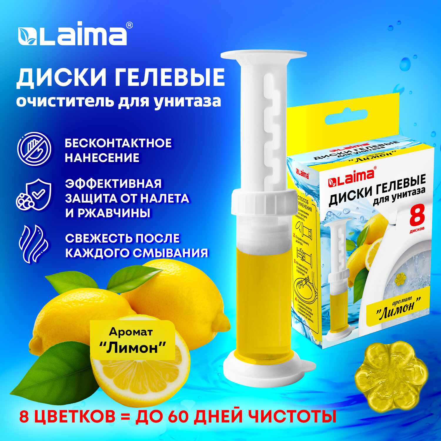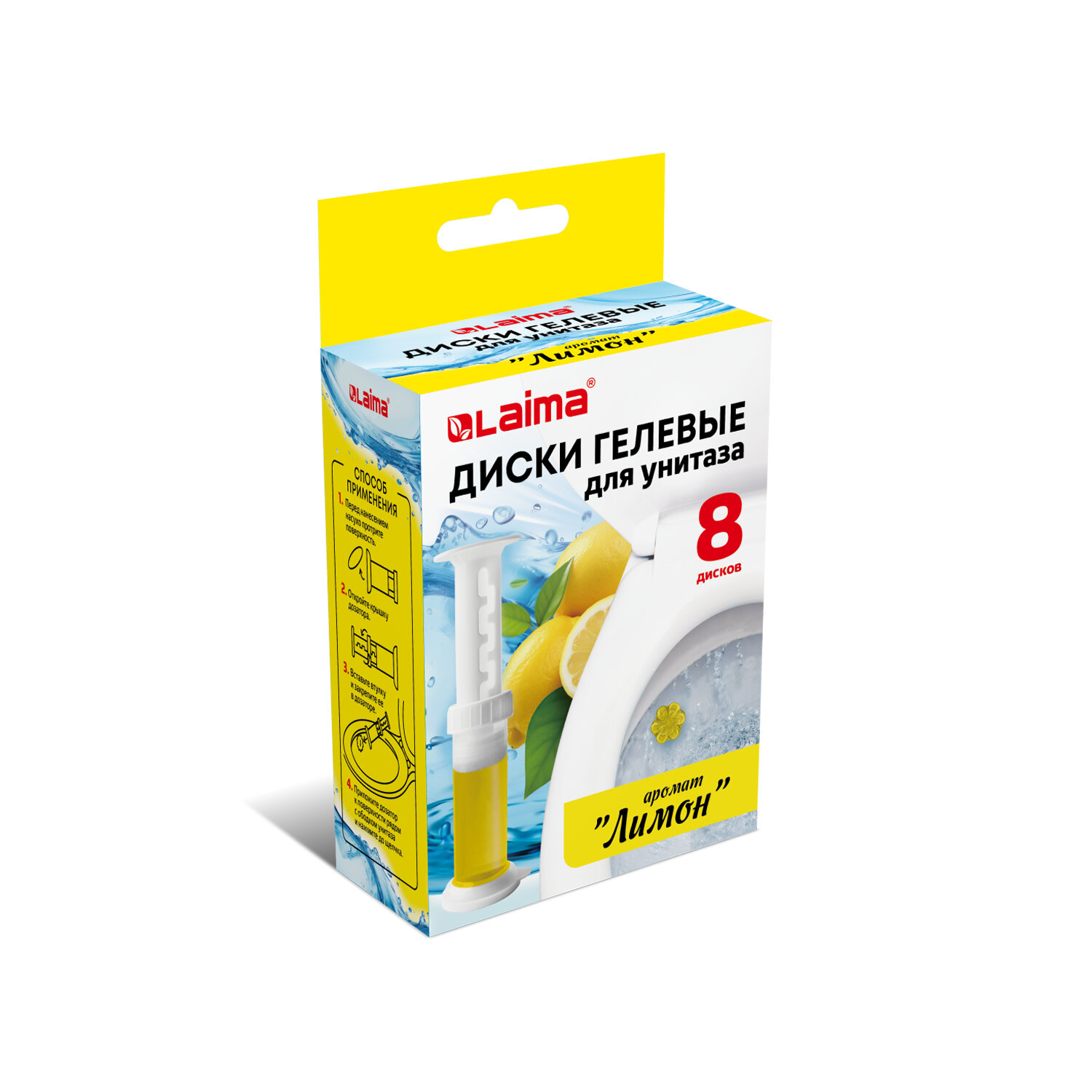 Диски гелевые, освежитель и очиститель для унитаза / писсуара, 8 дисков 44 г, LAIMA, "Лимон", шприц Код товара: 609795 100,8 ₽ Купить Производитель:LAIMA Диски гелевые для унитаза LAIMA – это инновационный формат средства для поддержания чистоты и свежести в вашем туалете. Гелевые диски LAIMA поддерживают унитаз чистым между регулярными чистками гелем. Способ применения: 1. Перед нанесением насухо протрите поверхность. 2. Откройте крышку дозатора. 3. Вставьте втулку и закрепите её в дозаторе. 4. Приложите дозатор к внутренней стороне ободка унитаза в месте, где поток воды наиболее интенсивен, и нажмите до щелчка. Состав: > 30% вода, > 30% неионогенное поверхностно-активное вещество, < 5% отдушка, глицерин. Благодаря гелевым дискам LAIMA на поверхности унитаза образуется защитный слой, препятствующий скоплению микробов.Производство: КитайТип товара: стикерОбъем: 44 мл/гФорма выпуска: гельОтдушка: ЛимонКоличество в комплекте: 8 шт.Защита до: 60 днейСерия: гелевые диски для унитазаЦвет: желтыйСрок годности: 48 месВес: 96 грРазмер упаковки: 5 × 14.4 × 8.6 смОбъём: 0.0006 м3Промежуточная упаковка: 72 штТранспортная упаковка: 72 штШтрих-код: 4606224460215 Файлы Сертификат-1.jpg Сертификат-2.jpg Сертификат-3.jpg Сертификат-4.jpg Сертификат-5.jpg Сертификат-6.jpg Сертификат-7.jpg Сертификат-8.jpg Сертификат-9.jpg Сертификат-10.jpg Сертификат-11.jpg Сертификат-12.jpg Сертификат-13.jpg Сертификат-14.jpg Сертификат-15.jpg Сертификат-16.jpg Сертификат-17.jpg Сертификат-18.jpg Сертификат-19.jpg Сертификат-20.jpg Сертификат-21.jpg Сертификат-22.jpg Сертификат-23.jpg Сертификат-24.jpg
