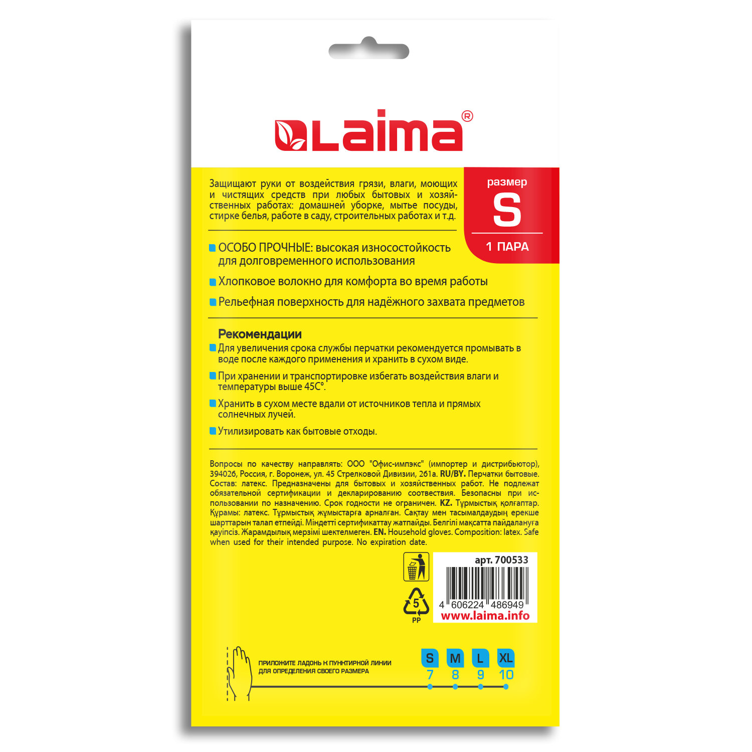 Перчатки МНОГОРАЗОВЫЕ латексные LAIMA, с ХЛОПКОВЫМ ВОЛОКНОМ, черные, размер S (малый), вес 52 г Код товара: 700533 72,2 ₽ Купить Производитель:LAIMA Универсальные латексные перчатки LAIMA защищают руки от воздействия грязи, влаги, моющих и чистящих средств при любых бытовых и хозяйственных работах: мытьё посуды, стирка белья, уборка, садоводческая работа и т.д. Особо прочные перчатки с высокой износостойкостью для долговременного использования. Изготовлены из латексного материала повышенной плотности, который защищает руки от внешних воздействий при проведении любых хозяйственно-бытовых работ. Текстура на ладони и пальцах помогает улучшить сцепление и препятствует выскальзыванию предметов из рук. Внутреннее хлопковое волокно обеспечивает комфорт во время использования перчаток, защищая руки от пота и раздражения. Перчатки пригодны для многократного использования. Нельзя использовать при работе с растворителями и электрическим током. Материал – латекс. Длина – 30 см. Цвет – черный. Упаковка – цветной пакет с европодвесом.Производство: КитайЗащита от: нетРазмер: S (малый)Размер производителя: 6-7 (S)Вид: хозяйственно-бытовыеМатериал основы: латексПокрытие внешнее: нетПодкладка: хлопковое волокноСерия: С хлопковым волокномСтепень защиты от кислот: неприменимоСтепень защиты от щелочей: неприменимоПоверхность области захвата: рельефнаяКоличество в комплекте: 1 парДлина: 300 ммТолщина: 0.3 ммЦвет: черныйВес: 56 грРазмер упаковки: 1.2 × 21.1 × 13.3 смОбъём: 0.0002 м3Промежуточная упаковка: 12 штТранспортная упаковка: 120 штШтрих-код: 4606224486949 Файлы Сертификат-1.jpg Сертификат-2.jpg Сертификат-3.jpg Сертификат-4.jpg Сертификат-5.jpg Сертификат-6.jpg Сертификат-7.jpg Сертификат-8.jpg Сертификат-9.jpg Сертификат-10.jpg Сертификат-11.jpg Сертификат-12.jpg Сертификат-13.jpg Сертификат-14.jpg Сертификат-15.jpg Сертификат-16.jpg Сертификат-17.jpg Сертификат-18.jpg Сертификат-19.jpg Сертификат-20.jpg Сертификат-21.jpg Сертификат-22.jpg Сертификат-23.jpg Сертификат-24.jpg Сертификат-25.jpg Сертификат-26.jpg