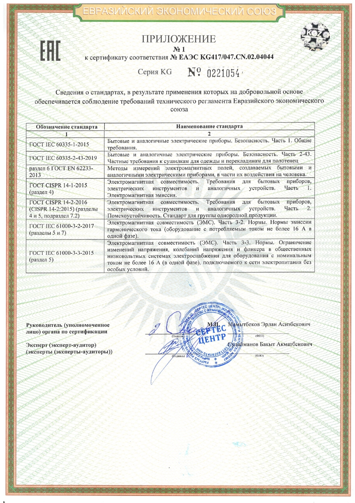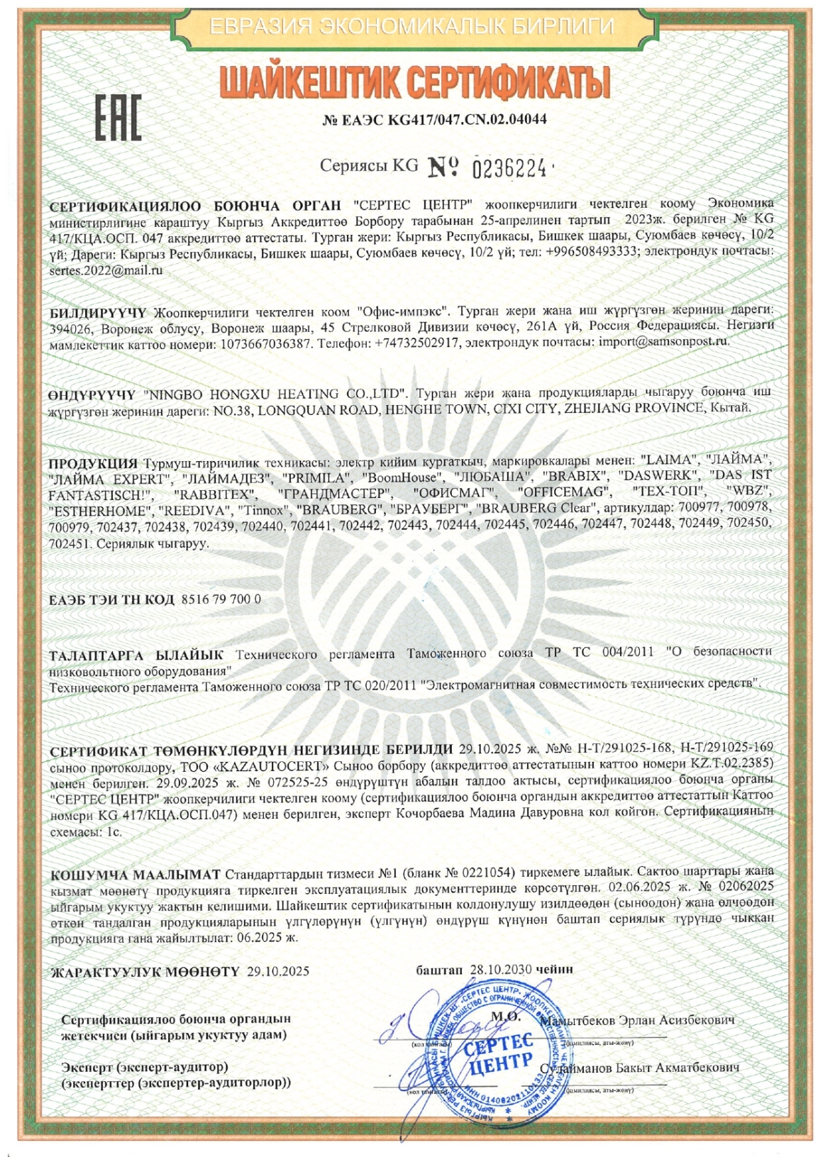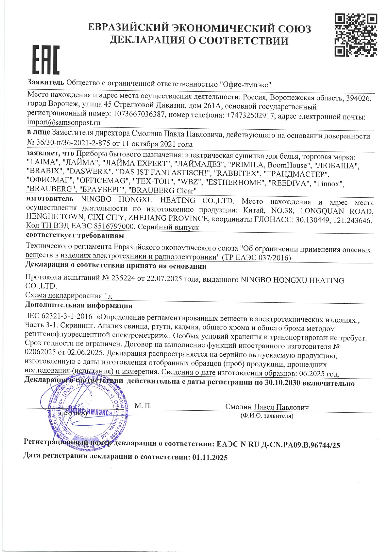 Сушилка для белья напольная, электрическая, раскладная, алюминиевая, три зоны сушки, нагрев 60 °С, LAIMA HOME Код товара: 700978 4 723,6 ₽ Купить Производитель:LAIMA Напольная электрическая сушилка для белья LAIMA HOME – ваш идеальный помощник в уходе за одеждой. Забудьте о долгом ожидании, пока ваши вещи высохнут на воздухе! Раскладная электрическая напольная сушилка для белья LAIMA HOME с нагревом 60 °C станет незаменимым атрибутом в вашем доме, обеспечивая быструю, эффективную и бережную сушку одежды в любое время года. Раскладная конструкция позволяет легко хранить сушилку, когда она не используется, а также быстро разложить ее в нужный момент. Три зоны для сушки позволяют одновременно сушить большое количество белья, включая крупные вещи, такие как простыни, пододеяльники и полотенца. Резиновые вставки на ножках обеспечивают устойчивость сушилки и предотвращают скольжение. • Технические характеристики: - Мощность – 220 Вт; - Напряжение – 220–240 В; - Частота – 50 Гц; - Вес сушилки – 2,4 кг; - Максимальная нагрузка – 10 кг; - Длина сетевого шнура – 120 см.Производство: КитайТип товара: сушилка для белья электрическаяМаксимальная нагрузка: 10 кгПолезная длина сушки: 11.5 мШирина: 148 смВысота: 90 смГлубина: 53 смОсобенности: легко складывается, удобно транспортировать, удобно хранитьСерия: HomeМатериал: алюминийВес: 3,44 кгРазмер упаковки: 7 × 109 × 53.5 смОбъём: 0.047 м3Промежуточная упаковка: 5 штТранспортная упаковка: 5 штШтрих-код: 4606224508825 Файлы Сертификат-1.jpg Сертификат-2.jpg Сертификат-3.jpg Сертификат-4.jpg Сертификат-5.jpg Сертификат-6.jpg Сертификат-7.jpg