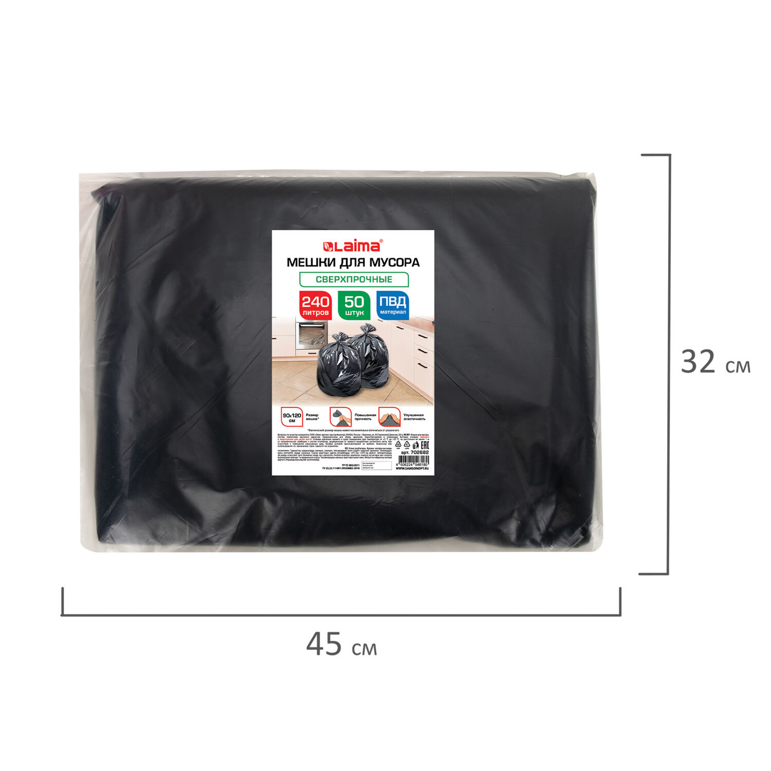 Мешки для мусора 240 л, черные, в пласте 50 штук, сверхпрочные, ПВД 80 мкм, 90x120 см, LAIMA, 702682 Код товара: 702682 1 650,38 ₽ Купить Производитель:LAIMA Мешки для мусора LAIMA в рулоне предназначены для сбора, хранения, транспортировки и утилизации бытовых отходов. Широко используются в офисах, дома, в строительной, медицинской сфере, супермаркетах или на улице, в специальных урнах для мусора. Изготовлены из полиэтилена высокого давления (ПВД) плотностью 80 микрон и имеют объем 240 литров. Размер мешка – 90х120 см (±5%). Поставляются в пачке по 50 штук. Преимуществами данных мешков для мусора являются: устойчивость к разрыву, повышенная прочность и грузоподъемность.Производство: РоссияОбъем: 240 лЦвет: черныйПрочность: повышеннаяКоличество в комплекте: 50 шт.Материал: ПВДТолщина полиэтилена: 80 мкмТип дна: прямоеТип упаковки: пачкаСоответствует требованиям ГОСТа: нетШирина: 90 смДлина: 120 смВес: 6,14 кгРазмер упаковки: 7.8 × 45.6 × 33.8 смОбъём: 0.012 м3Промежуточная упаковка: 1 штТранспортная упаковка: 1 штШтрих-код: 4606224548180 Файлы Сертификат-1.jpg Сертификат-2.jpg Сертификат-3.jpg