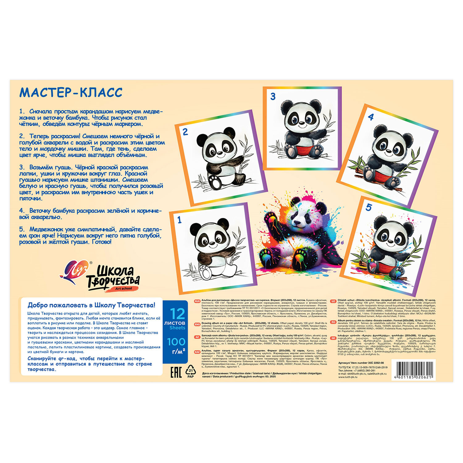 Альбом для рисования, А4, 12 листов, скоба, ЛУЧ "Школа творчества", 203х288мм, "Панда" Код товара: 107787 50 ₽ Купить Производитель:ЛУЧ Альбом ЛУЧ "Школа творчества" для рисования предназначен как для различных красок на водной основе, так и для карандашей, фломастеров, ручек, угля, сухой и масляной пастели и для других сухих материалов. Содержит 40 листов плотностью 100 г/м2 формата А4 (288х203 мм). Красочная обложка выполнена из мелованного картона. Скрепление листов осуществляется с помощью скрепки. Подходит для смешанных техник рисования: красками, карандашами и фломастерами, ручками, углем, сухой и масляной пастелью и для других сухих материалов.Производство: РоссияКоличество листов: 40Формат: А4Обложка: мелованный картонТип спецэффектов на обложке: нетТип товара: альбом для рисованияДизайн: ПандаТип скрепления: скобаПлотность бумаги: 100 г/м2Пол ребенка: для всехКоличество дизайнов в минимальной упаковке: 1 шт.Количество дизайнов в транспортной упаковке: 1 шт.Вес: 92 грРазмер упаковки: 0.2 × 20.3 × 28.8 смОбъём: 0.0001 м3Промежуточная упаковка: 40 штТранспортная упаковка: 120 штШтрих-код: 4601185020621