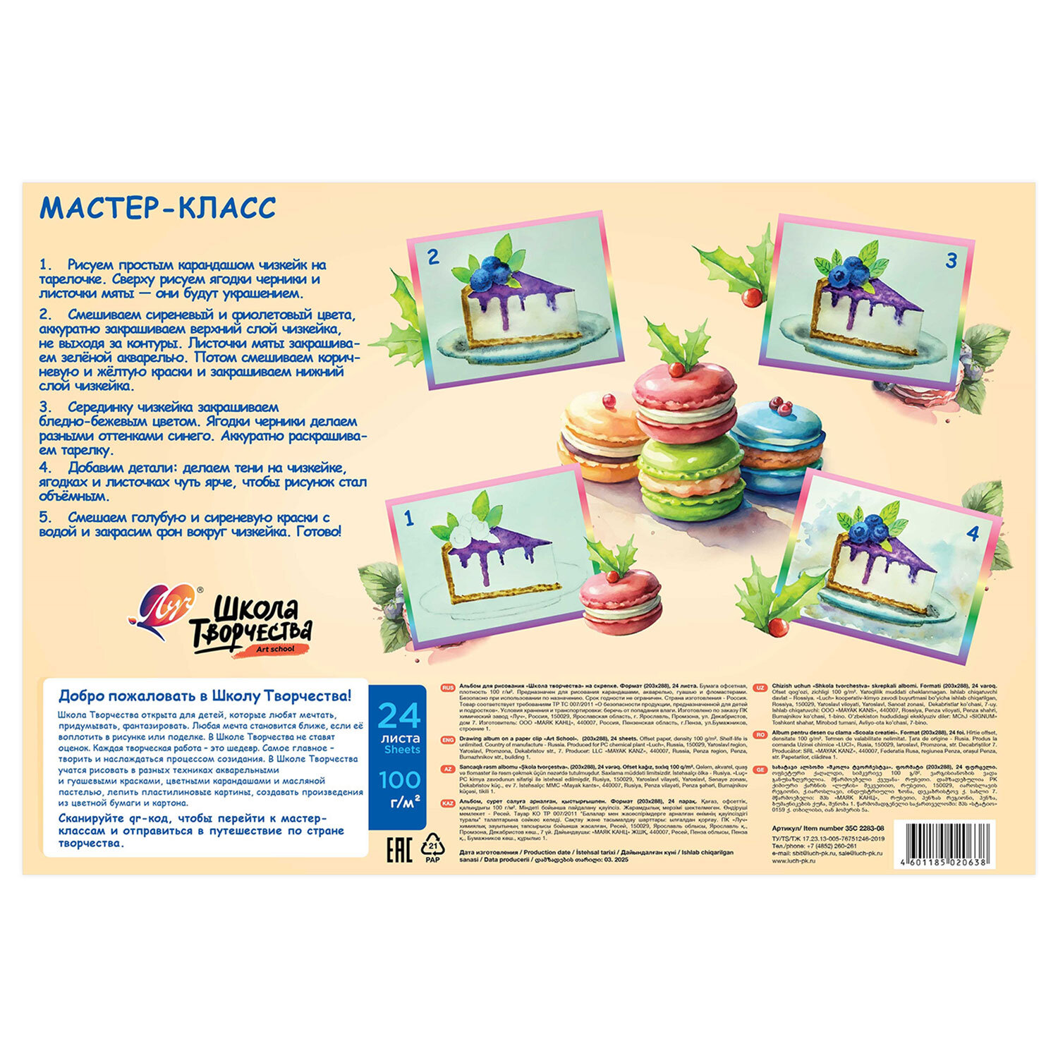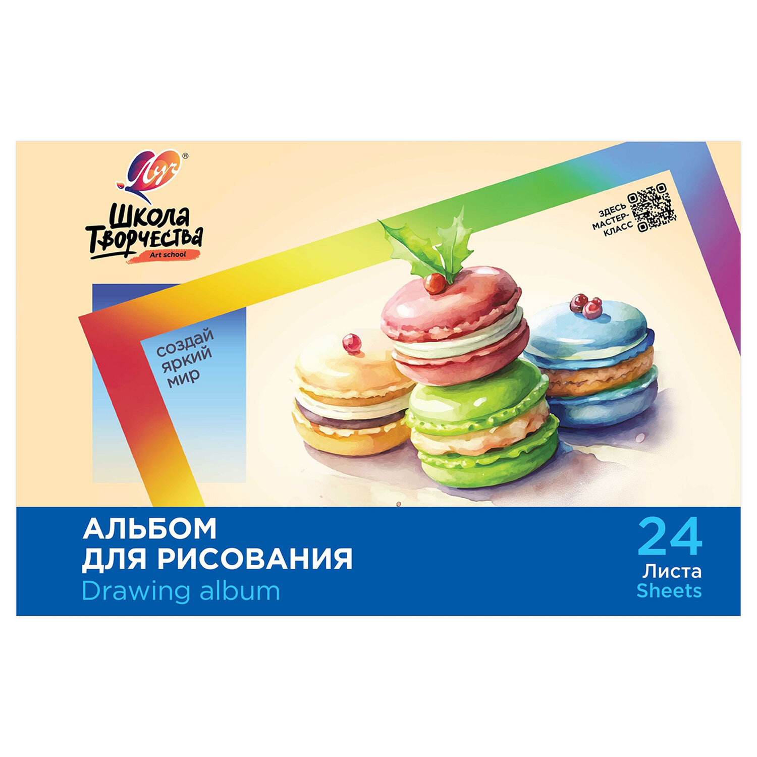 Альбом для рисования, А4, 24 листа, скоба, ЛУЧ "Школа творчества", 203х288мм, "Макаронс" Код товара: 107789 85 ₽ Купить Производитель:ЛУЧ Альбом ЛУЧ "Школа творчества" для рисования предназначен как для различных красок на водной основе, так и для карандашей, фломастеров, ручек, угля, сухой и масляной пастели и для других сухих материалов. Содержит 40 листов плотностью 100 г/м2 формата А4 (288х203 мм). Красочная обложка выполнена из мелованного картона. Скрепление листов осуществляется с помощью скрепки. Подходит для смешанных техник рисования: красками, карандашами и фломастерами, ручками, углем, сухой и масляной пастелью и для других сухих материалов.Производство: РоссияКоличество листов: 40Формат: А4Обложка: мелованный картонТип спецэффектов на обложке: нетТип товара: альбом для акварелиДизайн: МакаронсТип скрепления: скобаПлотность бумаги: 100 г/м2Пол ребенка: для всехКоличество дизайнов в минимальной упаковке: 1 шт.Количество дизайнов в транспортной упаковке: 1 шт.Вес: 166 грРазмер упаковки: 0.4 × 20.3 × 28.8 смОбъём: 0.0002 м3Промежуточная упаковка: 70 штТранспортная упаковка: 70 штШтрих-код: 4601185020638