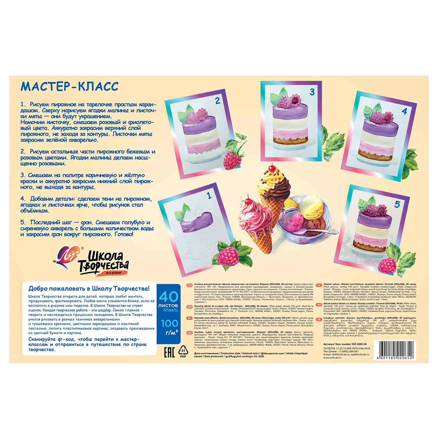 Альбом для рисования, А4, 40 листов, скоба, ЛУЧ "Школа творчества",203х288мм,"Мороженое" Код товара: 107791 124 ₽ Купить Производитель:ЛУЧ Альбом ЛУЧ "Школа творчества" для рисования предназначен как для различных красок на водной основе, так и для карандашей, фломастеров, ручек, угля, сухой и масляной пастели и для других сухих материалов. Содержит 40 листов плотностью 100 г/м2 формата А4 (288х203 мм). Красочная обложка выполнена из мелованного картона. Скрепление листов осуществляется с помощью скрепки. Подходит для смешанных техник рисования: красками, карандашами и фломастерами, ручками, углем, сухой и масляной пастелью и для других сухих материалов.Производство: РоссияКоличество листов: 40Формат: А4Обложка: мелованный картонТип спецэффектов на обложке: нетТип товара: альбом для рисованияДизайн: МороженоеТип скрепления: скобаПлотность бумаги: 100 г/м2Пол ребенка: для всехКоличество дизайнов в минимальной упаковке: 1 шт.Количество дизайнов в транспортной упаковке: 1 шт.Вес: 260 грРазмер упаковки: 0.7 × 20.3 × 28.8 смОбъём: 0.0004 м3Промежуточная упаковка: 35 штТранспортная упаковка: 35 штШтрих-код: 4601185020652