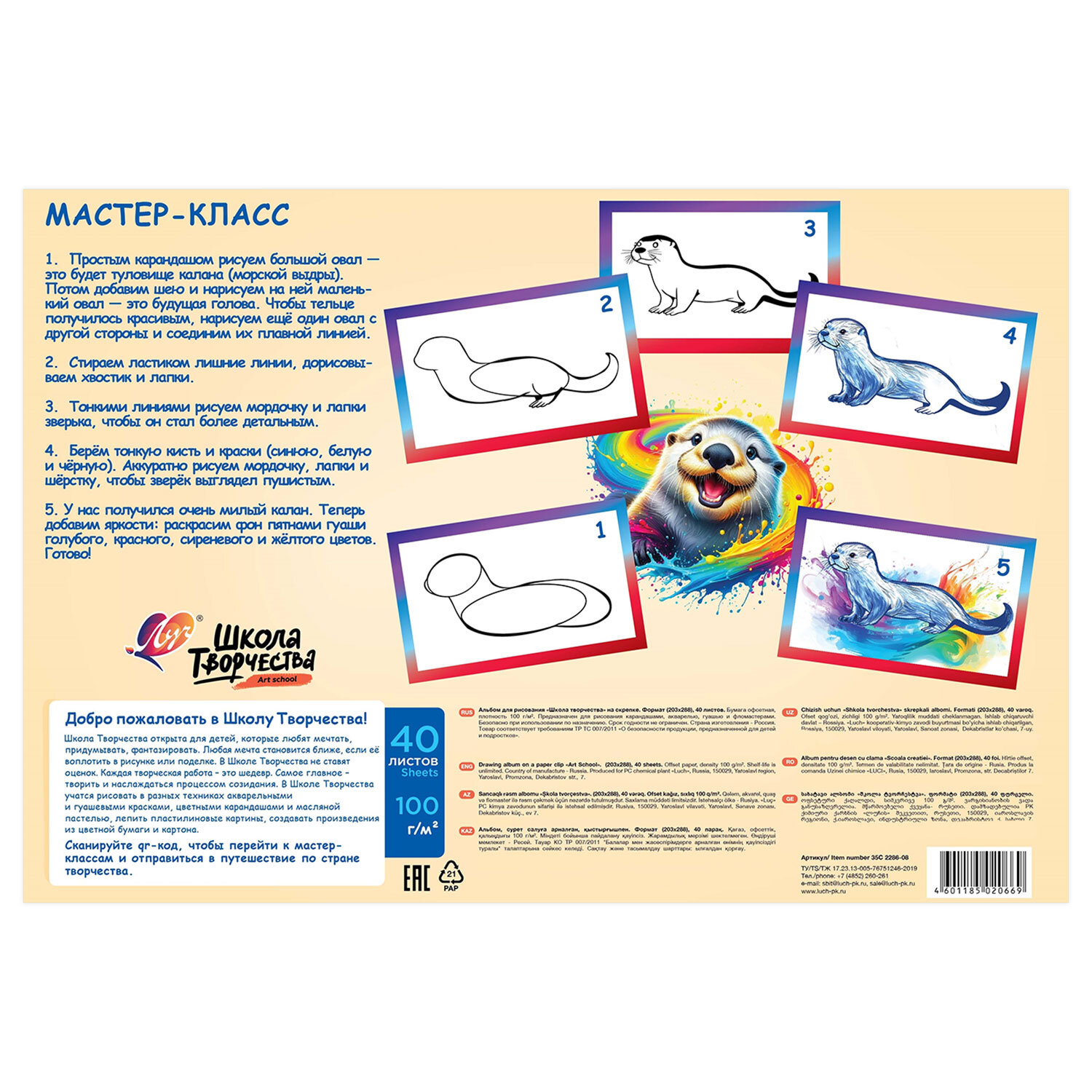Альбом для рисования, А4, 40 листов, скоба, ЛУЧ "Школа творчества", 203х288 мм, "Калан" Код товара: 107792 124 ₽ Купить Производитель:ЛУЧ Альбом ЛУЧ "Школа творчества" для рисования предназначен как для различных красок на водной основе, так и для карандашей, фломастеров, ручек, угля, сухой и масляной пастели и для других сухих материалов. Содержит 40 листов плотностью 100 г/м2 формата А4 (288х203 мм). Красочная обложка выполнена из мелованного картона. Скрепление листов осуществляется с помощью скрепки. Подходит для смешанных техник рисования: красками, карандашами и фломастерами, ручками, углем, сухой и масляной пастелью и для других сухих материалов.Производство: РоссияКоличество листов: 40Формат: А4Обложка: мелованный картонТип спецэффектов на обложке: нетТип товара: альбом для рисованияДизайн: КаланТип скрепления: скобаПлотность бумаги: 100 г/м2Пол ребенка: для всехКоличество дизайнов в минимальной упаковке: 1 шт.Количество дизайнов в транспортной упаковке: 1 шт.Вес: 262 грРазмер упаковки: 0.5 × 28.7 × 20.4 смОбъём: 0.0004 м3Промежуточная упаковка: 35 штТранспортная упаковка: 35 штШтрих-код: 4601185020669 Файлы Сертификат-1.jpg Сертификат-2.jpg Сертификат-3.jpg