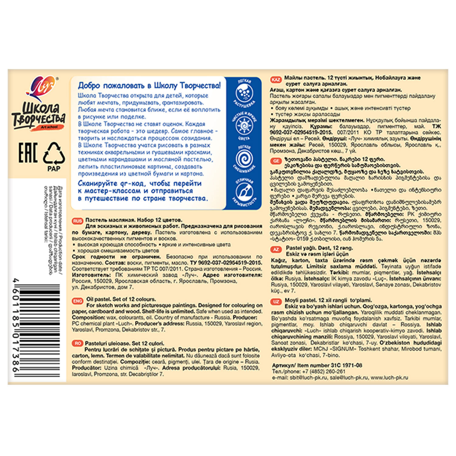 Пастель масляная ЛУЧ "Школа творчества", 12 цветов, трехгранная, картонная упаковка Код товара: 182193 209 ₽ Купить Производитель:ЛУЧ Пастель масляная Луч «Школа творчества» идеально подходит для уроков рисования. При использовании дает глубокий насыщенный цвет и красивую фактуру. Подходит для рисования, скетчинга, смешанных техник и декоративных работ. Пастель масляная идеально подходит для уроков рисования. При использовании дает глубокий насыщенный цвет и красивую фактуру. Высокая концентрация пигментов обеспечивает интенсивные оттенки и стойкость рисунка, легко наносится на бумагу, картон и другие поверхности, позволяет смешивать цвета и создавать плавные переходы. Подходит для рисования, скетчинга, смешанных техник и декоративных работ. Каждый мелок пастели защищен бумажной оберткой для удобства использования и чистоты рук.Производство: РоссияКоличество цветов: 12Серия: Школа творчестваТип пастели: маслянаяОсобенности: яркие цветаСечение: трехгранноеДиаметр: 9 ммБумажная манжетка: даОснова: маслянаяУпаковка: картонная коробкаВес: 119 грРазмер упаковки: 1.8 × 16.2 × 11.2 смОбъём: 0.0004 м3Промежуточная упаковка: 24 штТранспортная упаковка: 24 штШтрих-код: 4601185017386