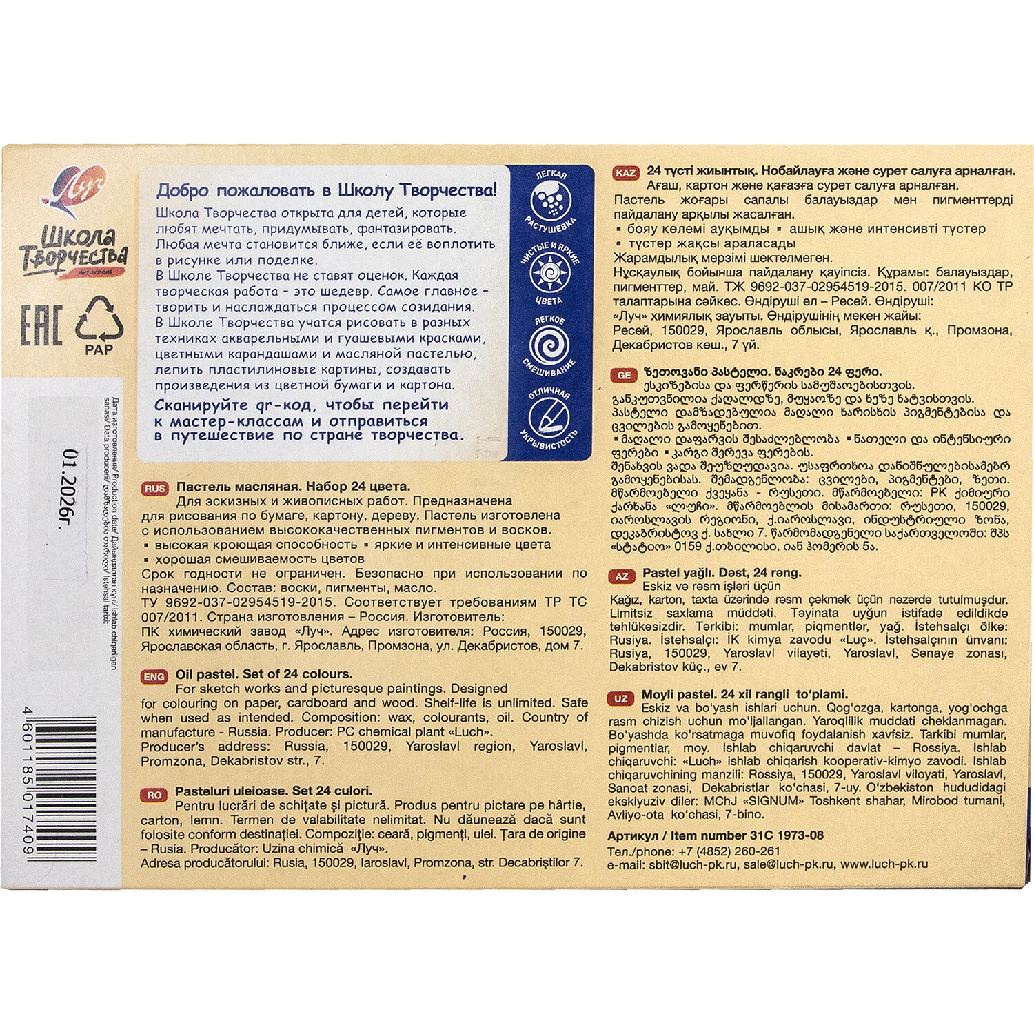 Пастель масляная ЛУЧ "Школа творчества", 24 цветов, трехгранная, картонная упаковка Код товара: 182195 320 ₽ Купить Производитель:ЛУЧ Пастель масляная Луч «Школа творчества» идеально подходит для уроков рисования. При использовании дает глубокий насыщенный цвет и красивую фактуру. Подходит для рисования, скетчинга, смешанных техник и декоративных работ. Пастель масляная идеально подходит для уроков рисования. При использовании дает глубокий насыщенный цвет и красивую фактуру. Высокая концентрация пигментов обеспечивает интенсивные оттенки и стойкость рисунка, легко наносится на бумагу, картон и другие поверхности, позволяет смешивать цвета и создавать плавные переходы. Подходит для рисования, скетчинга, смешанных техник и декоративных работ. Каждый мелок пастели защищен бумажной оберткой для удобства использования и чистоты рук.Производство: РоссияКоличество цветов: 24Серия: Школа творчестваТип пастели: маслянаяОсобенности: яркие цветаСечение: трехгранноеДиаметр: 9 ммБумажная манжетка: даОснова: маслянаяУпаковка: картонная коробкаВес: 233 грРазмер упаковки: 1.9 × 22.6 × 16.4 смОбъём: 0.0008 м3Промежуточная упаковка: 12 штТранспортная упаковка: 12 штШтрих-код: 4601185017409