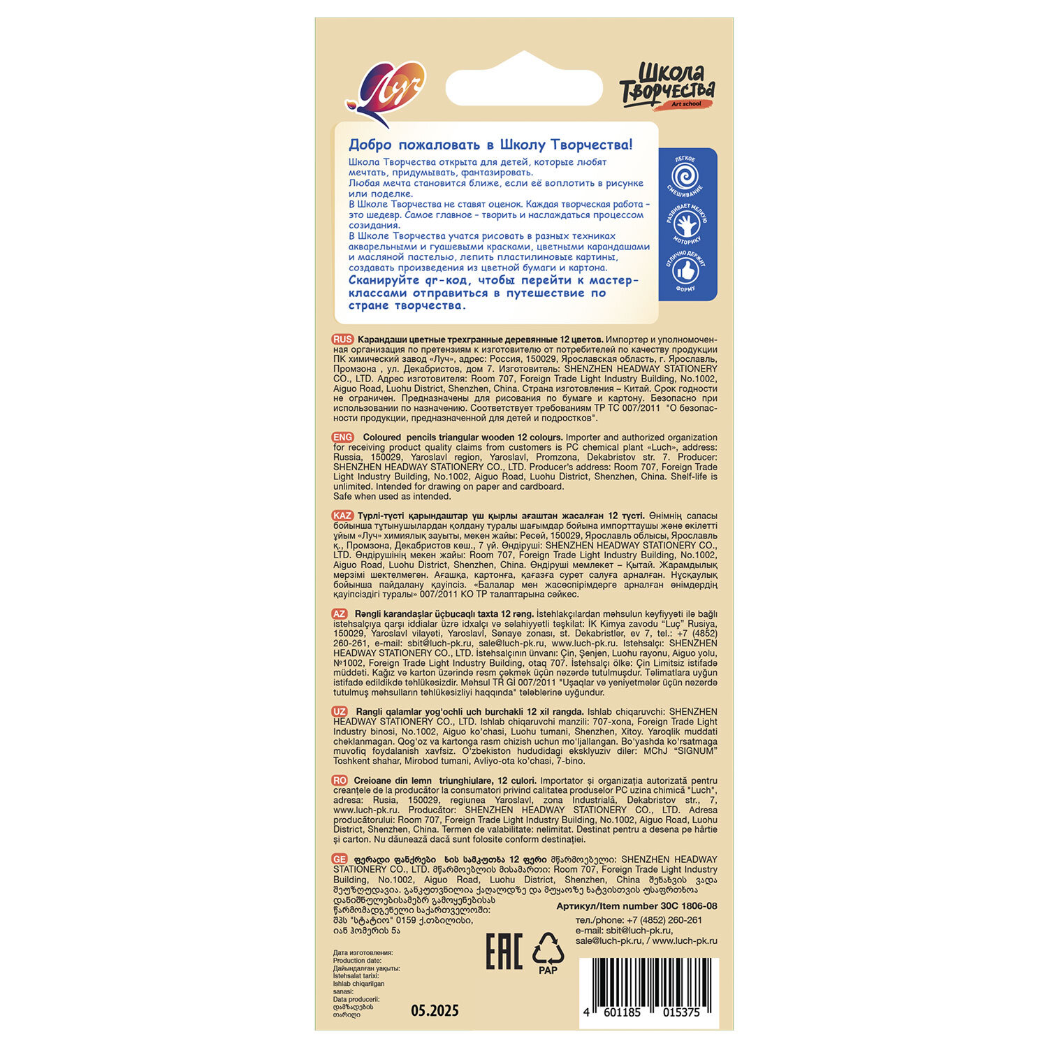 Карандаши цветные ЛУЧ "Школа Творчества", 12 цветов, трехгранные, натуральное дерево Код товара: 182197 205 ₽ Купить Производитель:ЛУЧ Цветные карандаши ЛУЧ "Школа Творчества" имеют яркие, чистые цвета. Эргономичная трёхгранная форма снижает усталость и обеспечивает максимальный комфорт при использовании. Цветные карандаши ЛУЧ "Школа Творчества" имеют яркие, чистые цвета. Корпус карандаша изготовлен из мягкой древесины. Эргономичная трёхгранная форма снижает усталость и обеспечивает максимальный комфорт при использовании.Производство: КитайКоличество цветов: 12 шт.Количество карандашей: 12 шт.Серия: Школа творчестваФорма сечения корпуса: трехграннаяМатериал корпуса: деревоЛакированный корпус: даГрифель повышенной прочности: даЗаточка грифеля: даЛегко затачиваются: даДиаметр грифеля: 3.2 ммДлина карандаша: 175 ммУпаковка: картонная коробка c европодвесомВес: 72 грРазмер упаковки: 0.8 × 8.6 × 20.8 смОбъём: 0.0002 м3Промежуточная упаковка: 12 штТранспортная упаковка: 48 штШтрих-код: 4601185015375