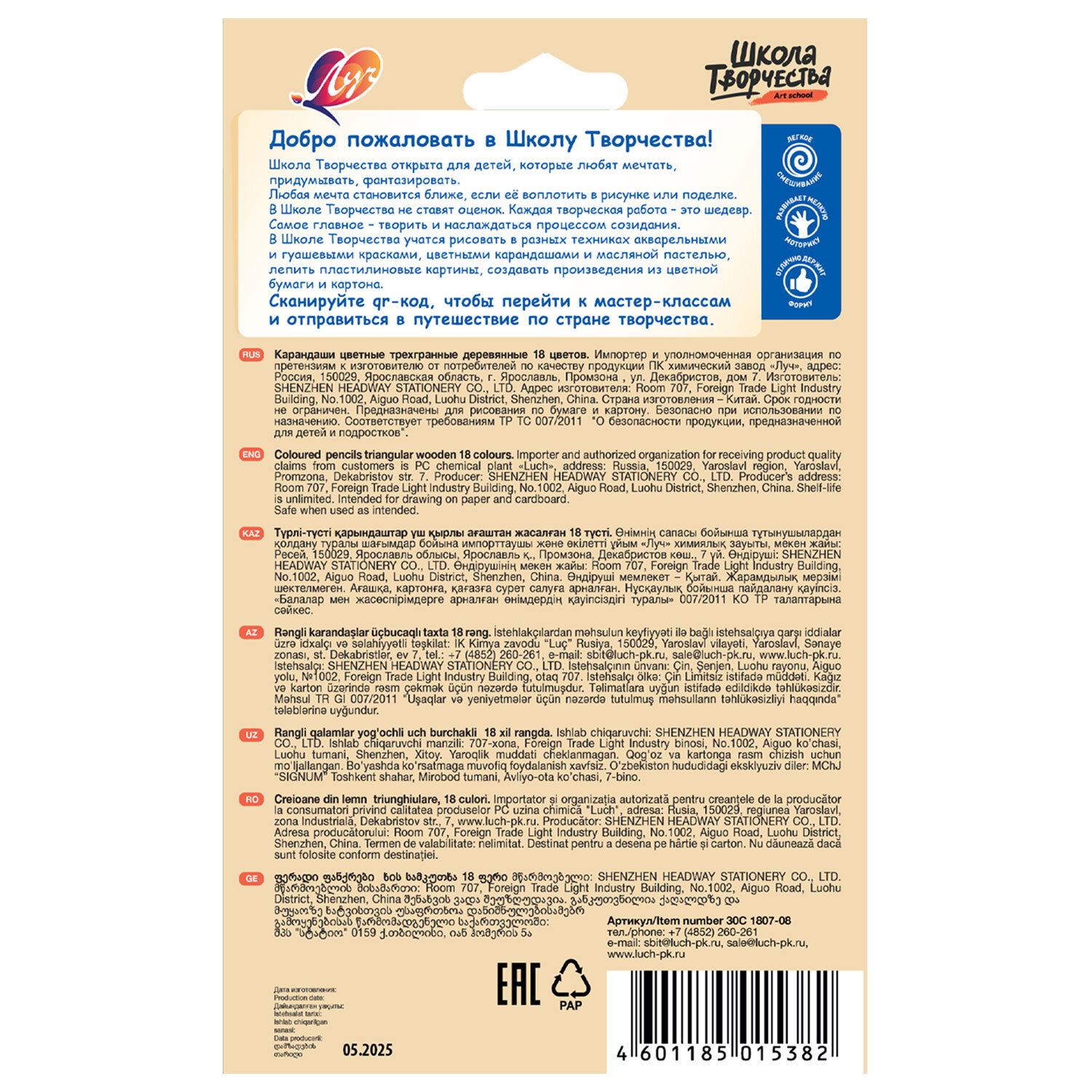 Карандаши цветные ЛУЧ "Школа Творчества", 18 цветов, трехгранные, натуральное дерево Код товара: 182198 294 ₽ Купить Производитель:ЛУЧ Цветные карандаши ЛУЧ "Школа Творчества" имеют яркие, чистые цвета. Эргономичная трёхгранная форма снижает усталость и обеспечивает максимальный комфорт при использовании. Цветные карандаши ЛУЧ "Школа Творчества" имеют яркие, чистые цвета. Корпус карандаша изготовлен из мягкой древесины. Эргономичная трёхгранная форма снижает усталость и обеспечивает максимальный комфорт при использовании.Производство: КитайКоличество цветов: 18 шт.Количество карандашей: 18 шт.Серия: Школа творчестваФорма сечения корпуса: трехграннаяМатериал корпуса: деревоЛакированный корпус: даГрифель повышенной прочности: даЗаточка грифеля: даЛегко затачиваются: даДиаметр грифеля: 3.2 ммДлина карандаша: 175 ммУпаковка: картонная коробка c европодвесомВес: 100 грРазмер упаковки: 0.8 × 12.8 × 20.8 смОбъём: 0.0005 м3Промежуточная упаковка: 12 штТранспортная упаковка: 48 штШтрих-код: 4601185015382