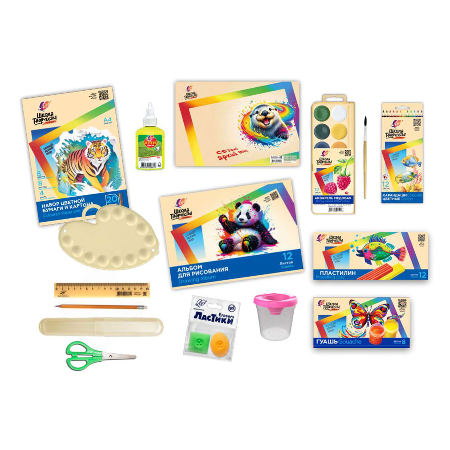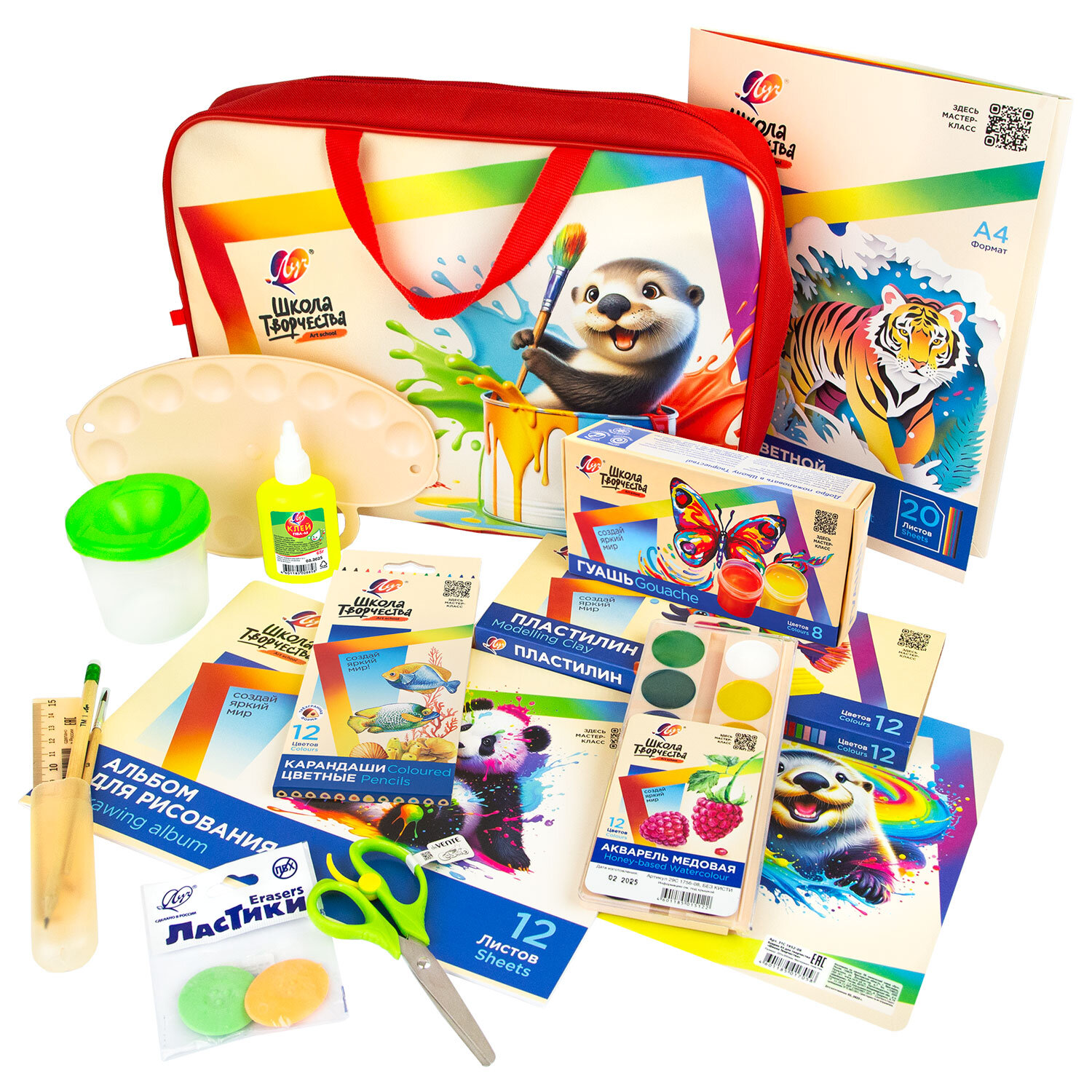 Набор для творчества ЛУЧ "Школа творчества", 15 предметов Код товара: 664691 1 995 ₽ Купить Производитель:ЛУЧ Подарочный набор для творчества ЛУЧ "Школа творчества" состоит из различных канцелярских товаров, которые упакованы в удобную для переноски красочную папку на молнии с двумя ручками. Все они включены в обязательный список покупок к школе. В наборе 17 предметов: 1. Папка А4 «Школа творчества», ткань, с ручками 2. Альбом для рисования, 12 листов 3. Набор картона и цветной бумаги А4, 20 листов 4. Палитра № 5, бежевая 5. Гуашь, 8 цветов, 20 мл 6. Акварель 12 цветов без кисти 7. Пластилин 12 цветов 8. Клей ПВА-М 65 г 9. Коврик А4 для творчества 10. Ножницы детские 13 см с линейкой 11. Карандаши цветные трехгранные 12 цветов 12. Пенал бежевый 13. Линейка 15 см пастельная 14. Карандаш чернографитный с ластиком 15. Кисть № 3 16. Набор ластиков (геометрические фигуры) 17. Стакан-непроливайкаПроизводство: РоссияТип товара: набор материалов для творчестваКоличество предметов: 17 шт.Пол ребенка: универсальныйДлина: 27 смШирина: 36 смГлубина: 8 смМатериал упаковки: ПолиэстерПодарочная упаковка: даВес: 1,72 кгРазмер упаковки: 11.8 × 36.7 × 28.5 смОбъём: 0.0123 м3Промежуточная упаковка: 1 штТранспортная упаковка: 1 штШтрих-код: 4601185017416 Сертификат-1.jpg Сертификат-2.jpg