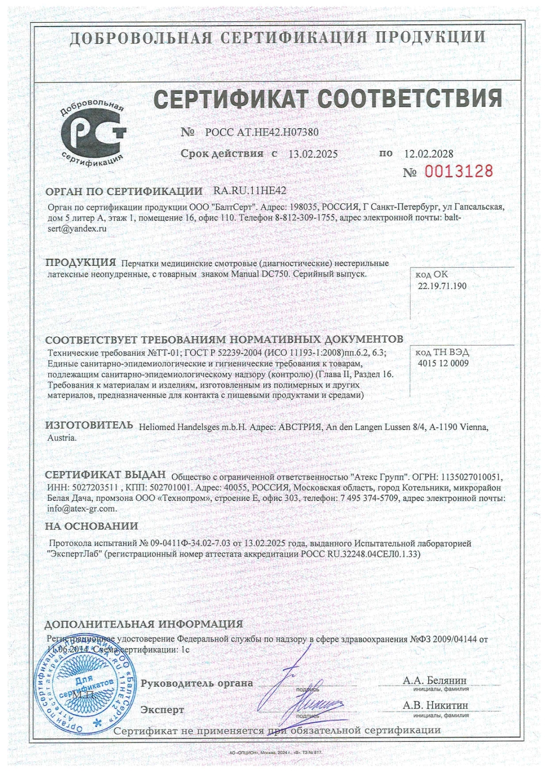 Перчатки латексные смотровые MANUAL DC750, Австрия, 50 пар (100 шт.), размер S (малый), белые Код товара: 631732 914,76 ₽ Купить Производитель:Manual Высококачественные латексные неопудренные перчатки MANUAL DC750 устойчивы к механическим повреждениям, подтверждена их вирусопроницаемость и химическая устойчивость. Без опудривания и добавления красителей для профилактики контактного дерматита. Текстурированная поверхность в области пальцев и ладони обеспечивает отличный захват инструментария. Эластичные, с хорошей тактильной чувствительностью, комфортные. Технология обработки поверхности (двойная хлоринация) обеспечивает легкость смены и надевания перчаток, комфорт в процессе использования. Сертифицированы для контакта с пищей. Надежность перчатки подтверждена тестами на вирусопроницаемость, химическую устойчивость и механическую прочность в соответствии с европейскими стандартами. Правила применения: • Предназначены для использования в качестве средства индивидуальной защиты рук. • Одноразовые. • Недопустимо использование при нарушении целостности перчаток. • Недопустимо использование перчаток несоответствующего размера. • Не рекомендуется длительное (более 2 часов) ношение перчаток. • При частом и длительном ношении перчаток рекомендуется соответствующий уход за кожей рук. Предупреждения: • Данные изделия изготовлены из натурального латекса, который может вызвать аллергические реакции у отдельных лиц. При наличии аллергии на натуральный латекс необходимо использовать перчатки из синтетических материалов. • Возможна индивидуальная непереносимость материалов. • При появлении раздражения кожи прекратите использовать перчатки и обратитесь за консультацией к врачу. • Возможно проявление дерматитов и иных кожных раздражений как следствие неправильного ухода за кожей рук и жестких условий изоляции кожи рук от естественной вентиляции воздухом. • Не обеспечивают гарантированной защиты от проколов и порезов. Условия хранения: Хранить в сухом месте при температуре от +5 до +30 °С. Избегать воздействия горюче-смазочных материалов и растворителей, озона и прямого солнечного света. Размер, номер партии и срок годности указаны на упаковке. Зарегистрированы Федеральной службой по надзору в сфере здравоохранения. Сертифицированы для контакта с пищевыми продуктами и средами. ГОСТ Р 52239-2004.Производство: АвстрияМатериал: латексРазмер перчаток: 6-7 (S)Серия: MANUAL DC750Тип: смотровыеНеопудренные: даТип поверхности: текстурированныеПовышенная чувствительность: даХлоринация: даФорма: плоскаяСоответствует требованиям ГОСТа: ГОСТ Р 52239-2004Количество в комплекте: 50 парШирина ладони: 81 ммЦвет: белыйВид упаковки: картонная коробкаВес: 779 грРазмер упаковки: 7.4 × 23.9 × 12.6 смОбъём: 0.0025 м3Промежуточная упаковка: 10 штТранспортная упаковка: 10 штШтрих-код: 9120029756625 Файлы Сертификат-1.jpg Сертификат-2.jpg Сертификат-3.jpg