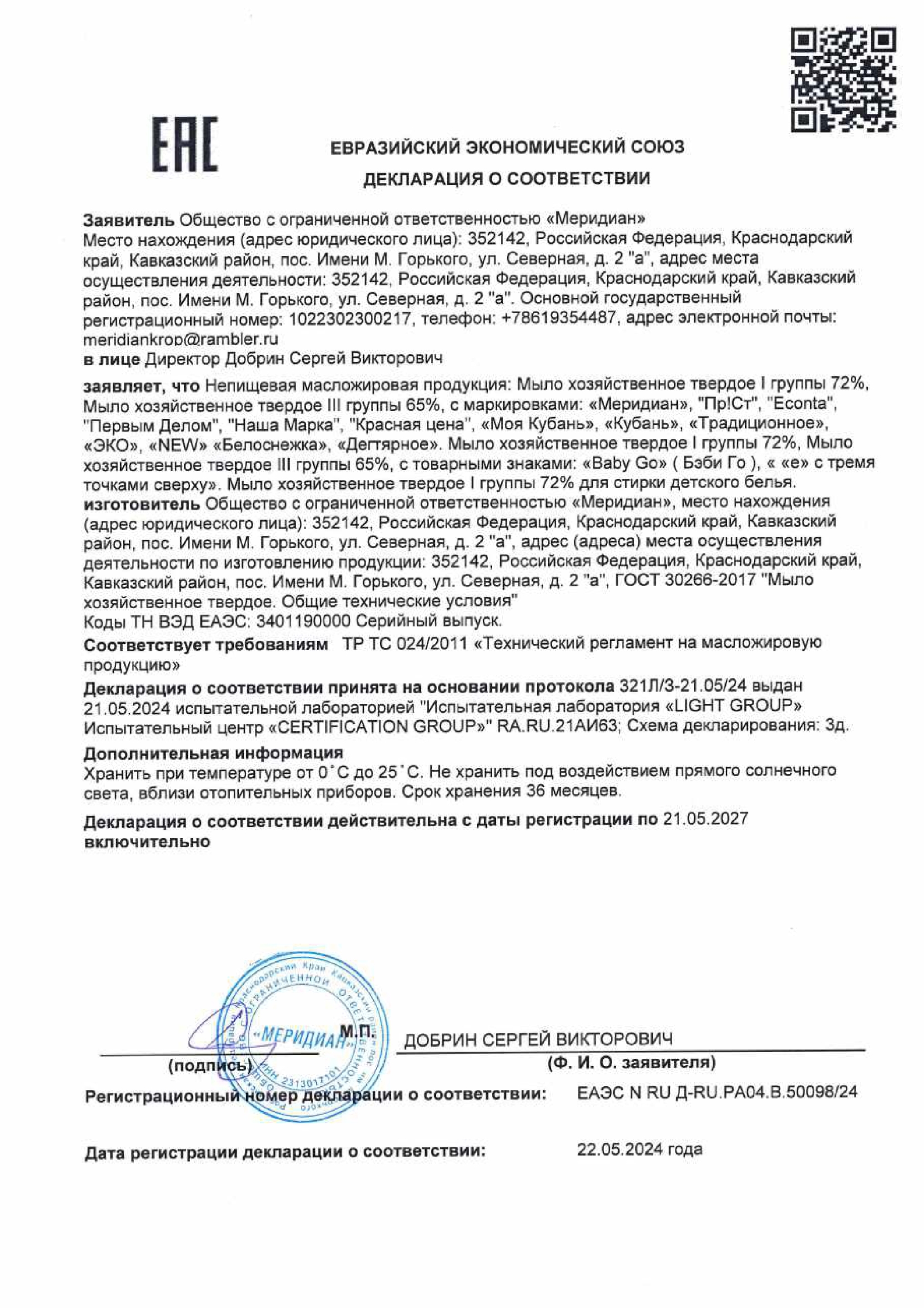 Мыло хозяйственное 72% 300 г (Меридиан), без упаковки, МИНПРОМТОРГ Код товара: 702587 64,26 ₽ Купить Производитель:МЕРИДИАН Хозяйственное мыло является выгодной альтернативой другим моющим средствам, производится из натурального природного сырья и предназначено для санитарно-гигиенических и хозяйственных целей: мытья рук, посуды, стирки в горячей и холодной воде. Состав: натриевые соли жирных кислот натуральных жиров и масел, вода, глицерин, хлорид натрия, антиоксидант.Производство: РоссияВес: 300 гОтдушка: отсутствуетСерия: ХозяйственноеКоличество в упаковке: 1 шт.Назначение: для мытья посуды, для мытья рук, для стиркиЭффект от использования: антибактериальный, отбеливание, против пятенСодержание жирных кислот: 72 %С глицерином: даОбласть применения: бытовое использованиеТовар относится к сегменту ЭКОНОМ: даСоответствует требованиям ГОСТа: ГОСТ 30266-2017Вид упаковки: нетСрок годности: 36 месРазмер упаковки: 4.7 × 9.6 × 6.6 смОбъём: 0.0004 м3Промежуточная упаковка: 36 штТранспортная упаковка: 36 шт Файлы Сертификат-1.jpg Сертификат-2.jpg Сертификат-3.jpg Сертификат-4.jpg