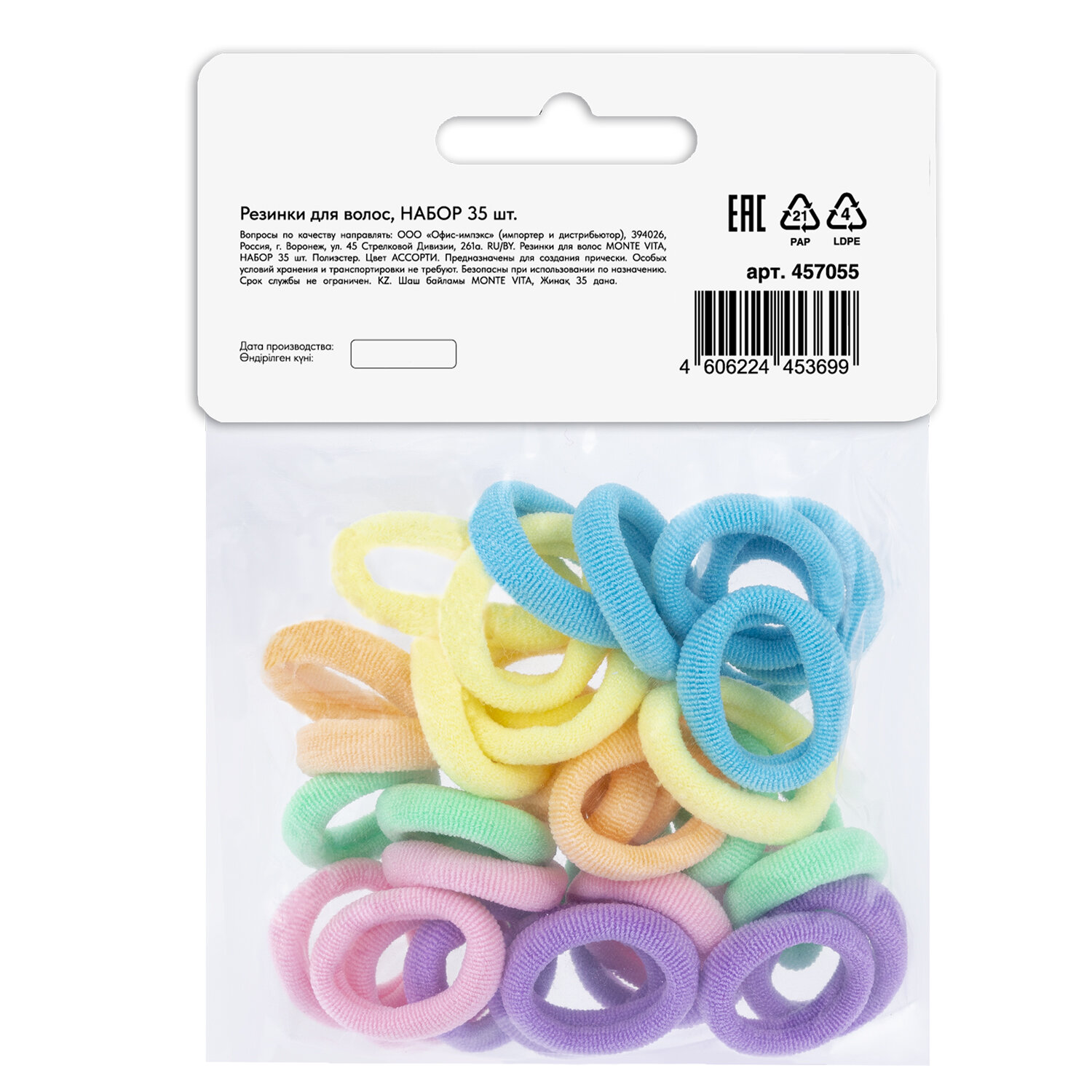 Резинки для волос НАБОР 35 шт., мягкие, маленькие, разные цвета, MONTE VITA (МОНТЕ ВИТА), 457055 Код товара: 457055 88,27 ₽ Купить Производитель:MONTE VITA Резинки для волос MONTE VITA – идеальное решение для создания прически. Резинки помогают поддерживать волосы в аккуратном состоянии, придают прическе законченный вид. 35 резинок в пастельных и ярких оттенках. Мягкий полиэстер не травмирует волосы, а компактный размер (2 см) позволяет создавать аккуратные пучки и хвосты. Резинки обеспечивают надежную фиксацию, удобно снимаются, не цепляют и не рвут волосы.Производство: КитайТип товара: резинка для волосТип резинки: мягкиеЦвет: ассортиДекор: нетНабор: даКоличество в наборе: 35 шт.Размер: 2 смМатериал: полиэстерСерия: -Упаковка: пакет с картонным европодвесомВес: 13 грРазмер упаковки: 2 × 6.8 × 7.9 смОбъём: 0.0001 м3Промежуточная упаковка: 12 штТранспортная упаковка: 240 штШтрих-код: 4606224453699 Файлы Сертификат-1.jpg Сертификат-2.jpg Сертификат-3.jpg Сертификат-4.jpg
