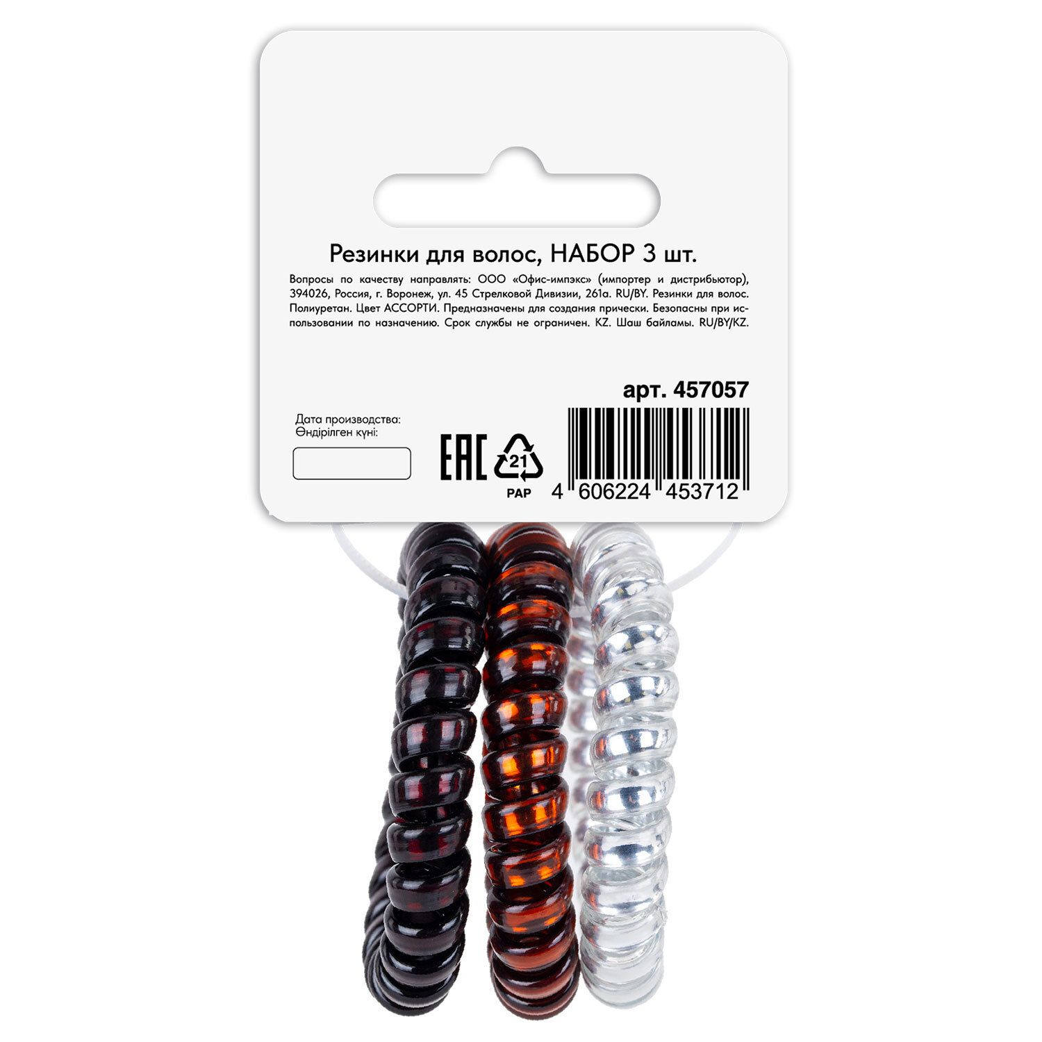 Резинки для волос НАБОР 3 шт., диаметр 5,5 см, чёрный, серебристый, коричневый, MONTE VITA (МОНТЕ ВИТА), 457057 Код товара: 457057 90 ₽ Купить Производитель:MONTE VITA Резинки для волос MONTE VITA – идеальное решение для создания прически. Резинки помогают поддерживать волосы в аккуратном состоянии, придают прическе законченный вид. 3 резинки-пружинки в нейтральной гамме (черный, серебристый, коричневый) – выбор для любителей сдержанной элегантности. Универсальные оттенки легко комбинируются с аксессуарами, а гибкая структура бережно фиксирует волосы без заломов. Резинки обеспечивают надежную фиксацию, удобно снимаются, не цепляют и не рвут волосы.Производство: КитайТип товара: резинка для волосТип резинки: пружинкаЦвет: ассортиДекор: нетНабор: даКоличество в наборе: 3 шт.Размер: 5,5 смМатериал: полиуретанСерия: -Упаковка: картонная карточка с европодвесомВес: 25 грРазмер упаковки: 3 × 11.7 × 6.8 смОбъём: 0.0001 м3Промежуточная упаковка: 12 штТранспортная упаковка: 240 штШтрих-код: 4606224453712 Файлы Сертификат-1.jpg Сертификат-2.jpg Сертификат-3.jpg Сертификат-4.jpg