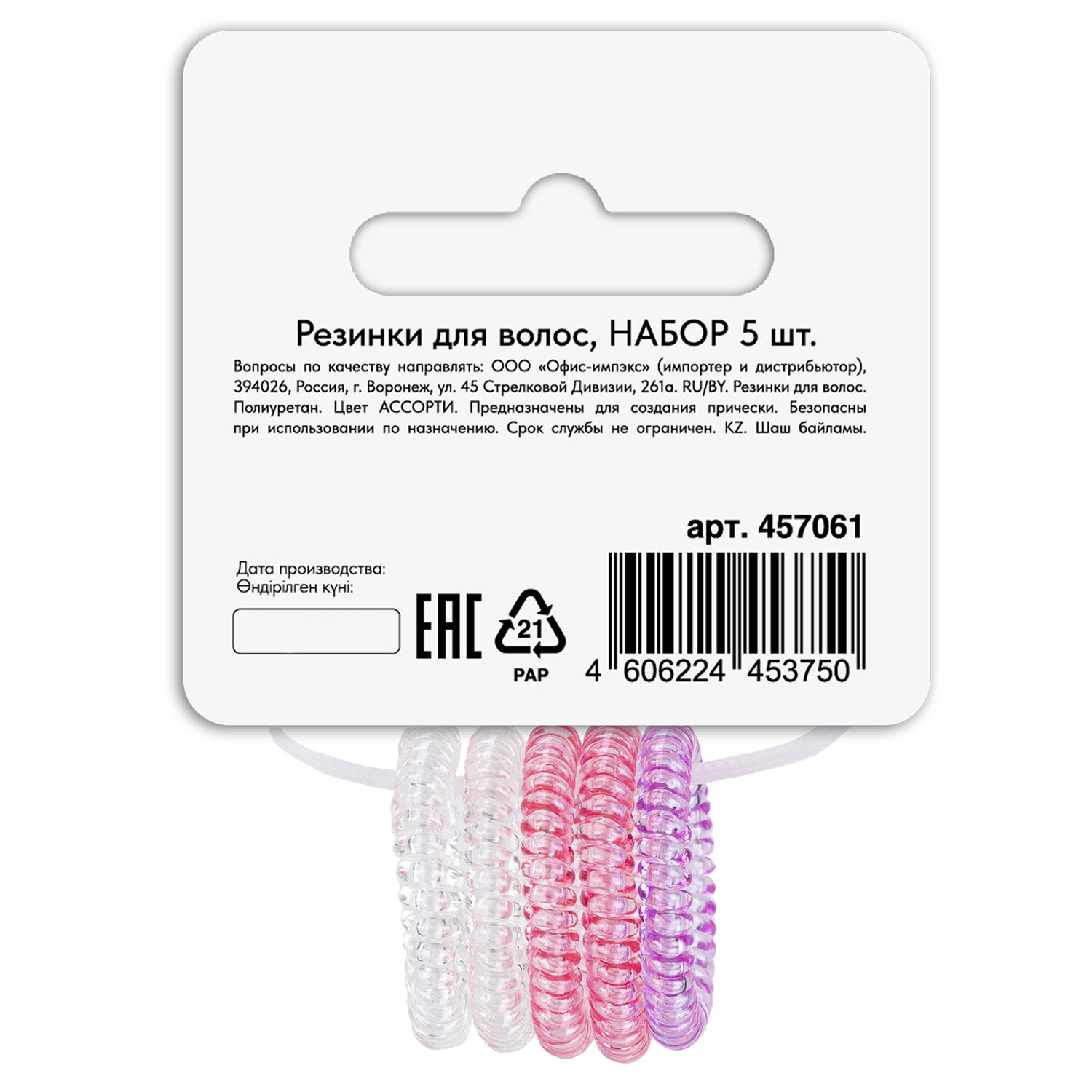 Резинки для волос НАБОР 5 шт., диаметр 2,5 см, пружинка, разные цвета, MONTE VITA (МОНТЕ ВИТА), 457061 Код товара: 457061 82,45 ₽ Купить Производитель:MONTE VITA Резинки для волос MONTE VITA – идеальное решение для создания прически. Резинки помогают поддерживать волосы в аккуратном состоянии, придают прическе законченный вид. 5 резинок-пружинок в виде "телефонного провода" для любителей ярких акцентов. Неоновые оттенки подойдут к спортивному образу или летнему луку, а компактный размер (2,5 см) не утяжеляет тонкие волосы. Эластичный полиуретан не оставляет заломов и бережно фиксирует пряди. Резинки обеспечивают надежную фиксацию, удобно снимаются, не цепляют и не рвут волосы.Производство: КитайТип товара: резинка для волосТип резинки: пружинкаЦвет: ассортиДекор: нетНабор: даКоличество в наборе: 5 шт.Размер: 2,5 смМатериал: полиуретанСерия: -Упаковка: картонная карточка с европодвесомВес: 8 грРазмер упаковки: 1.3 × 8.6 × 5.4 смОбъём: 0.0001 м3Промежуточная упаковка: 12 штТранспортная упаковка: 240 штШтрих-код: 4606224453750 Файлы Сертификат-1.jpg Сертификат-2.jpg Сертификат-3.jpg Сертификат-4.jpg