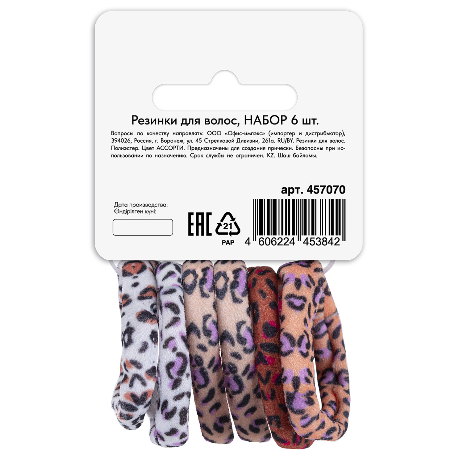 Резинки для волос НАБОР 6 шт., мягкие, средние, с принтом, MONTE VITA (МОНТЕ ВИТА), 457070 Код товара: 457070 86,2 ₽ Купить Производитель:MONTE VITA Резинки для волос MONTE VITA – идеальное решение для создания прически. Резинки помогают поддерживать волосы в аккуратном состоянии, придают прическе законченный вид. 6 резинок с яркими принтами. Мягкий полиэстер не повреждает волосы, а размер 4 см подходит для пучков, хвостов и детских укладок. Создавайте образы под настроение! Резинки обеспечивают надежную фиксацию, удобно снимаются, не цепляют и не рвут волосы.Производство: КитайТип товара: резинка для волосТип резинки: мягкиеЦвет: разноцветныйДекор: рисунокНабор: даКоличество в наборе: 6 шт.Размер: 4 смМатериал: полиэстерСерия: -Упаковка: картонная карточка с европодвесомВес: 11 грРазмер упаковки: 2.1 × 10 × 6.4 смОбъём: 0.0001 м3Промежуточная упаковка: 12 штТранспортная упаковка: 240 штШтрих-код: 4606224453842 Файлы Сертификат-1.jpg Сертификат-2.jpg Сертификат-3.jpg Сертификат-4.jpg
