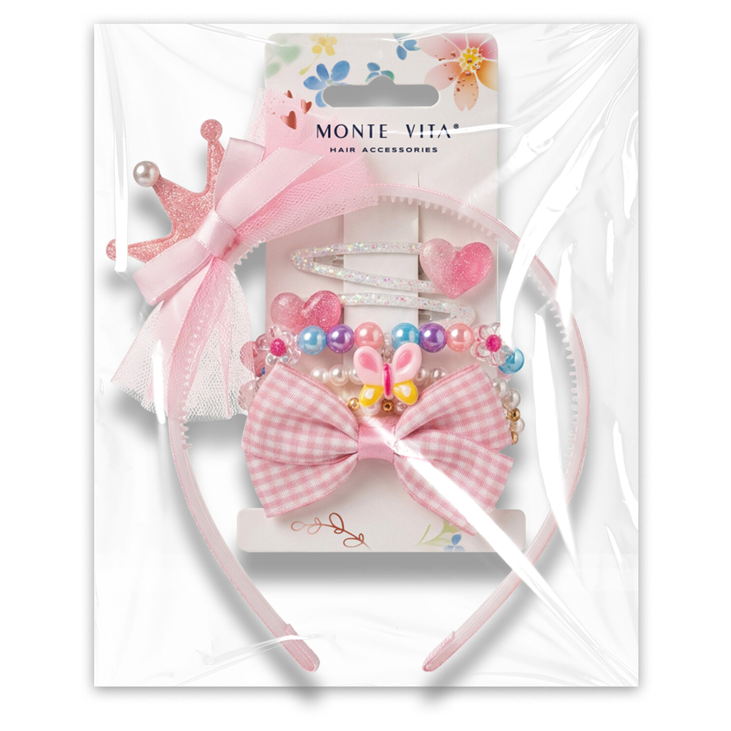 Резинка для волос с ободком, заколками (2 шт) и браслетами (3 шт), НАБОР, MONTE VITA Код товара: 458860 314,29 ₽ Купить Производитель:MONTE VITA Набор аксессуаров для волос — элегантный набор заколок, резинок, крабов и ободков для безупречного образа. Это больше, чем аксессуары: шанс раскрыть индивидуальность и подчеркнуть стиль для любого повода — от будней до праздников. Нежный детский набор аксессуаров для волос (1 резинка, 1 ободок, 2 заколки и 3 браслета) создан специально для маленьких модниц. Он помогает девочкам выражать свою индивидуальность и создавать красивые причёски каждый день. Резинка бережно фиксирует волосы, не повреждая и не запутывая их, а удобный ободок и яркие заколки надёжно удерживают даже густые детские пряди, создавая очаровательный и аккуратный образ. Браслеты станут милым завершающим акцентов и добавит нотку нежности в любой образ.Производство: КитайТип товара: набор аксессуаров для волосКоличество в наборе: 7 шт.Цвет: разноцветныйМатериал: ABS-пластик/полиэстер/металлКомплектация: браслет 3 шт., заколка 2 шт., ободок 1 шт., резинка 1 шт.Упаковка: картонная карточка в пакете с европодвесомВес: 179 грРазмер упаковки: 1.5 × 13 × 19 смОбъём: 0.001 м3Промежуточная упаковка: 6 штТранспортная упаковка: 72 штШтрих-код: 4606224541730 Файлы