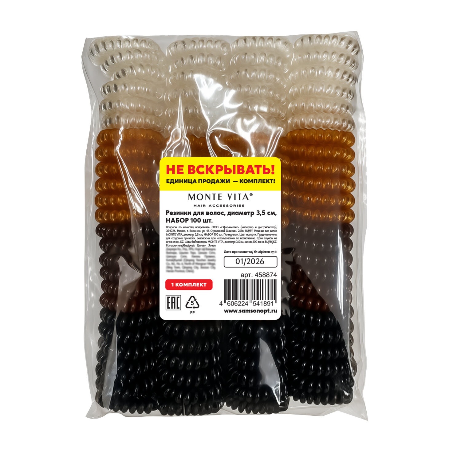 Резинки для волос НАБОР 100 шт, 3,5 см, пружинки, коричневые, прозрачные,MONTE VITA Код товара: 458874 789,06 ₽ Купить Производитель:MONTE VITA Резинки для волос — идеальное решение для создания прически. Резинки помогают поддерживать волосы в аккуратном состоянии, придают прическе законченный вид. Резинки скранч обеспечивают надежную фиксацию, удобно снимаются, не цепляют и не рвут волосы. 100 резинок-пружинок в универсальных оттенках (черный, белый, коричневый) диаметром 3,5 см- выбор для любителей сдержанной элегантности. Нейтральные цвета легко комбинируются с аксессуарами, а гибкая структура бережно фиксирует волосы без заломов. Резинки обеспечивают надежную фиксацию, удобно снимаются, не цепляют и не рвут волосыПроизводство: КитайТип товара: резинка для волосТип резинки: пружинкаЦвет: ассортиДекор: нетНабор: даКоличество в наборе: 100 шт.Размер: 3,5 смМатериал: полиуретанСерия: -Упаковка: пакет со стикеромВес: 300 грРазмер упаковки: 22 × 22 × 4 смОбъём: 0.002 м3Промежуточная упаковка: 50 штТранспортная упаковка: 50 штШтрих-код: 4606224541891 Файлы