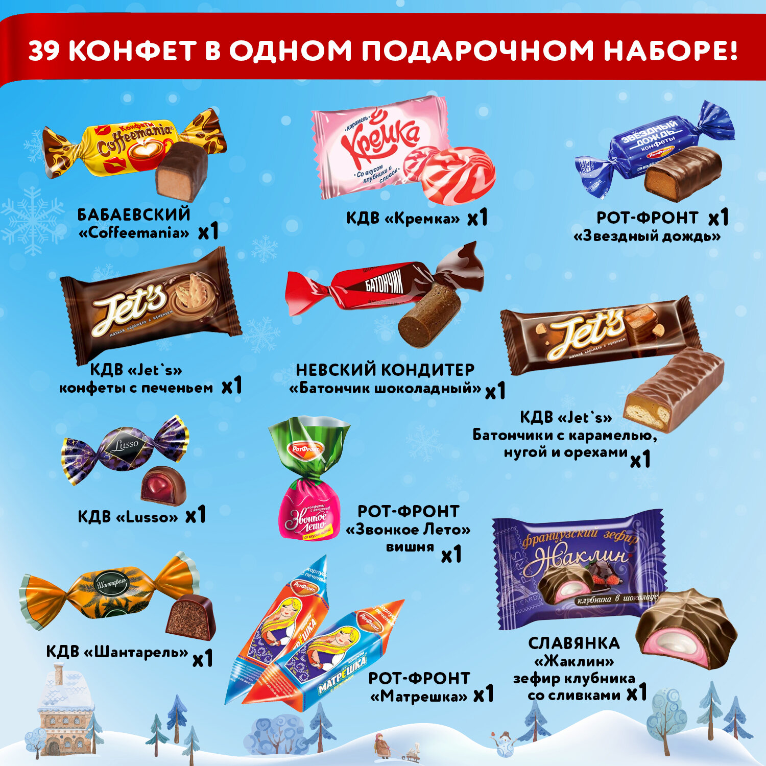 - Количество конфет в наборе: 39 шт.