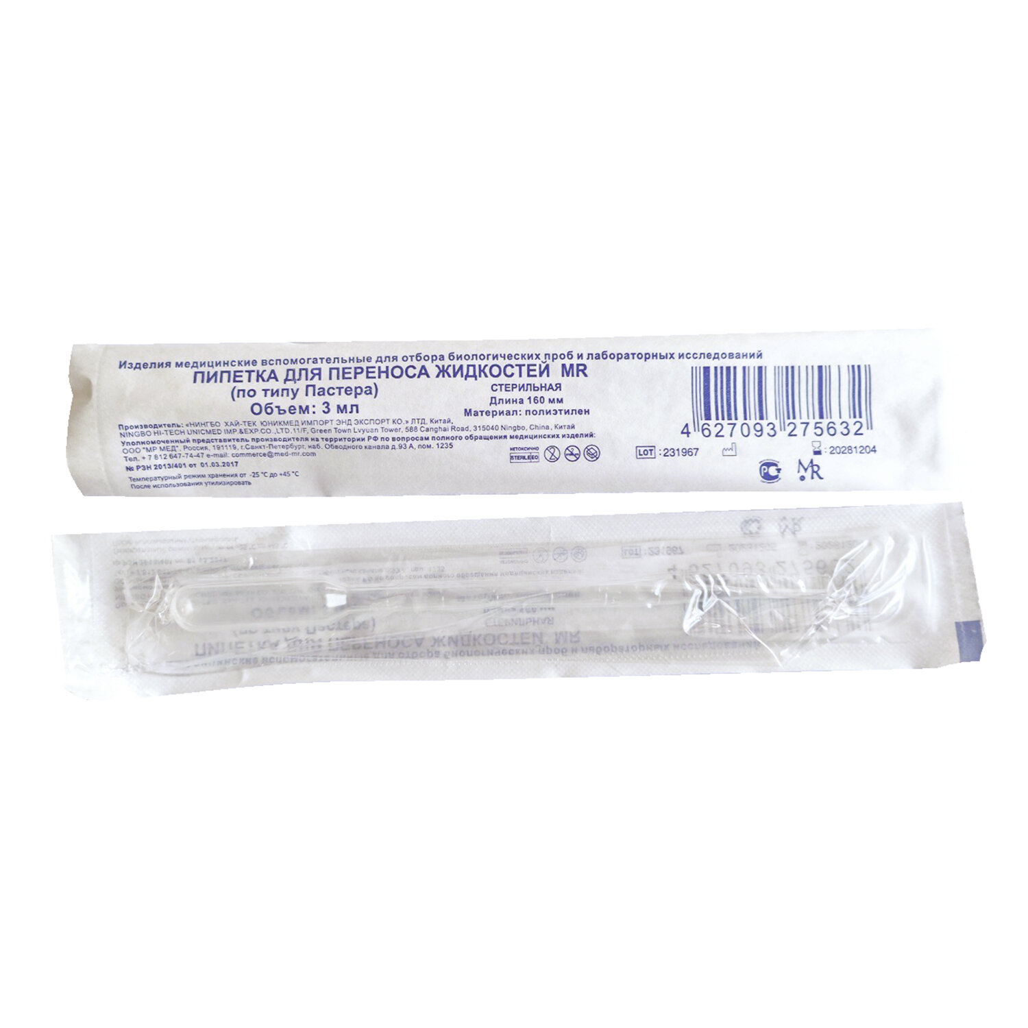 Пипетка Пастера стерильная 3 мл, КОМПЛЕКТ 250 шт., MR MED Код товара: 631560 1 920,3 ₽ Купить Производитель:MR MED Пипетка Пастера объёмом 3 мл предназначена для капельного дозирования жидкостей и изготовлена из полиэтилена. Прямая конструкция длиной 160 мм удобна в использовании, а рельефная градуировка позволяет точно отсчитывать объём. Постоянный размер носика формирует каплю заданного объёма, а замкнутый резервуар повышает безопасность при заполнении. Пипетка стерильная, имеет цену деления 0,5 мл и класс точности 2. Модель относится к типу Пастера.Производство: КитайТип товара: пипетка ПастераКоличество в комплекте: 250 шт.Объем: 3 млСтерильный: даГрадуировка: даСрок годности: 60 месВес: 707 грРазмер упаковки: 13.7 × 30.6 × 23.9 смОбъём: 0.0088 м3Промежуточная упаковка: 20 штТранспортная упаковка: 20 штШтрих-код: 4627093275649 Файлы Сертификат-1.jpg Сертификат-2.jpg Сертификат-3.jpg