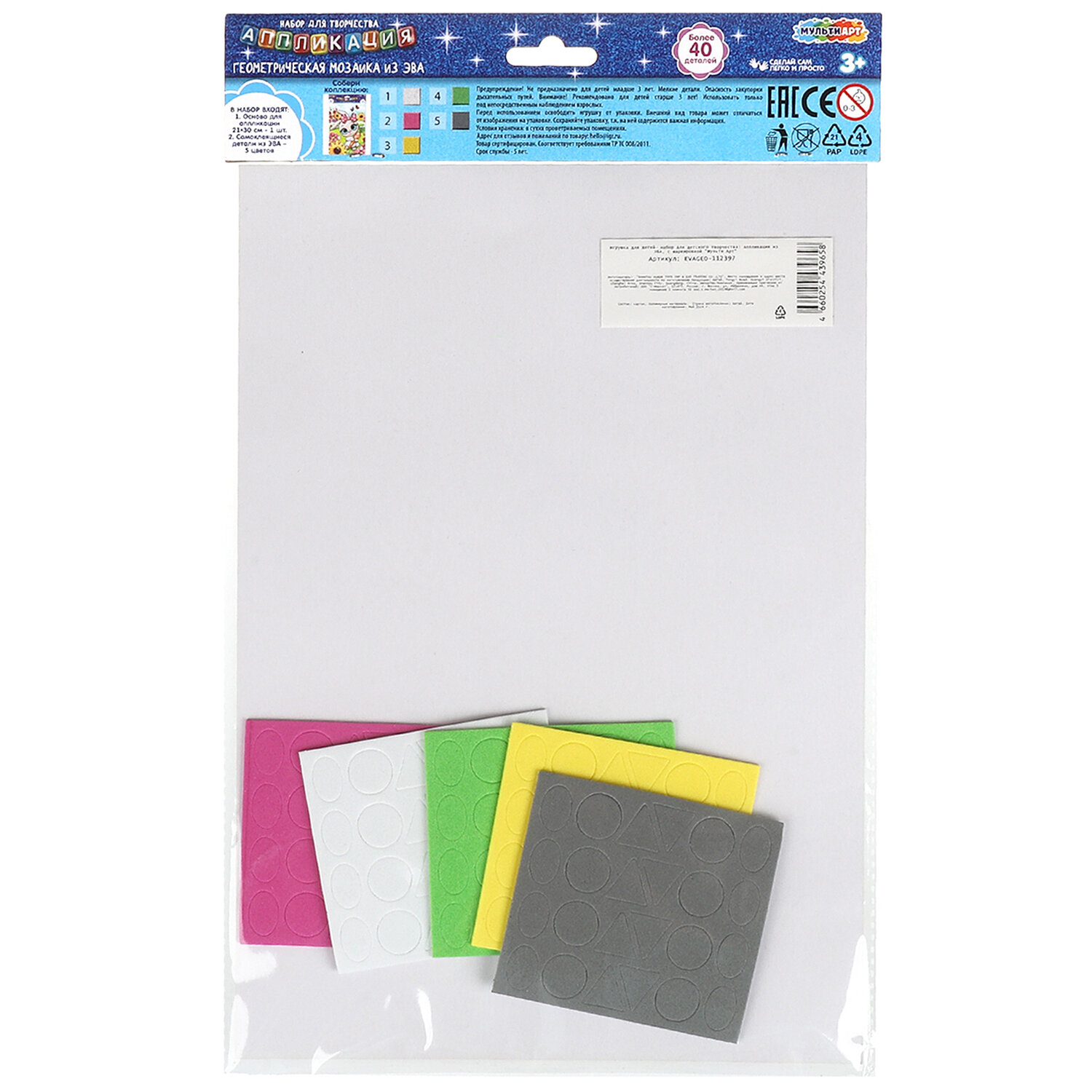 Фигурная мозаика из ЭВА, АССОРТИ 12 видов, 21х30 см, на картоне, МУЛЬТИ АРТ, 5919 Код товара: 665726 212,5 ₽ Купить Производитель:МУЛЬТИ АРТ Фигурная мозаика – отличное средство для развития творческих и интеллектуальных способностей. В процессе работы развивается мелкая моторика, воображение и художественный вкус. Особенности и комплектация: - основа для аппликации; - более 40 фигурных деталей из мягкого материала; - яркие цвета. С помощью красочной картонной основы и разноцветных мягких элементов юный художник сможет самостоятельно создать необычную аппликацию. Готовую поделку можно подарить близким или использовать для украшения интерьера.Производство: КитайТип товара: мозаика из эваПо лицензии: даКомплектация: картонная основаМатериал: вспененный полимерСерия: Аппликация из мягкого пластикаСюжет: АССОРТИ 12 видовОсновной компонент: мягкий пластикФормат основы: 21х30 смКоличество деталей: 40 шт.Возрастная группа: 3+ летУпаковка: пакетВес: 54 грРазмер упаковки: 0.9 × 30.3 × 22.1 смОбъём: 0.001 м3Промежуточная упаковка: 12 штТранспортная упаковка: 12 штШтрих-код: 4660254466081 Сертификат-1.jpg Сертификат-2.jpg