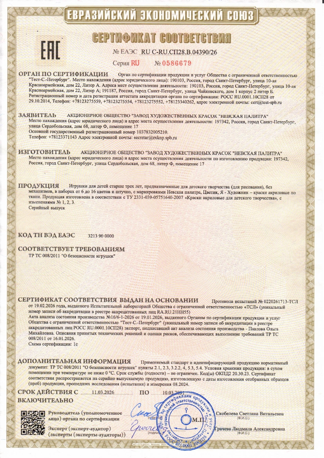 Краски по ткани акриловые "Я - Художник!", 9 цветов по 15 мл, в банках, Невская Палитра Код товара: 192617 377,32 ₽ Купить Производитель:НЕВСКАЯ ПАЛИТРА Акриловые краски по ткани "Я - Художник!" Невская Палитра созданы специально для детского творчества. Предназначены для росписи хлопчатобумажных тканей. Не смываются после высыхания поверхности. Состав набора: белая, желтая, красная, розовая, зеленая, синяя, фиолетовая, коричневая, черная.Производство: РоссияТип товара: краскиТип краски: акриловые по тканиКоличество цветов в наборе: 9 шт.Цвета: белый, желтый, зеленый, коричневый, красный, розовый, синий, фиолетовый, черныйОбъем фасовки: 15 млСпецэффект цвета: классическийФасовка: баночкаСерия: Я - ХудожникУпаковка: картонная коробкаВес: 241 грРазмер упаковки: 4 × 11.5 × 11.6 смОбъём: 0.0006 м3Промежуточная упаковка: 18 штТранспортная упаковка: 18 штШтрих-код: 4690688014749 Файлы Сертификат-1.jpg Сертификат-2.jpg Сертификат-3.jpg