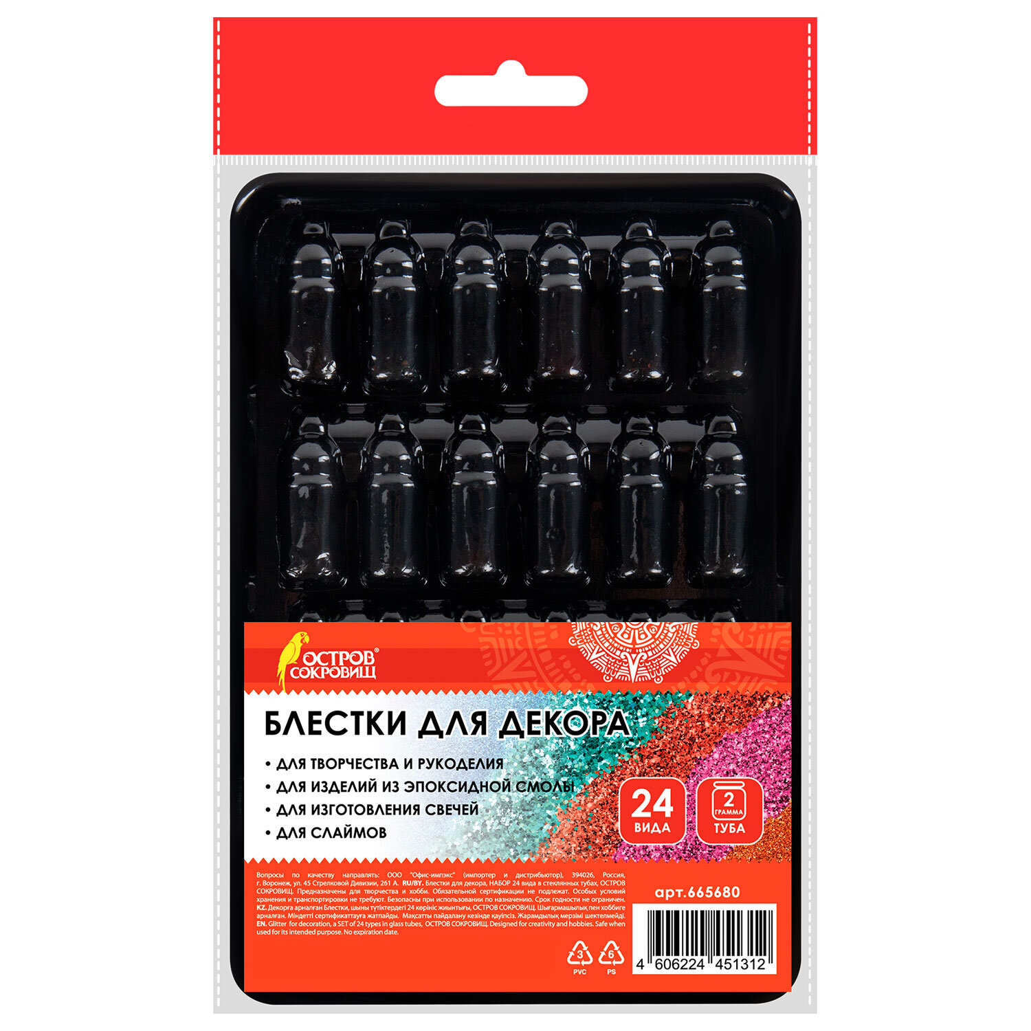 Блестки для декора НАБОР 24 вида по 2 грамма, в стеклянных тубах, ОСТРОВ СОКРОВИЩ Код товара: 665680 153,65 ₽ Купить Производитель:ОСТРОВ СОКРОВИЩ Блестки для декорирования ОСТРОВ СОКРОВИЩ используются для декорирования различных поделок и аппликаций, в украшении предметов интерьера, изготовлении поздравительных открыток и других изделий в различных техниках рукоделия. Мелкие рассыпные блестки ОСТРОВ СОКРОВИЩ создают замечательный сияющий эффект. Мелкий глиттер можно добавлять на клеевую основу, использовать для украшения рисунков, открыток, поделок, декорирования изделий из эпоксидной смолы, слаймов, мыла, а также в любом детском творчестве. Блестки из полиэтилена подходят для любых поверхностей и всех типов красок и лаков. В упаковке 24 тубы с блестками! Каждая баночка содержит уникальный наполнитель с блеском и ярким цветом, который идеально подходит для рукоделия. Вес блесток в каждой тубе - 2 грамма. Предназначены для детей от 6 лет. Сделайте занятия творчеством ярче вместе с блестками ОСТРОВ СОКРОВИЩ!Производство: КитайКоличество цветов в наборе: 24 шт. Особенности: яркие цветаЦвет: ассортиМатериал: полиэтиленВес цвета: 2 гВозрастная группа: от 6 лет летТип товара: блестки для декора (глиттер) в блистереСерия: КлассикаУпаковка: блистерВес: 74 грРазмер упаковки: 1.3 × 14.6 × 10.2 смОбъём: 0.0003 м3Промежуточная упаковка: 24 штТранспортная упаковка: 144 штШтрих-код: 4606224451312 Сертификат-1.jpg Сертификат-2.jpg