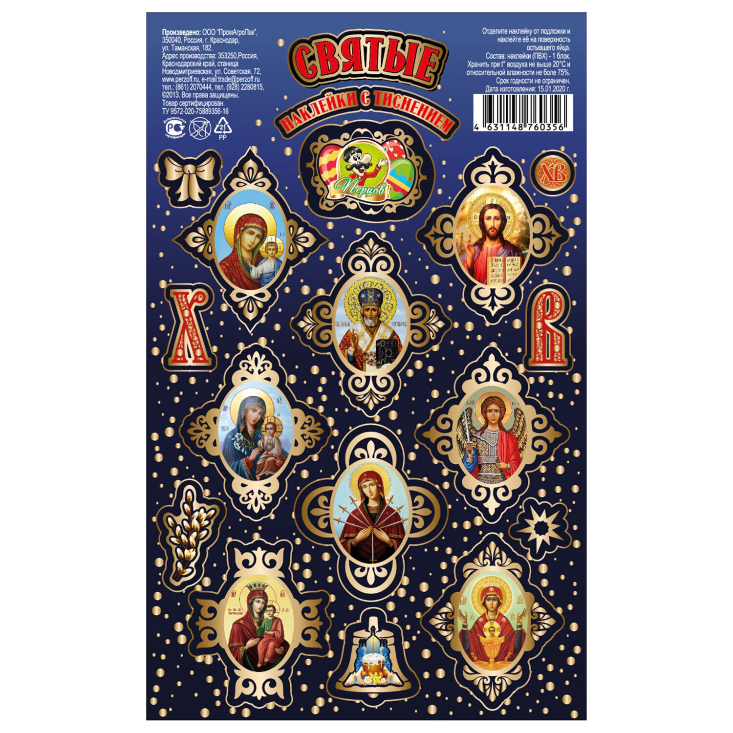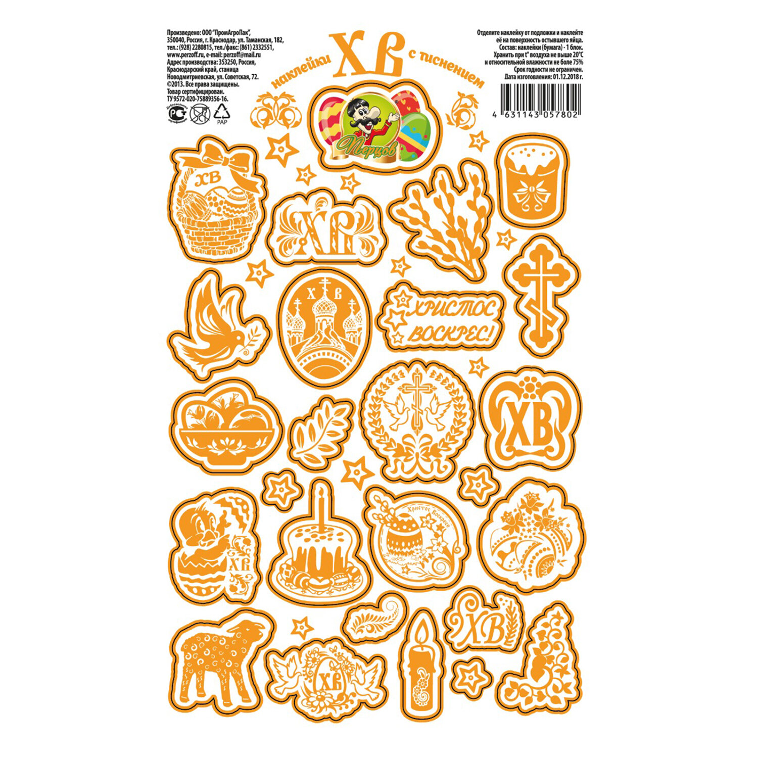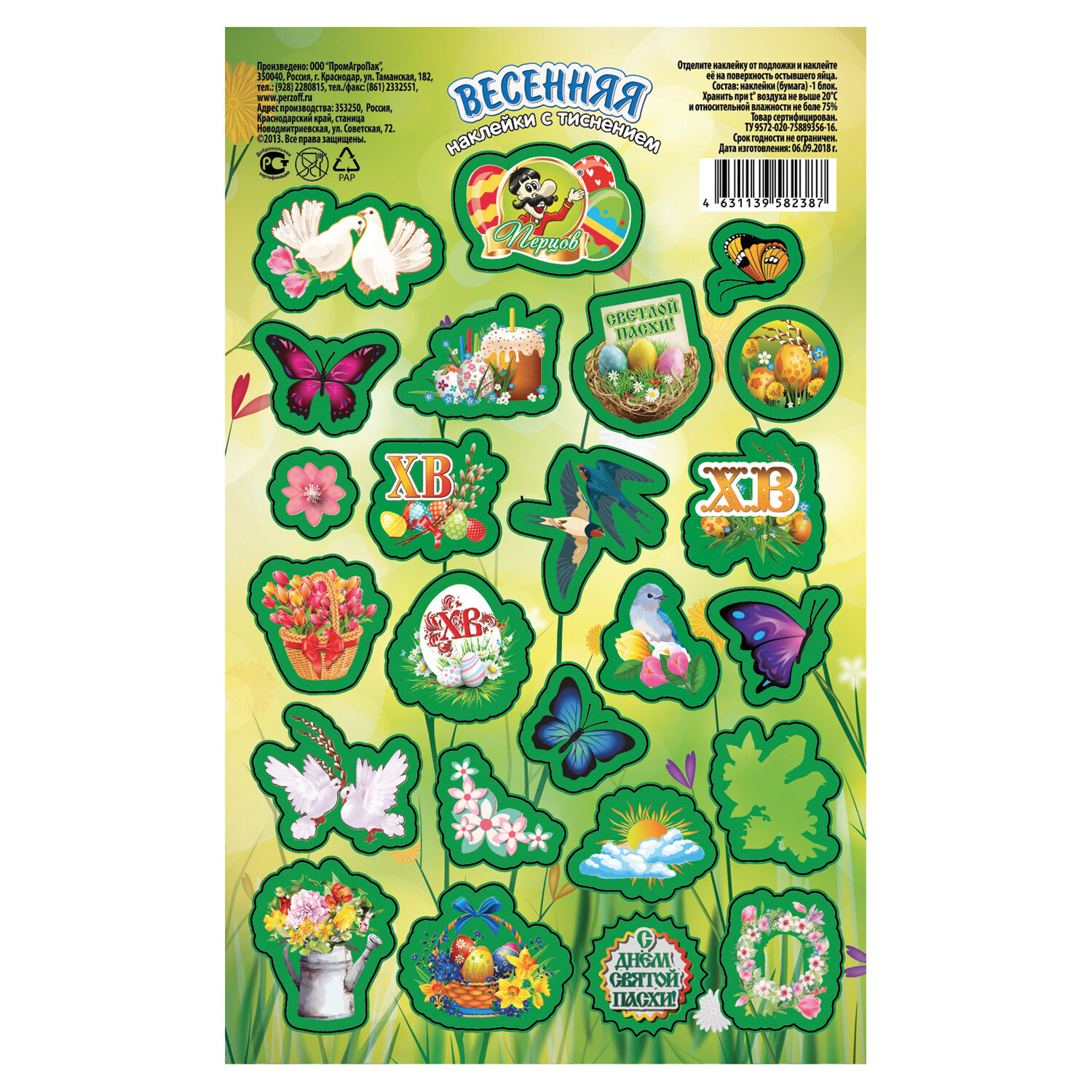 Наклейки пасхальные с тиснением "Пасхальные мотивы", дизайны ассорти, 0806, 0670, 0797, 0812, 0669 Код товара: 592666 40 ₽ Купить Производитель:ПЕРЦОВ Украсьте пасхальные яйца легко и красиво с набором наклеек пасхальных "Пасхальные мотивы"! На листе форматом 17х10,5 см расположены наклейки в традиционных пасхальных дизайнах (поставляются в 5 дизайнах ассорти, без возможности выбора). Яркие краски и праздничные мотивы мгновенно создадут атмосферу весны и радости. Наклейки выполнены на самоклеящейся бумаге с частичным покрытием глиттер — просто оторвите по контуру и приклейте! Идеально подходят не только для украшения пасхальных яиц, но и для множества других идей, таких как декор формы для кулича, оформление подарков, творчество с детьми, скрапбукинг и т.д.Производство: РоссияТип товара: наклейки пасхальныеМатериал: бумага, ПВХРазмер: 17х10,5 смКоличество в комплекте: 1 шт.Упаковка: -Вес: 20 грРазмер упаковки: 0.1 × 10.5 × 17 смПромежуточная упаковка: 25 штТранспортная упаковка: 400 штШтрих-код: 4631179156906 Сертификат-1.jpg