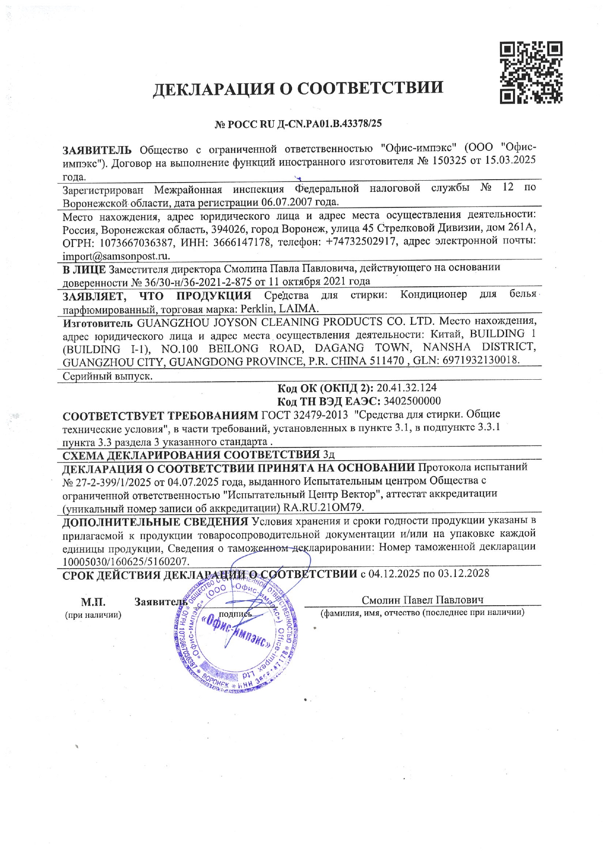 Кондиционер (концентрат) для белья, в гранулах, 250 г, PERKLIN (ПЕРКЛИН) SUPER "Аметист и цветущий сад", 25 стирок Код товара: 609820 307,97 ₽ Купить Производитель:PERKLIN Особая формула кондиционера PERKLIN SUPER разработана для придания яркого и долговечного аромата после стирки. Особые микрокапсулы высвобождаются и проникают глубоко в волокна ткани, ароматизируя и смягчая ее. Рекомендации к применению: засыпьте нужное количество гранул в барабан стиральной машины. Добавьте порошок и ополаскиватель в отсек стиральной машины. Используйте средство согласно инструкциям и нормам дозирования, указанным на упаковке. При выборе режима стирки и температуры следуйте рекомендациям, указанным в паспорте стиральной машины и на ярлыках одежды. Интенсивность аромата можно регулировать, изменяя количество кондиционера в гранулах. Не предназначено для ручной стирки! Состав: > 30% АПАВ, < 30% эмульгатор, < 30% загуститель, 5-15% отдушка, краситель.Производство: КитайОбъем: 0.25 л/кгКонцентрат: даОтдушка: Аметист и цветущий садТип ткани: для всех типов тканей, кроме шерсти и шелкаС антистатиком: даОблегчает глаженье: даОбласть применения: бытовое использованиеСерия: кондиционер в гранулахВид упаковки: флаконСрок годности: 48 месВес: 330 грРазмер упаковки: 7.1 × 17.5 × 7.1 смОбъём: 0.0011 м3Промежуточная упаковка: 30 штТранспортная упаковка: 30 штШтрих-код: 4606224459516 Файлы Сертификат-1.jpg Сертификат-2.jpg