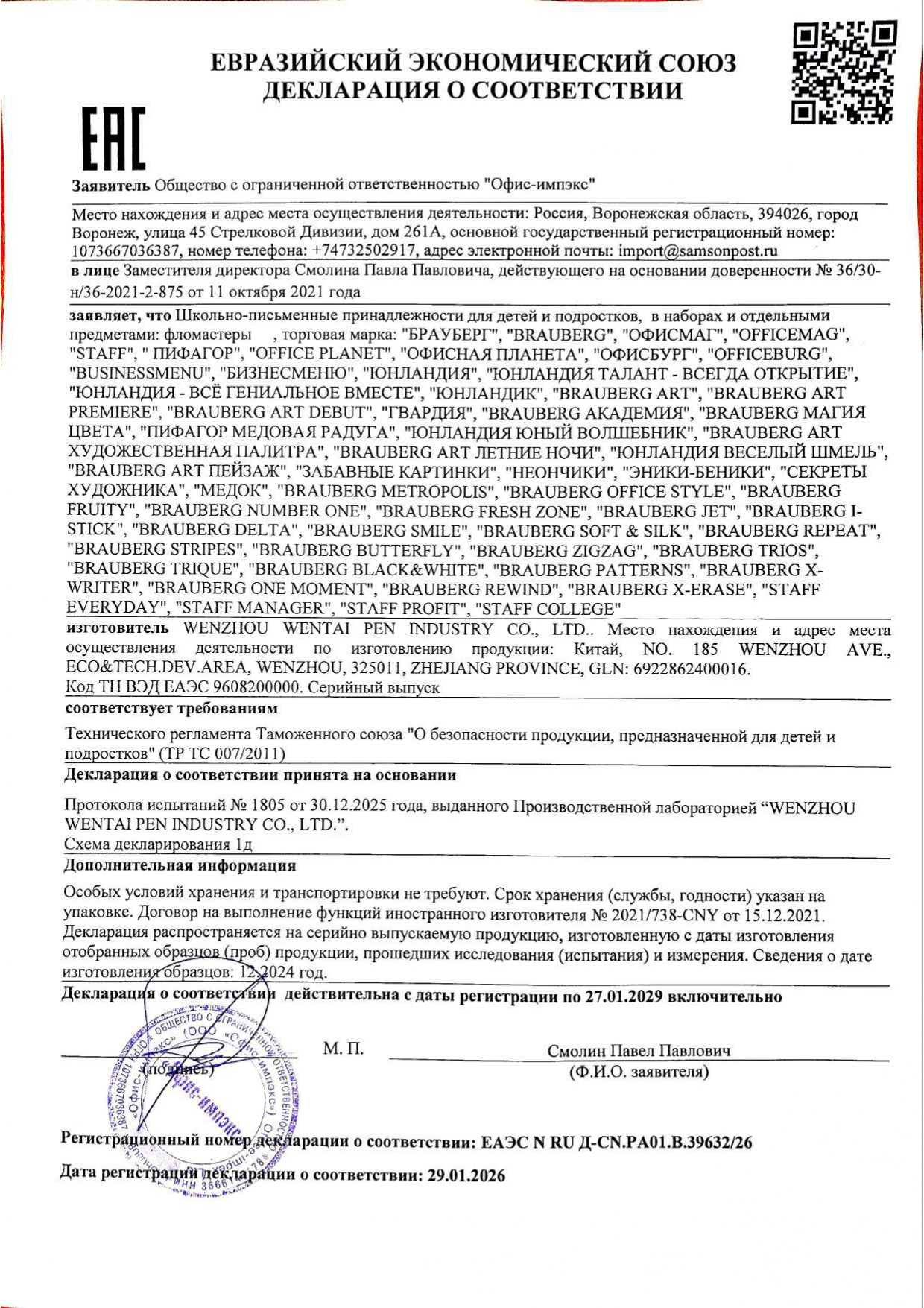 Фломастеры ПИФАГОР "ВЕСЕЛЫЕ ПИТОМЦЫ", 12 цветов, невентилируемый колпачок Код товара: 152452 101,31 ₽ Купить Производитель:ПИФАГОР Фломастеры ПИФАГОР "ВЕСЕЛЫЕ ПИТОМЦЫ" дарят отличные впечатления в процессе раскрашивания каждому ребенку. Рисование способствует развитию мелкой моторики рук у детей, координации движений кистей и пальцев, что благоприятно влияет на творческое мышление. Обладают яркими цветами в количестве 12 штук. Длина корпуса удобной круглой формы составляет 141 мм, а диаметр – 7,5 мм. Благодаря толщине линии письма 1 мм и диаметру пишущего узла 1,8 мм процесс раскрашивания становится легким. Длина линии письма составляет 600 м – такого расхода хватит надолго. Фломастеры легко смываются с большинства материалов и кожи. Корпус изготовлен из качественного полипропилена, который значительно продлевает срок службы фломастеров. Рекомендованы для детей от 3-х лет.Производство: КитайКоличество цветов: 12Форма корпуса: круглаяЭффект чернил: без эффектаТип чернил: смываемыеСерия: ВЕСЕЛЫЕ ПИТОМЦЫШирина линии письма: 1 ммПишущий узел: 1.8 ммДлина письма: 600 мДлина корпуса: 141 ммДиаметр корпуса: 7.5 ммУпаковка: ПВХ-конверт с европодвесомСрок годности: 60 месВес: 58 грРазмер упаковки: 1 × 16.8 × 12.1 смОбъём: 0.0003 м3Промежуточная упаковка: 12 штТранспортная упаковка: 240 штШтрих-код: 4606224377025 Файлы Сертификат-1.jpg Сертификат-2.jpg Сертификат-3.jpg