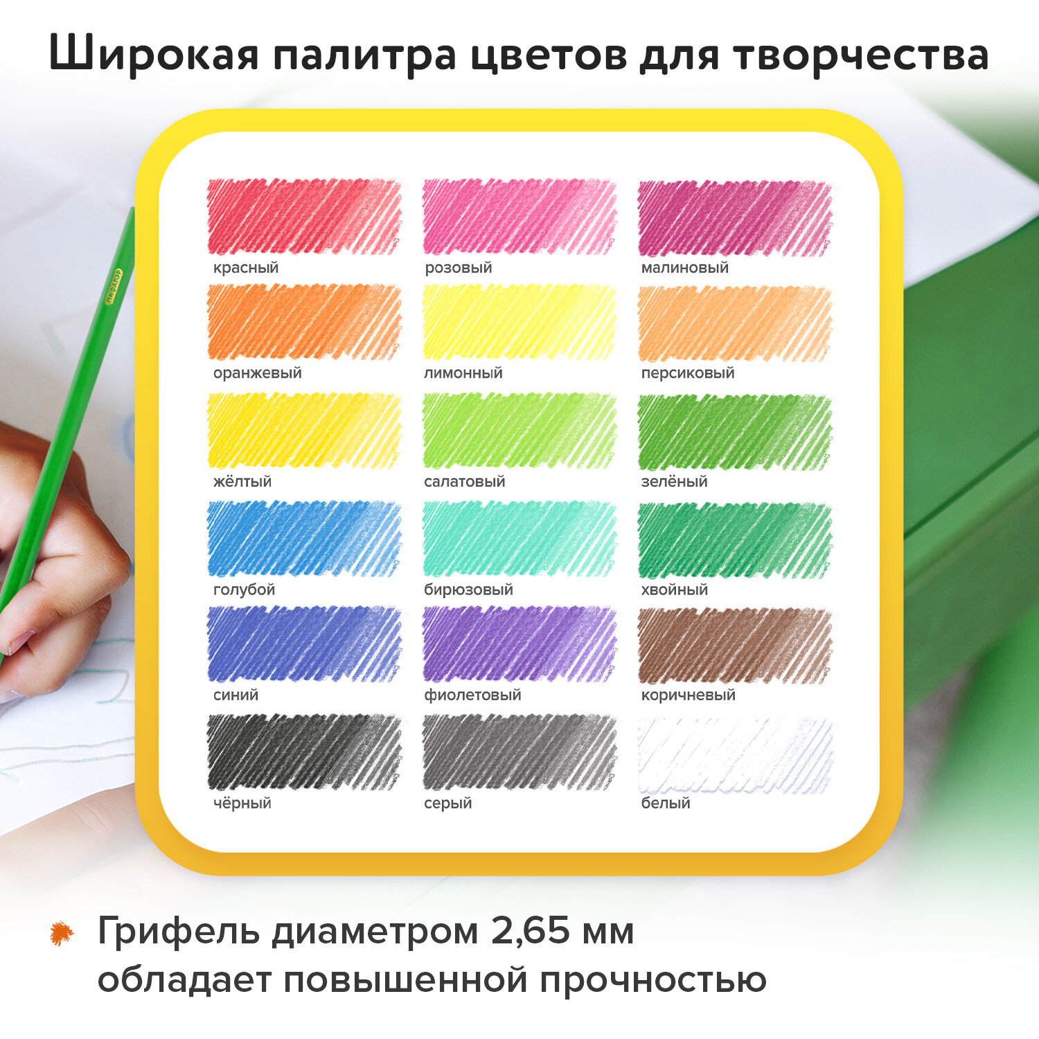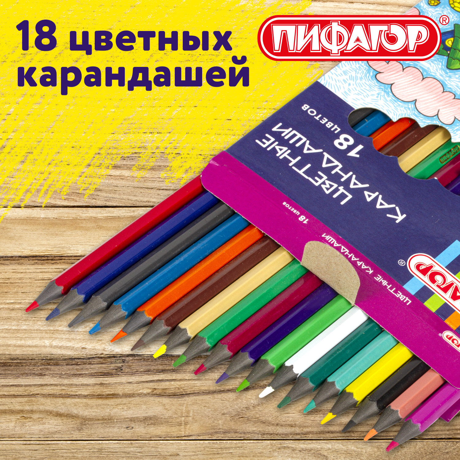 Карандаши цветные ПИФАГОР "СКАЗОЧНЫЙ ГОРОД", 18 цветов, шестигранные Код товара: 181584 149,26 ₽ Купить Производитель:ПИФАГОР Цветные карандаши ПИФАГОР "СКАЗОЧНЫЙ ГОРОД" предназначены для детского творчества, а коробка с забавным оформлением порадует как детей дошкольного и младшего школьного возраста, так и взрослых. Набор состоит из 18 цветов: белый, красный, алый, розовый, пурпурный, желтый, канареечный, оранжевый, персиковый, салатовый, зеленый, темно-зеленый, голубой, синий, фиолетовый, коричневый, серый, черный. Шестигранная форма сечения корпуса позволяет карандашу не скатываться с поверхности стола во время занятий рисованием. Карандаши изготовлены из переработанного пластика и имеют лакированный корпус, который при разломе не образует острые края и безопасен для детей. Легко затачиваются. Грифель диаметром 2,65 мм обладает повышенной прочностью. Все карандаши заточены и поставляются в картонной упаковке с европодвесом.Производство: КитайКоличество цветов: 18 шт.Количество карандашей: 18 шт.Серия: Сказочный городФорма сечения корпуса: шестиграннаяМатериал корпуса: пластикЛакированный корпус: даГрифель повышенной прочности: даЗаточка грифеля: даЛегко затачиваются: даДиаметр грифеля: 2.65 ммДлина карандаша: 175 ммУпаковка: картонная коробка c европодвесомВес: 144 грРазмер упаковки: 0.8 × 20.2 × 12.8 смОбъём: 0.0003 м3Промежуточная упаковка: 8 штТранспортная упаковка: 160 штШтрих-код: 4606224265056 Сертификат-1.jpg Сертификат-2.jpg Сертификат-3.jpg