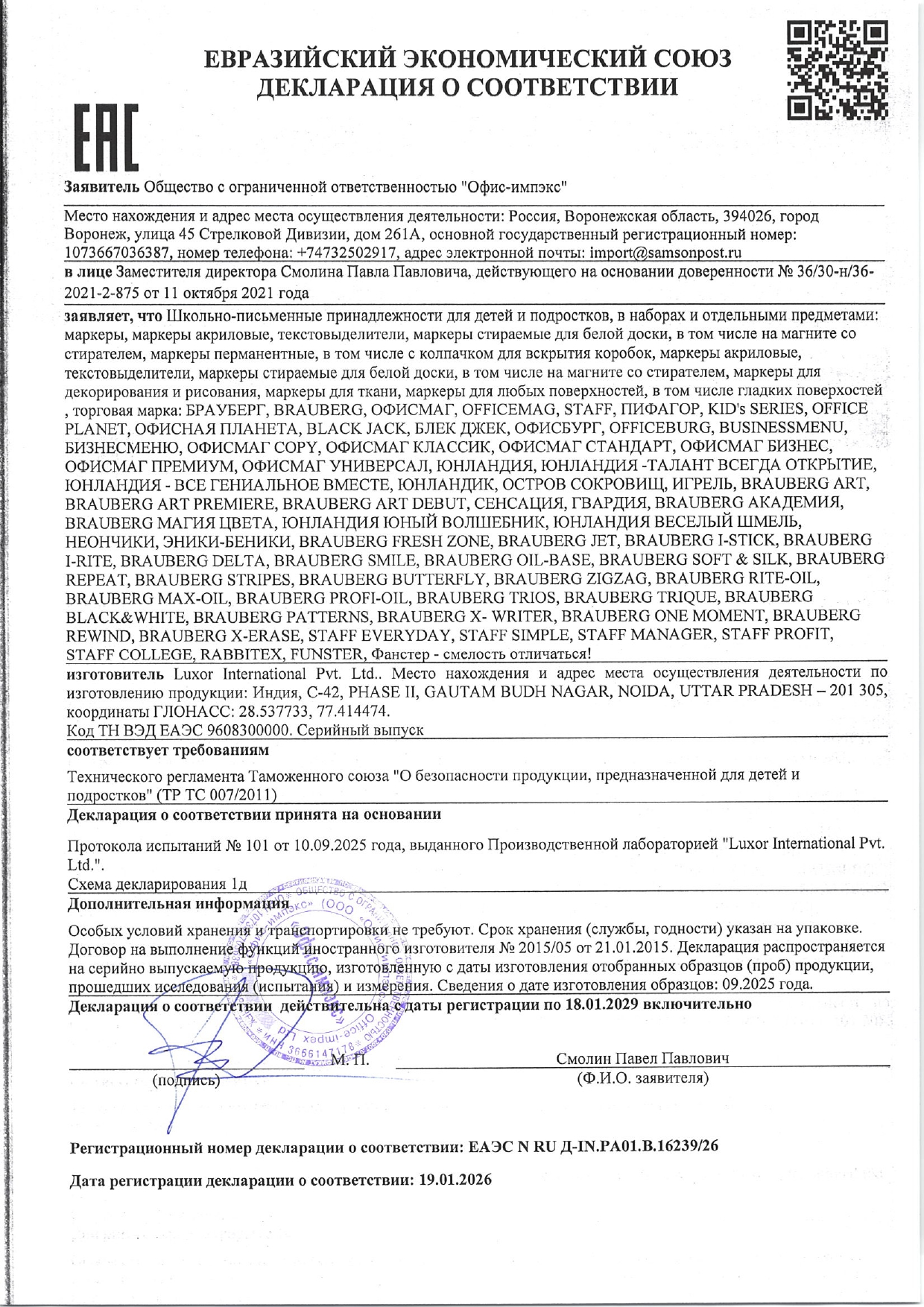 Маркер для любых гладких поверхностей, пленок, стекла, металла, ЧЕРНЫЙ OHP-70, строительный, наконечник 0,7 мм, RABBITEX (РАББИТЕКС) Код товара: 152658 47,77 ₽ Купить Производитель:RABBITEX Маркер для любых гладких поверхностей RABBITEX OHP-70: точность и надёжность маркировки в каждой линии! Маркер подойдет для письма на любых непористых гладких поверхностях, таких как: пленка, стекло, металл, пластик и другие. Маркер для гладких поверхностей черного цвета обладает круглой формой корпуса из пластика, диаметр – 13 мм. Толщина линии письма составляет 0,7 мм – это особенно удобно для деликатных задач, таких как высокоточная маркировка лабораторных пробирок, нанесение меток на пленки, подписание мелких деталей и кабелей. Особая спиртовая основа маркера обеспечивает стойкость к воздействию воды, ультрафиолета, низких и высоких температур. Износостойкий полиацетальный наконечник устойчив к повреждениям и обеспечивает экономный расход чернил: длина линии письма – 900 метров. Изделие не перезаправляется. Плотно закрывается колпачком, что предотвращает высыхание наконечника и чернил. Цвет колпачка с клипом соответствует цвету чернил.Производство: ИндияНазначение: для кабеля, для любых поверхностей, для неровных поверхностей, для промышленной маркиковкиСерия: OHPЦвет чернил: черныйТип чернил: водостойкие, морозостойкие, нестираемые, светостойкиеКоличество в комплекте: 1 шт.Форма наконечника: пулевидныйМинимальная толщина линии письма: 0.7 ммМаксимальная толщина линии письма: 0.7 ммНаконечник устойчив к повреждению и истиранию: даКоличество запасных сменных наконечников в комплекте: 0 шт.Форма корпуса: круглаяДиаметр корпуса: 13 ммМатериал корпуса: РРНаличие клипа: даОснова: спиртоваяУпаковка: картонная коробкаСрок годности: 60 месВес: 12 грРазмер упаковки: 0.6 × 13.8 × 0.8 смПромежуточная упаковка: 12 штТранспортная упаковка: 1152 штШтрих-код: 4606224515717 Файлы Сертификат-1.jpg Сертификат-2.jpg Сертификат-3.jpg