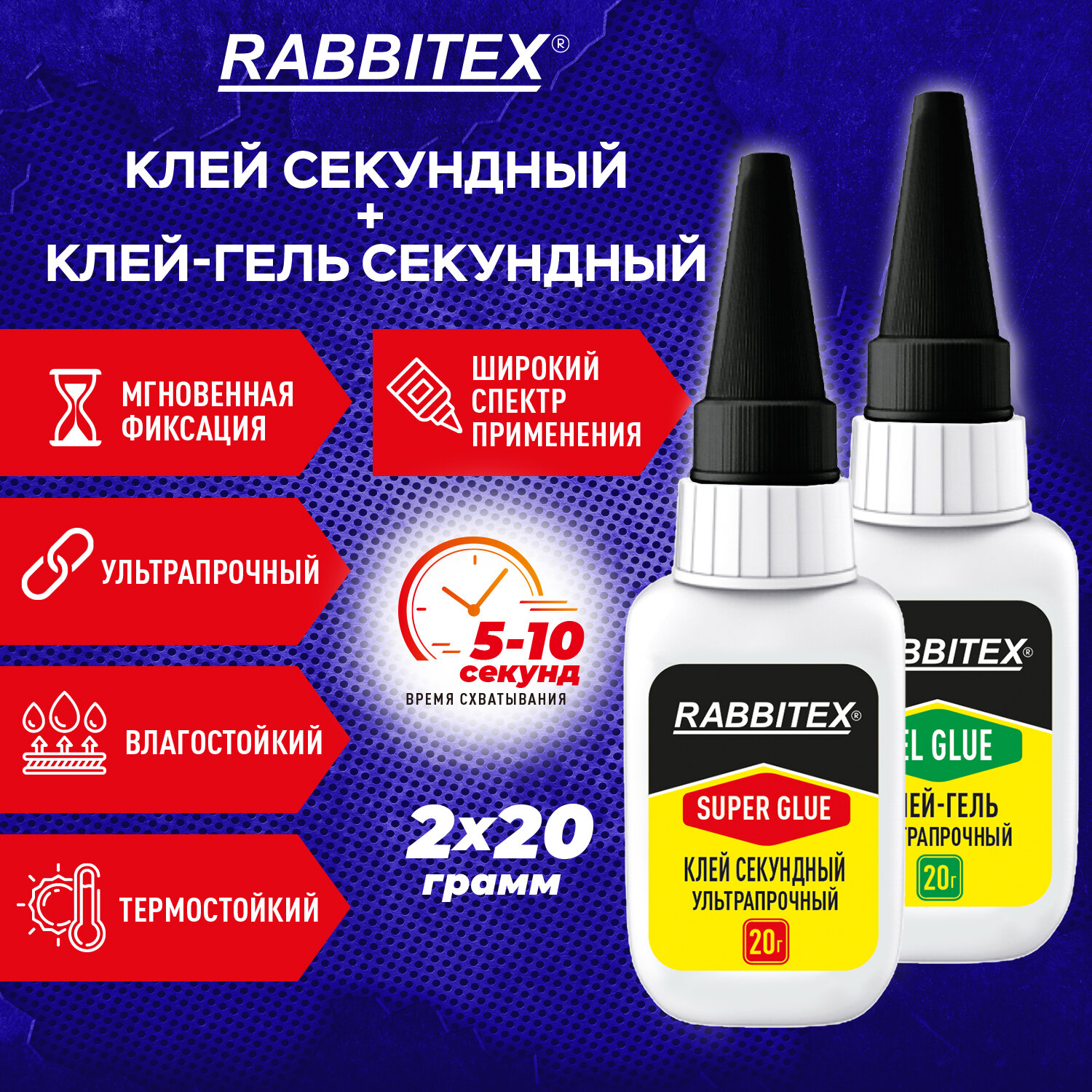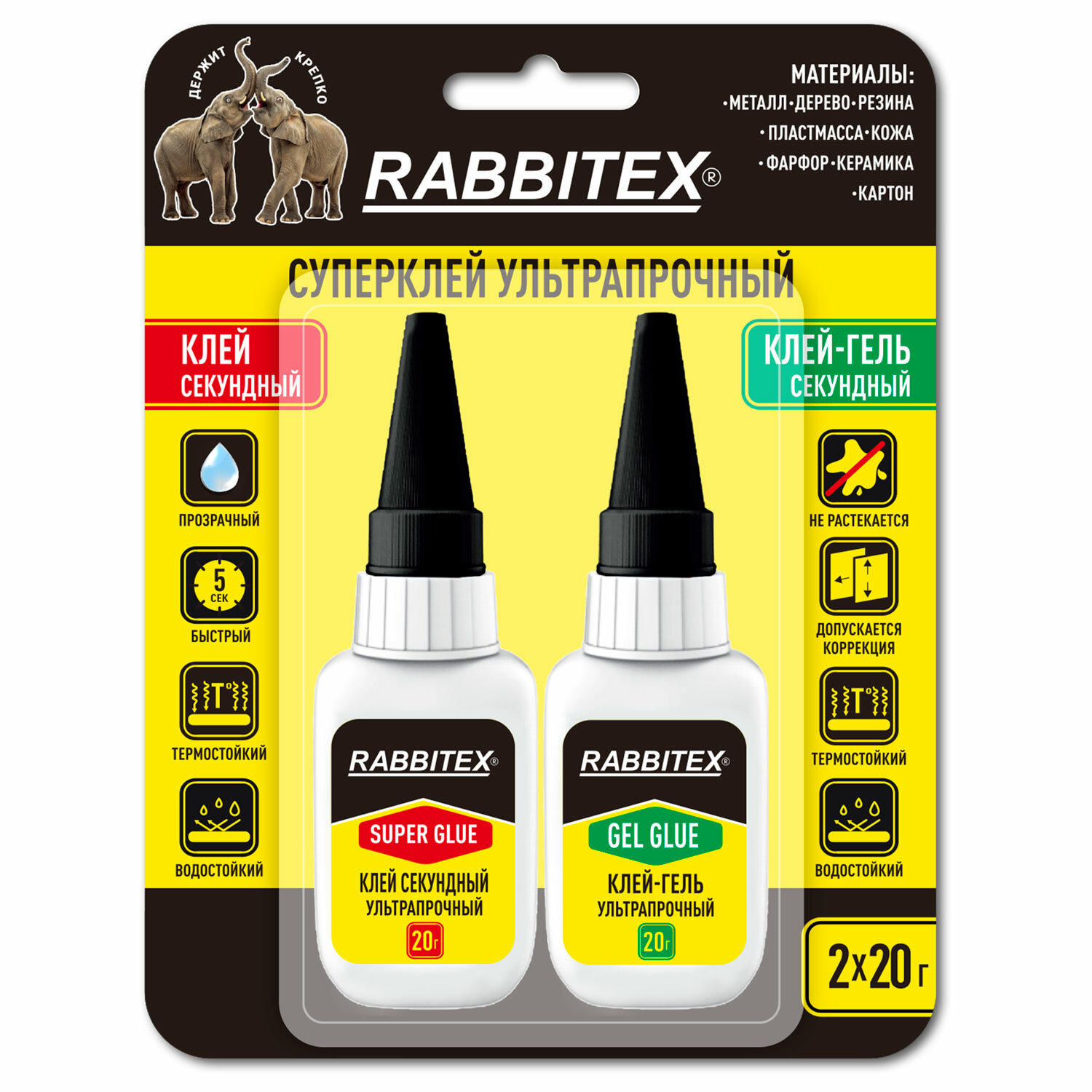 Клей-гель + суперклей секундный УЛЬТРАПРОЧНЫЙ, МАКСИМАЛЬНЫЙ ОБЪЕМ, набор 2х20 г, RABBITEX (РАББИТЕКС) "ДВА СЛОНА" Код товара: 609806 166,32 ₽ Купить Производитель:RABBITEX Секундный суперклей и секундный клей-гель RABBITEX – это профессиональное качество и прочное решение любых бытовых и профессиональных задач. Идеальные помощники в доме, на даче, в мастерской или офисе. Состав набора: клей-гель секундный RABBITEX + клей секундный RABBITEX. Клей секундный RABBITEX – это мгновенная прочность, качество и долговечность. Идеально подходит для ремонта пластика, керамики, дерева, металла, кожи и других материалов. Не применяется для посуды, контактирующей с пищей! Клей-гель секундный RABBITEX – это мгновенная прочность, качество и долговечность. Идеально подходит для ремонта пластика, керамики, дерева, металла, кожи и других материалов. Оптимальный выбор для склеивания вертикальных поверхностей и пористых материалов. Клей-гель не течет, наносится точно, обеспечивая чистое и аккуратное склеивание. Не применяется для посуды, контактирующей с пищей! Состав на основе высококачественного этилцианоакрилата обеспечивает молниеносное схватывание всего за 5-10 секунд. После высыхания образует прочное, прозрачное и влагостойкое соединение, устойчивое к механическим нагрузкам и температурным перепадам. Пластиковый флакон оснащен длинным и тонким носиком, который позволяет наносить клей без подтеков, излишков или склеенных пальцев, делая работу чистой и точной. Преимущества: - прозрачность, - влагостойкость, - термостойкость, - мгновенная фиксация, - широкий спектр применения, - ультрапрочность. Время схватывания: 5-10 секунд (для клей-геля возможна коррекция в первые 10 секунд). Температурный диапазон эксплуатации: от -30 до + 80 °С. Вес нетто: клей секундный – 20 г, клей-гель секундный – 20 г.Производство: КитайНазначение: универсальныйВид: суперклейФорма выпуска: клей, клей-гельВремя схватывания: 0.08 минутВес/объем: 40 г/млМногоразовое применение: даВодостойкий: даСклеивает: войлок, дерево, картон, керамика, кожа, металл, оргстекло, пластик, резина, стекло, фарфор, фибергласСпециальный колпачок позволяет использовать клей многократно: даЦвет клея: прозрачныйСерия: ДВА СЛОНАУпаковка: блистер с европодвесомСрок годности: 48 месВес: 98 грРазмер упаковки: 2.6 × 17.6 × 11.6 смОбъём: 0.0008 м3Промежуточная упаковка: 12 штТранспортная упаковка: 144 штШтрих-код: 4606224458137 Файлы Сертификат-1.jpg Сертификат-2.jpg Сертификат-3.jpg Сертификат-4.jpg Сертификат-5.jpg Сертификат-6.jpg Сертификат-7.jpg Сертификат-8.jpg Сертификат-9.jpg Сертификат-10.jpg Сертификат-11.jpg Сертификат-12.jpg Сертификат-13.jpg Сертификат-14.jpg Сертификат-15.jpg Сертификат-16.jpg Сертификат-17.jpg Сертификат-18.jpg Сертификат-19.jpg Сертификат-20.jpg Сертификат-21.jpg Сертификат-22.jpg Сертификат-23.jpg Сертификат-24.jpg Сертификат-25.jpg