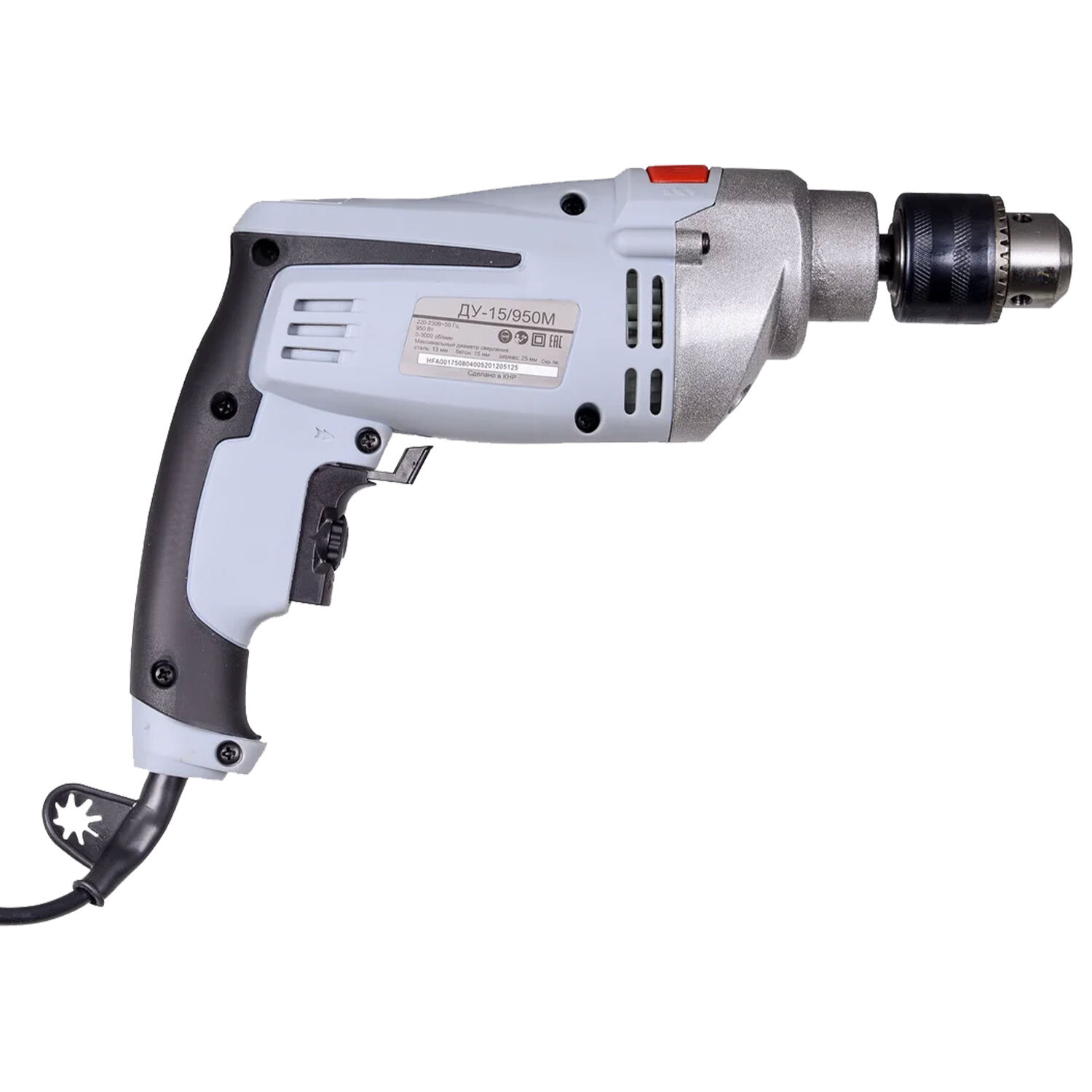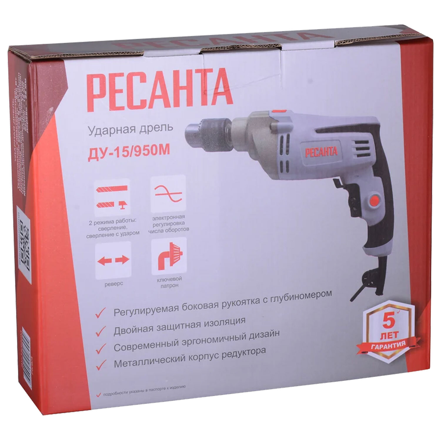 Дрель сетевая ударная, 950 Вт, 3000 об/мин, РЕСАНТА ДУ-15/950М Код товара: 671619 4 281,51 ₽ Купить Производитель:РЕСАНТА Ударная дрель Ресанта ДУ-15/950М (75/8/4) — незаменимый помощник для ремонта и строительства. Сверлит дерево, металл, бетон. Мощность 950 Вт, регулировка оборотов, реверс, ключевой патрон. Идеальна для монтажа мебели, проводки, крепления конструкций. Ударная дрель Ресанта ДУ-15/950М (75/8/4) — универсальный электроинструмент для сверления отверстий в разных материалах. Сочетает вращательное движение с ударным действием, что позволяет работать с бетоном, кирпичом, металлом и деревом. Ключевые характеристики: мощность: 950 Вт; максимальная частота вращения: 3000 об/мин; максимальная частота ударов: 5000 уд/мин; тип патрона: ключевой (1,5–13 мм); максимальный диаметр сверления: - дерево — 25 мм; - металл — 13 мм; - кирпич — 13 мм; - бетон — 15 мм; функции: регулировка частоты вращения, реверс, защита от перегрузок; дополнительная рукоятка в комплекте; ограничитель глубины сверления; длина кабеля: 1,5 м; вес: 2,1 кг; габариты (без упаковки): 580? 315? 265 мм. Преимущества: металлический редуктор — долговечность; ключевой патрон — надёжная фиксация оснастки; регулировка оборотов — адаптация под разные материалы; реверс — облегчает извлечение застрявшего сверла; боковая рукоятка с мягкой накладкой — комфорт при работе. Вся информация на сайте о товарах носит справочный характер и не является публичной офертой в соответствии с пунктом 2 статьи 437 ГК РФ. Производитель оставляет за собой право изменять характеристики товара, его внешний вид и комплектность без предварительного уведомления продавца.Производство: КитайТип: ударнаяМощность: 950 ВтКоличество ударов в минуту: 30000 уд./мин.Диаметр патрона: 13 ммКоличество скоростей: 1Скорость холостого хода 1: 3000 об/минМакс. диаметр сверления (дерево): 25 ммМакс. диаметр сверления (металл): 13 ммРеверс: даТип упаковки: коробкаДлина: 295 ммШирина: 73 ммГлубина: 245 ммВес нетто: 2.1 гСерия: ДУВес: 2,4 кгРазмер упаковки: 7.3 × 24.5 × 29.5 смОбъём: 0.0074 м3Промежуточная упаковка: 6 штТранспортная упаковка: 6 штШтрих-код: 4606059028994 Файлы