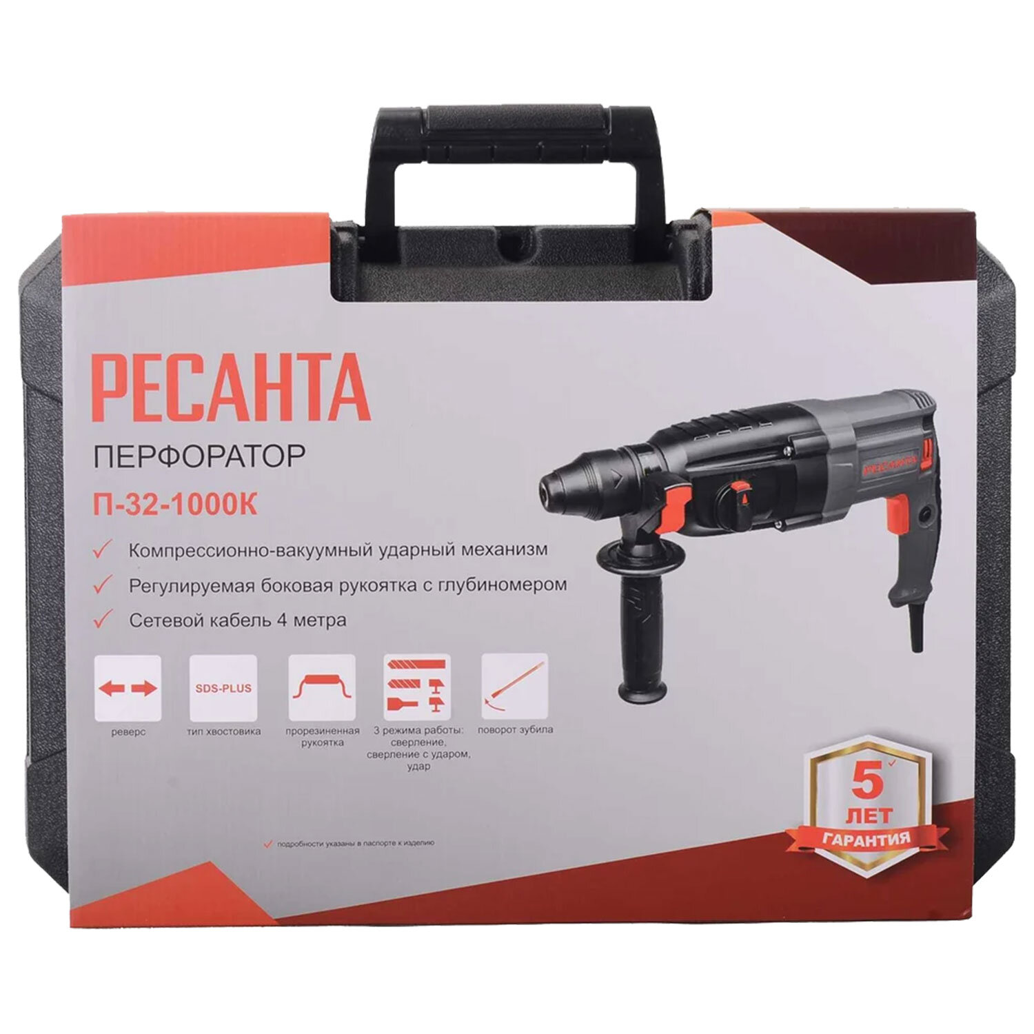 Перфоратор сетевой, 1000 Вт, 1100 об/мин, 4900 уд/мин, патрон SDS PLUS, РЕСАНТА П-32-1000К Код товара: 671626 7 750,67 ₽ Купить Производитель:РЕСАНТА Сетевой перфоратор Ресанта П-32-1000К (1000 Вт) с патроном SDS?PLUS — для сверления и долбления в бетоне, кирпиче, камне. 3 режима (сверление, сверление с ударом, отбойник), реверс, энергия удара 5,2 Дж. В комплекте кейс, рукоятка, ограничитель глубины. Перфоратор сетевой Ресанта П-32-1000К (75/3/3) — мощный инструмент для строительных и ремонтных работ: бурения отверстий, штробления, демонтажа конструкций. Подходит для профессионалов и домашних мастеров. Ключевые характеристики: мощность: 1000 Вт; энергия удара: 5,2 Дж; частота вращения: 0–1100 об/мин; частота ударов: 0–4900 уд/мин; патрон: SDS-PLUS; максимальный диаметр сверления: - бетон — 32 мм; - сталь — 13 мм; - дерево — 40 мм; режимы работы: сверление, сверление с ударом, долбление (отбойный молоток); дополнительные функции: реверс, регулировка частоты вращения, настройка углового положения; длина кабеля: 4 м; вес: 3 кг. Комплектация: перфоратор; боковая рукоятка; ограничитель глубины сверления; кейс для хранения и транспортировки; инструкция. Преимущества: 3 режима работы — универсальность для разных задач; реверс — лёгкое извлечение застрявшего бура; патрон SDS-PLUS — быстрая смена оснастки; предохранительная муфта — защита от перегрузок и травм; защита от пыли — долгий срок службы инструмента; резиновый корпус — комфорт и защита от ударов; длинный кабель (4 м) — работа без удлинителей; кейс в комплекте — удобное хранение и переноска. Вся информация на сайте о товарах носит справочный характер и не является публичной офертой в соответствии с пунктом 2 статьи 437 ГК РФ. Производитель оставляет за собой право изменять характеристики товара, его внешний вид и комплектность без предварительного уведомления продавца.Производство: КитайТип патрона: SDS+Мощность: 1000 ВтЭнергия удара: 5.2 ДжКоличество ударов в минуту: 4900 уд/минСкорость вращения: 1100 об/минКоличество режимов работы: 3Тип расположения двигателя: горизонтальныйРегулировка скорости: даМаксимальный диаметр сверления (бетон): 32 ммМаксимальный диаметр сверления (дерево): 40 ммМаксимальный диаметр сверления (металл): 13 ммРеверс: даТип упаковки: кейсДлина: 470 ммШирина: 445 ммГлубина: 305 ммВес изделия нетто: 3 кгВес: 4,89 кгРазмер упаковки: 8 × 44.5 × 47 смОбъём: 0.0197 м3Промежуточная упаковка: 4 штТранспортная упаковка: 4 штШтрих-код: 4606059029625 Файлы