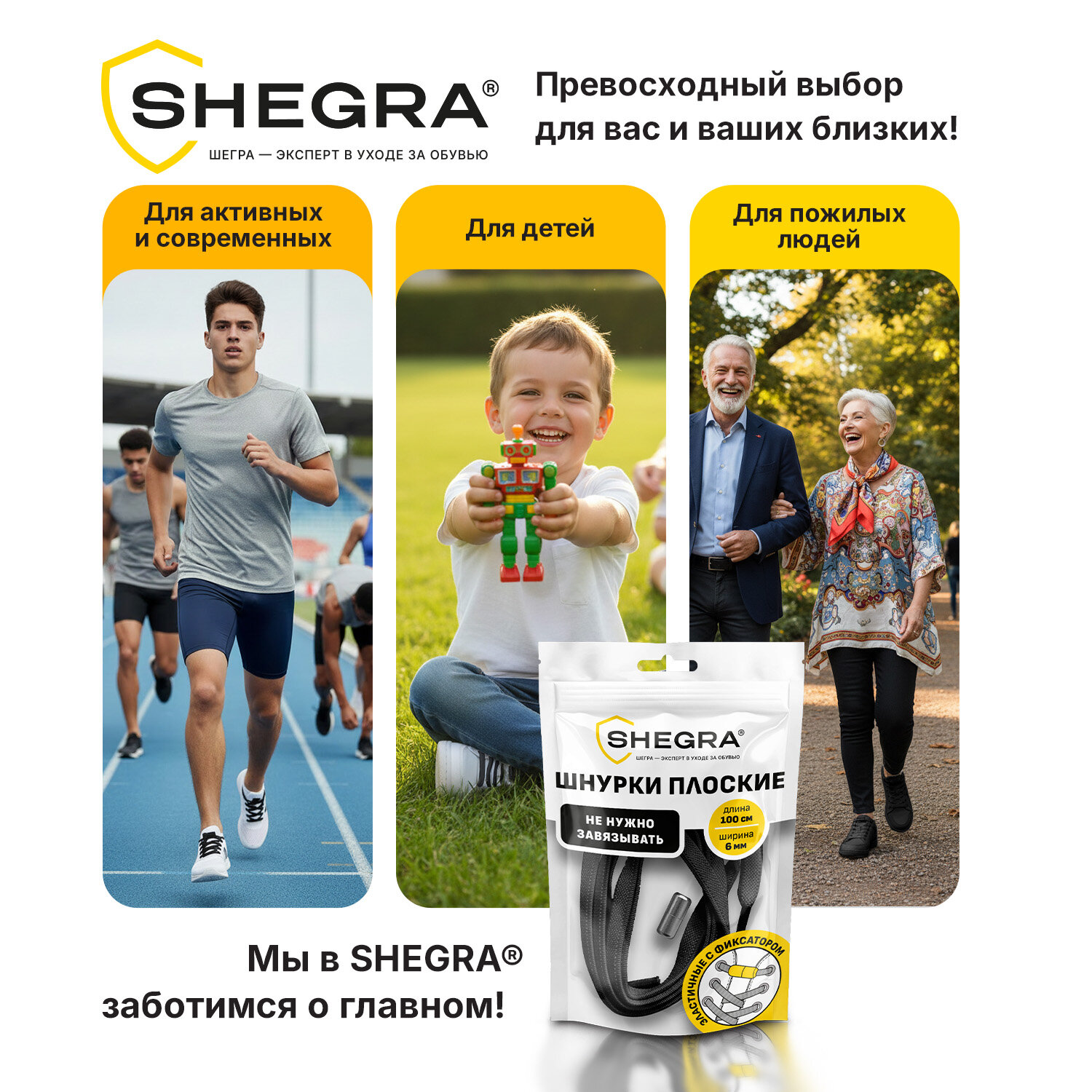 Шнурки плоские эластичные ЧЕРНЫЕ, длина 100 см, ширина 6 мм, 2 капсулы серебристого цвета, SHEGRA (ШЕГРА) Код товара: 701713 118,72 ₽ Купить Производитель:SHEGRA Плоские шнурки SHEGRA отлично подойдут для любой обуви, обеспечат надежную фиксацию и максимальное удобство. Шнурки черного цвета имеют универсальную длину 100 см и ширину 6 мм, что подходит для большинства видов обуви – от кроссовок до классических туфель. Шнурки выполнены из эластичного полиэстера, который обладает высокой прочностью на разрыв и сохраняет гибкость при отрицательных температурах. Отлично подходят как для взрослых так и для детей, не развязываются и предотвращают падения. Капсулы-фиксаторы серебристого цвета. ИНСТРУКЦИЯ: 1. Зашнуруйте обувь и вставьте шнурок в фиксатор. 2. Завяжите узел и обрежьте лишнюю часть шнурка. 3. Закрутите фиксатор.Производство: КитайТип товара: шнурки эластичные для обувиФорма шнурка: плоскийДлина шнурка: 100 смШирина / Диаметр шнурка: 6 ммЦвет шнурков: черныйЭластичные: даМатериал шнурков: полиэстерФиксатор: даМатериал фиксатора: металлЦвет фиксатора: серебристыйУпаковка: OPP пакет с евро-подвесом и прозрачным окномВес: 23 грРазмер упаковки: 1.4 × 12.4 × 10.3 смОбъём: 0.0002 м3Промежуточная упаковка: 12 штТранспортная упаковка: 192 штШтрих-код: 4606224512709 Сертификат-1.jpg Сертификат-2.jpg