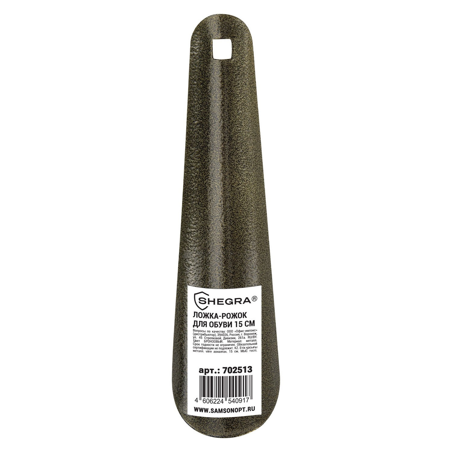 Ложка (рожок) для обуви с ушком МЕТАЛЛИЧЕСКАЯ 15 см, антик БРОНЗА, SHEGRA (ШЕГРА), LUXE, 702513 Код товара: 702513 45,51 ₽ Купить Производитель:SHEGRA Обувная ложка SHEGRA отлично подойдет для любой обуви, обеспечит легкое скольжение и максимальное удобство. Обувная ложка обладает компактной длиной 15 см и толщиной 1,2 мм, что является универсальным решением для всей семьи. Благодаря небольшому весу и компактности ложку удобно взять с собой в поездку, на тренировку, в школу. В зоне захвата имеется отверстие для фиксации, что позволяет повесить изделие на крючок. Ложка выполнена в цвете антик бронза.Производство: РоссияТип товара: ложка для обувиТип крепления: ушкоМатериал: металлКоличество в комплекте: 1 шт.Цвет: бронзовыйДлина: 15 смШирина: 4 смТолщина: 1.2 ммДиаметр отверстия: 7 ммСерия: С ушкомВес: 46 грРазмер упаковки: 3 × 15.2 × 3.6 смПромежуточная упаковка: 96 штТранспортная упаковка: 96 штШтрих-код: 4606224540917 Сертификат-1.jpg Сертификат-2.jpg Сертификат-3.jpg