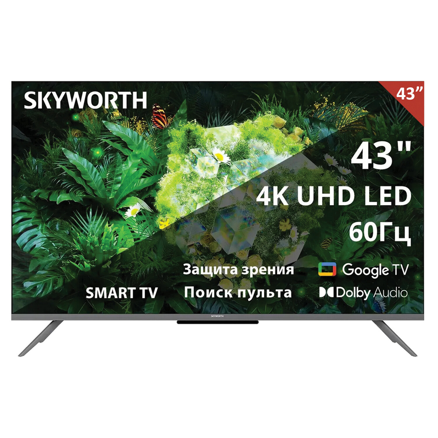 Телевизор SKYWORTH 43G66G, 43" (108 см), 3840x2160, 4K, 16:9, Google TV, Wi-Fi, черный Код товара: 459011 26 683,57 ₽ Купить Производитель:SKYWORTH Представьте: вы устраиваетесь на диване после долгого дня, включаете любимый фильм – и внезапно оказываетесь внутри кадра. Каждая деталь, каждый оттенок, каждый звук оживают с невероятной чёткостью. Это не мечта – это SKYWORTH 43G66G! Его 43-дюймовая LED-панель с разрешением 3840х2160 обеспечивает вчетверо больше деталей по сравнению с Full HD, а технология HDR10 и HLG раскрывает глубину цвета, контраст и яркость в каждой сцене. Благодаря процессору изображения Chameleon Extreme 2.0 картинка становится ещё чище: встроенные алгоритмы цифрового шумоподавления и прогрессивной развёртки делают видео плавным и реалистичным. Угол обзора 178°/178° и яркость 250 кд/м2 гарантируют комфортный просмотр в любое время суток и с любого места в комнате. Звук передаётся через двухканальную систему (2х10 Вт) с поддержкой Dolby Atmos, Dolby Digital и Dolby Digital Plus – вы услышите каждый оттенок саундтрека с потрясающей чёткостью. На борту – актуальная платформа Google TV с голосовым управлением через Google Assistant, возможностью транслировать контент со смартфона, персонализированными Daily Shortcuts и детским профилем. С 2 ГБ ОЗУ и 16 ГБ встроенной памяти телевизор работает быстро и стабильно, легко справляясь с множеством приложений. Он оснащён тремя HDMI 2.0, двумя USB, оптическим аудиовыходом, Ethernet, CI+ и двумя антенными входами, поддерживает все форматы вещания (DVB-T/T2, DVB-C, DVB-S/S2) и легко интегрируется в умный дом через экосистему Google. Для здоровья глаз предусмотрены технологии Low Blue Light, Flicker Free, ночной режим и датчик освещённости, а удобные мелочи – антибактериальный пульт с Bluetooth, функция поиска пульта и игровой режим Game Console – делают использование ещё комфортнее. Тонкий безрамочный корпус в чёрно-сером исполнении и крепление VESA (200х200) позволяют органично вписать телевизор в любой интерьер. Производитель оставляет за собой право без предварительного уведомления вносить изменения в технические характеристики, комплектацию и конструкцию, не ухудшающие эксплуатационные характеристики изделия.Производство: БеларусьТип экрана: Direct LEDДиагональ экрана: 43" (109 см)Разрешение экрана: 3840x2160 pixФормат экрана: 16:9Поддержка HDTV: 4K UHDПоддержка HDR: даПоддержка Smart TV: даПлатформа Smart TV: Google TVМощность звука: 20 ВтWi-Fi: даЦифровые тюнеры: DVB-C, DVB-S, DVB-S2, DVB-T, DVB-T2Количество HDMI-портов: 3 шт.Поддержка HDMI 2.0: даКоличество USB-портов: 2 шт.Воспроизведение с внешних носителей: даВозможность крепления на стену: даРазмер VESA: 200x200 ммСерия: G66GКомплектация: документация, кабель питания, пульт ДУЦвет корпуса: черныйШирина без подставки: 957 ммВысота без подставки: 570 ммГлубина без подставки: 81 ммВес без подставки: 6.05 кгШирина с подставкой: 957 ммВысота с подставкой: 616 ммГлубина с подставкой: 194 ммВес с подставкой (без упаковки): 6.15 кгВес: 5,55 кгРазмер упаковки: 12 × 65 × 104 смОбъём: 0.0811 м3Промежуточная упаковка: 1 штТранспортная упаковка: 1 штШтрих-код: 4895018245095