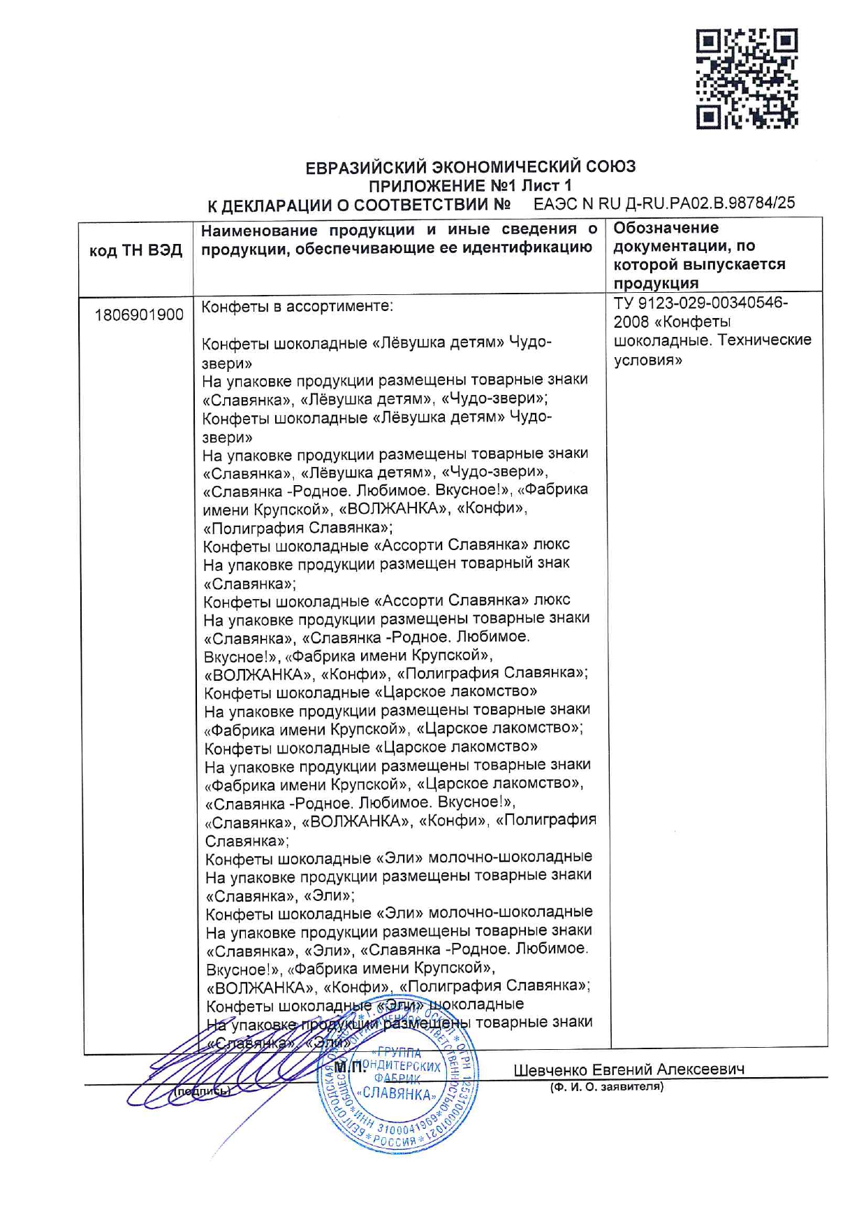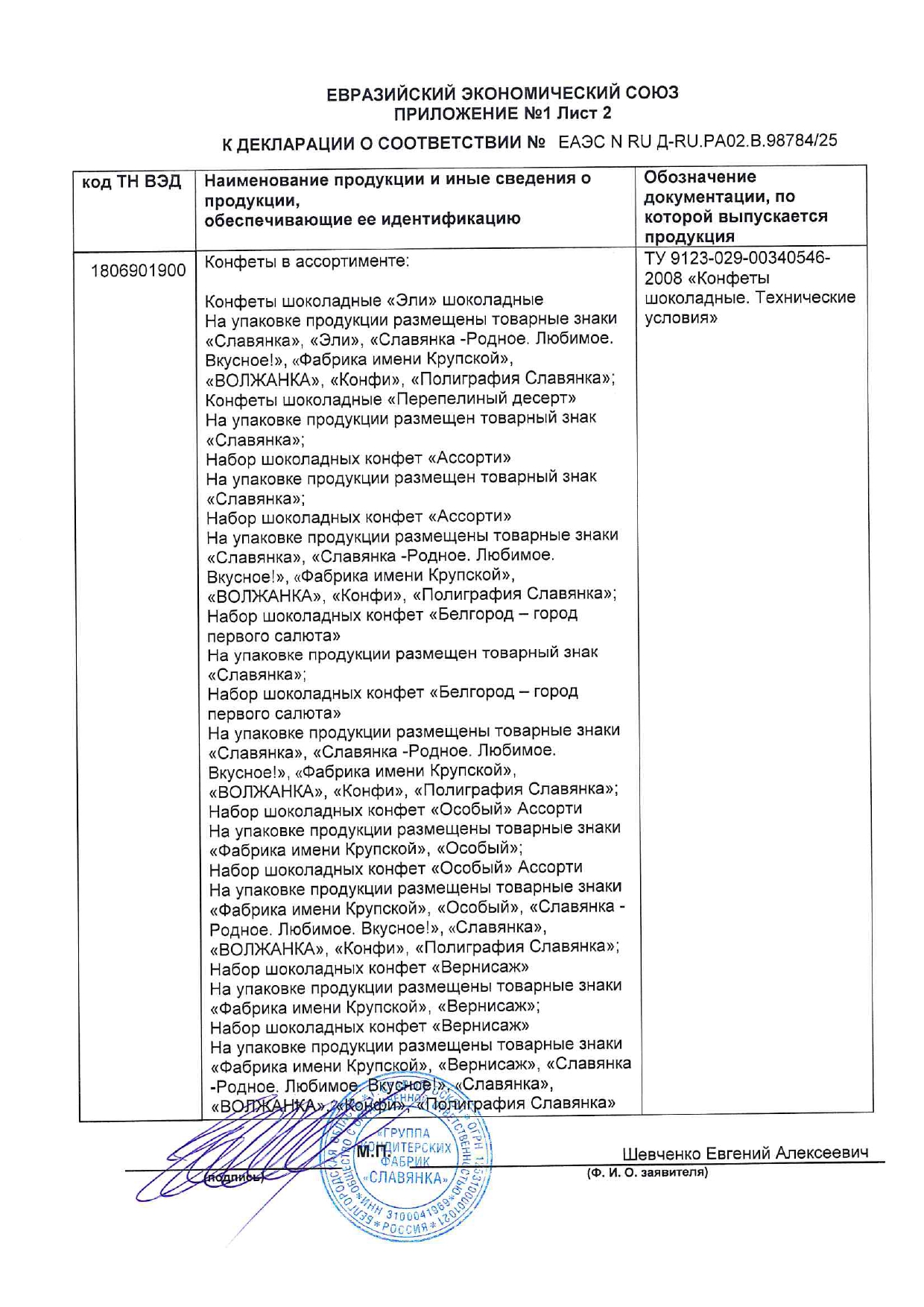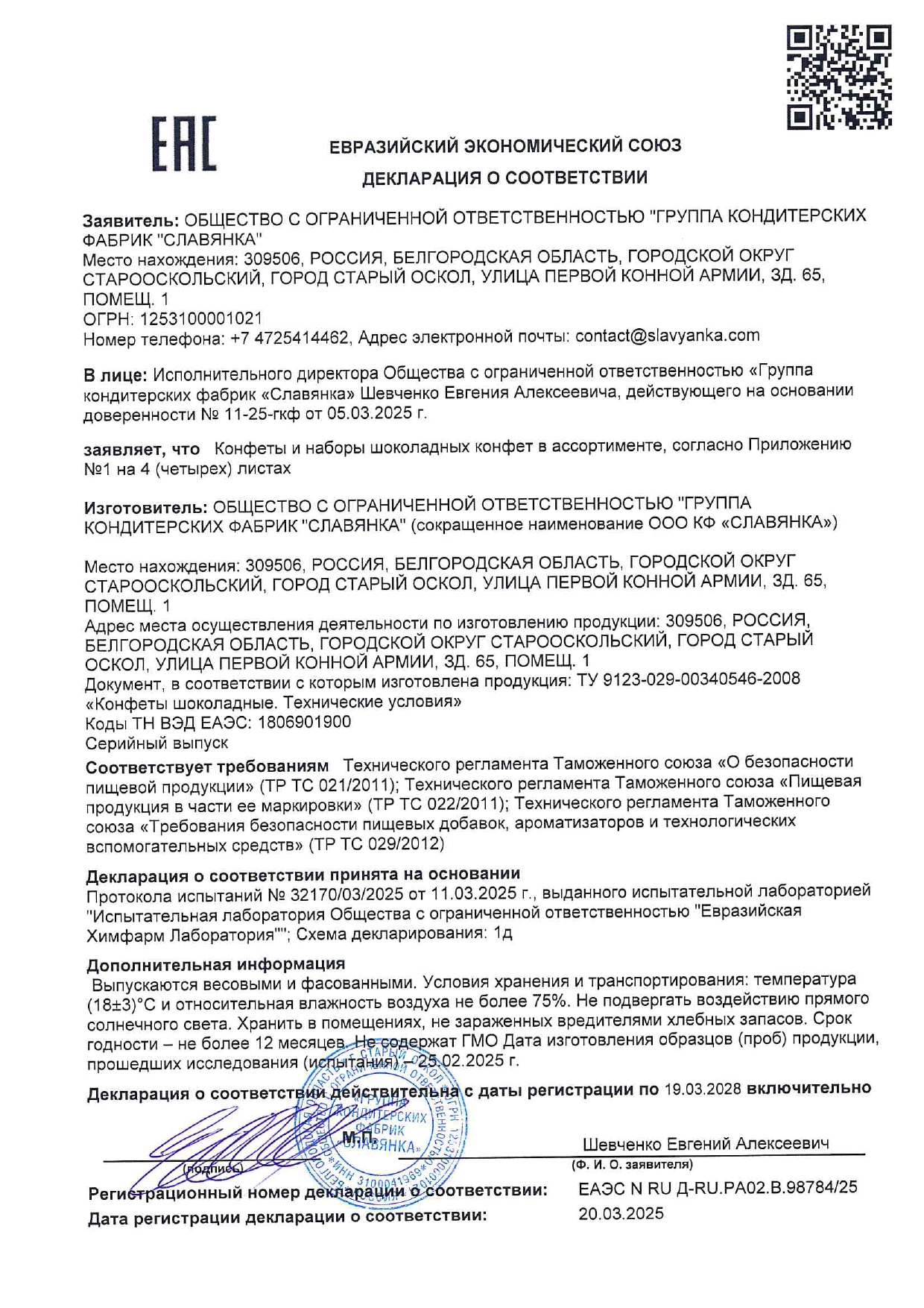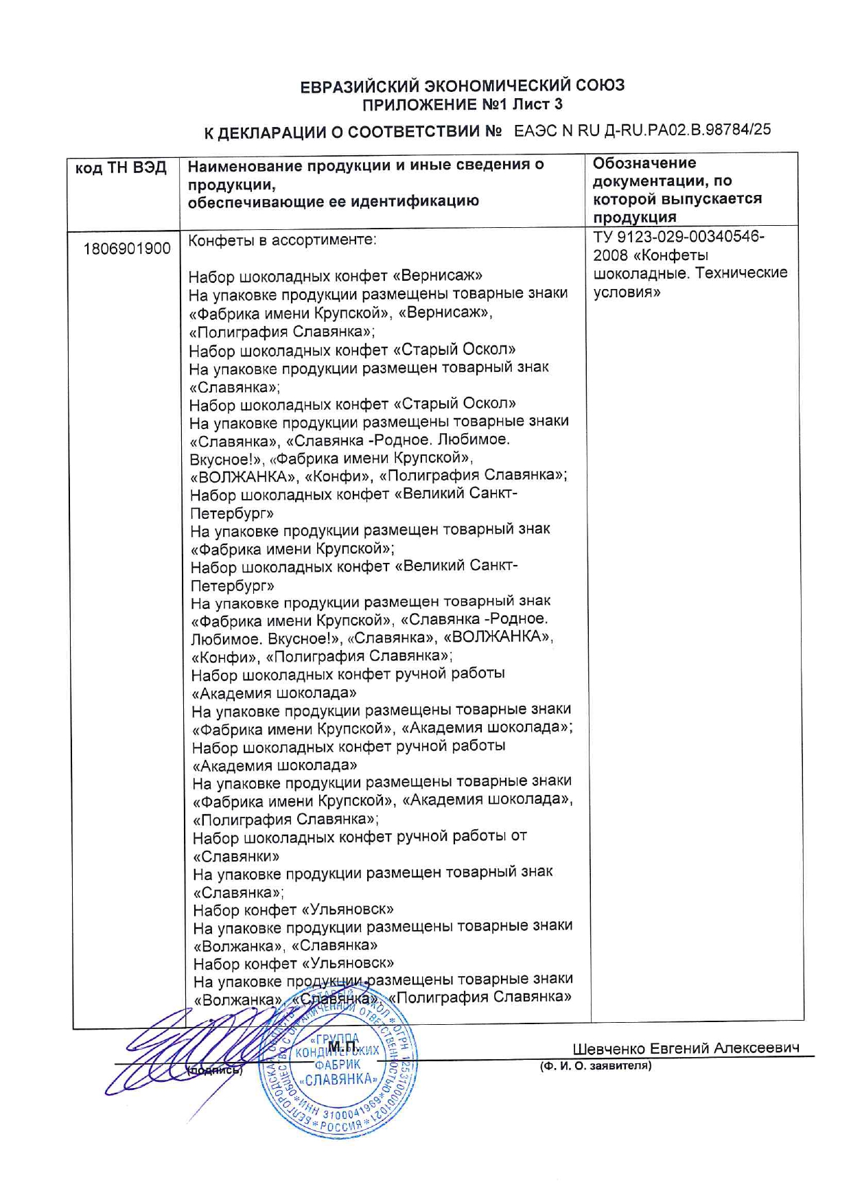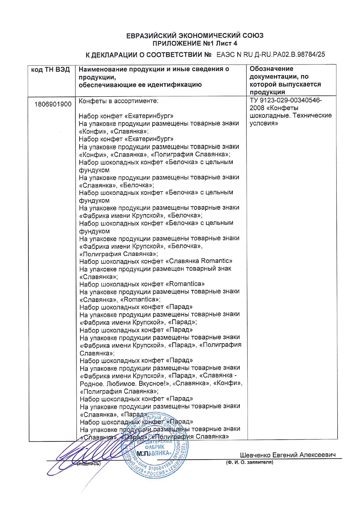 Конфеты шоколадные СЛАВЯНКА "Эли" с шоколадной начинкой, 1000 г Код товара: 624633 1 202,95 ₽ Купить Производитель:СЛАВЯНКА Конфеты шоколадные СЛАВЯНКА "Эли" – это идеальное лакомство для истинных ценителей сладостей. Оболочка из твердого молочного шоколада, начинка – нежная шоколадная паста. Состав: сахар, молоко цельное сгущённое с сахаром (молоко нормализованное, сахара (сахароза, лактоза)), патока, какао тёртое, сыворотка молочная сухая, эквивалент масла какао (масла растительные, эмульгатор лецитины), жир растительный (масла растительные, антиокислитель концентрат смеси токоферолов), спирт этиловый ректификованный, эмульгаторы (лецитин соевый, эфиры полиглицерина и взаимоэтерифицированных рициноловых кислот), молоко сухое обезжиренное, молоко цельное сухое, ароматизатор, соль.Производство: РоссияВес нетто: 1000 гУпаковка: мягкий пакетВид начинки: молочный шоколадВкус: "Эли" с шоколадной начинкойСрок годности: 9 мес.Фирма-производитель: "Славянка КФ"Срок годности: 9 месВес: 1,07 кгРазмер упаковки: 5.6 × 23.3 × 19.3 смОбъём: 0.0032 м3Промежуточная упаковка: 6 штТранспортная упаковка: 6 штШтрих-код: 4605142021317 Файлы Сертификат-1.jpg Сертификат-2.jpg Сертификат-3.jpg Сертификат-4.jpg Сертификат-5.jpg Сертификат-6.jpg Сертификат-7.jpg