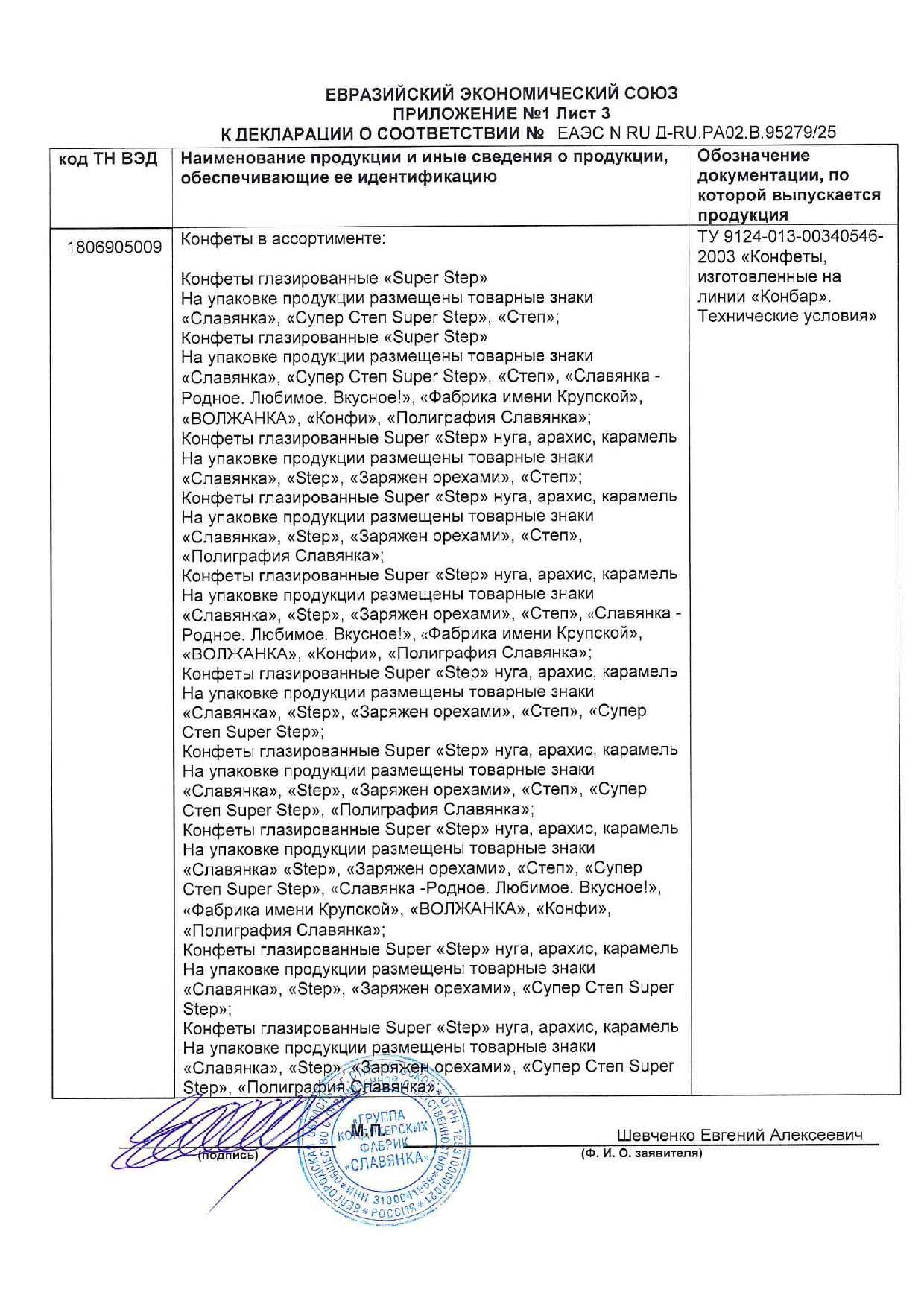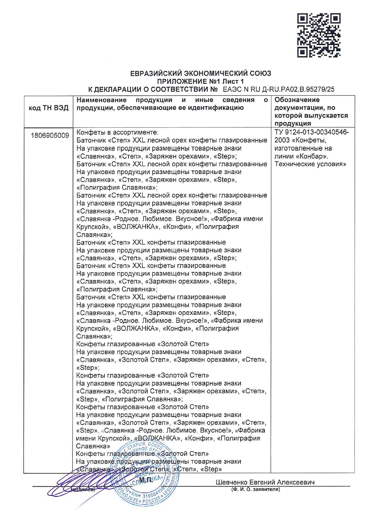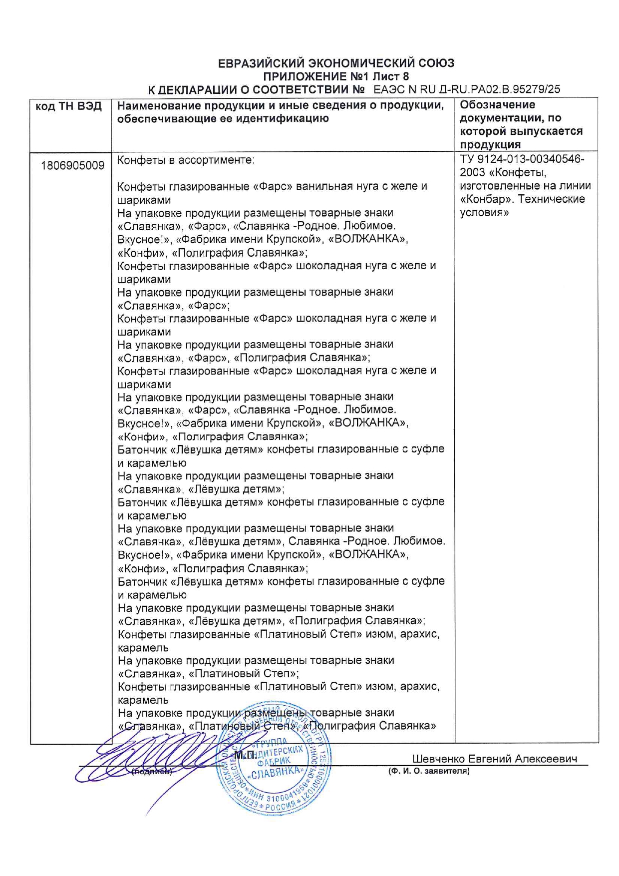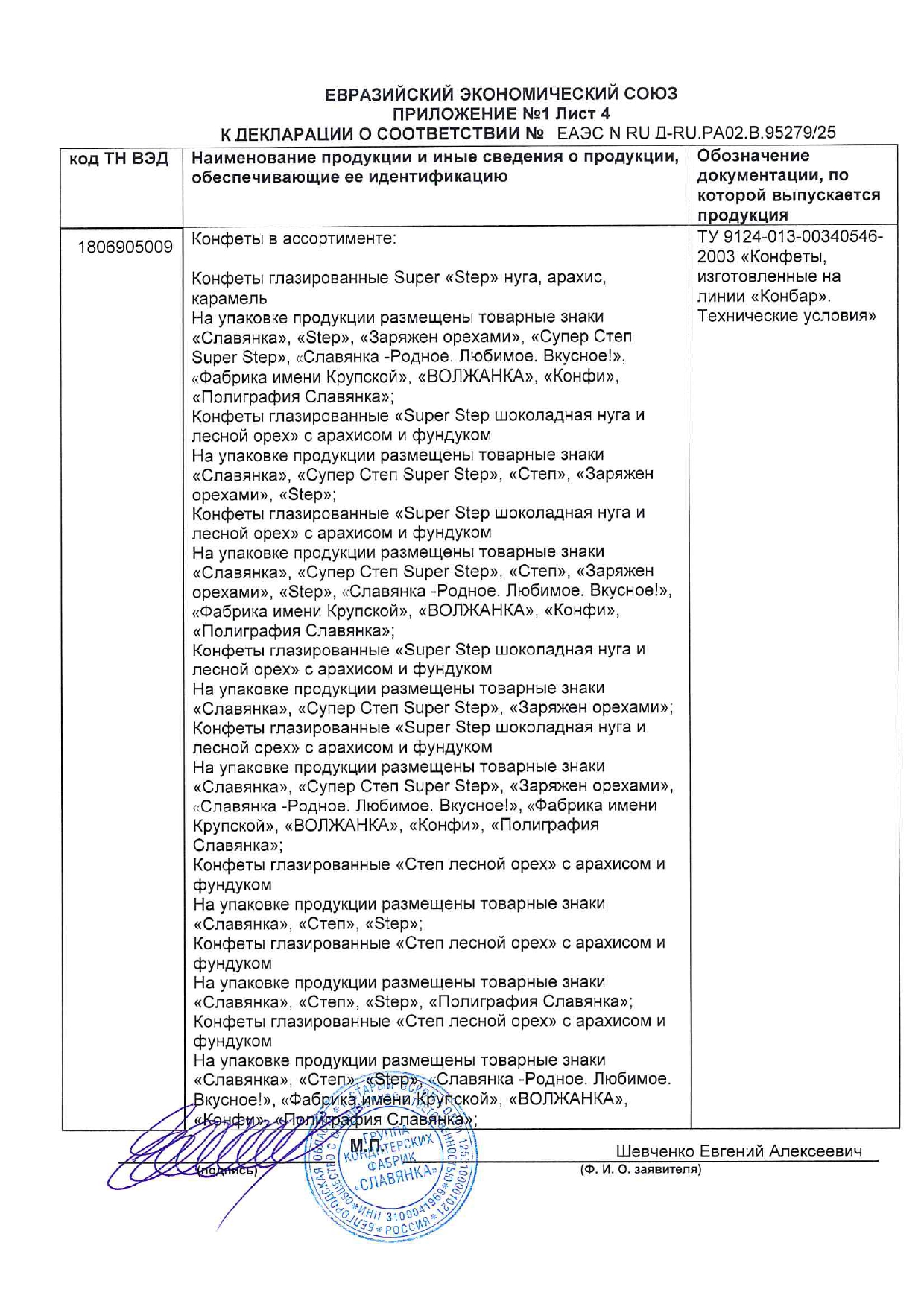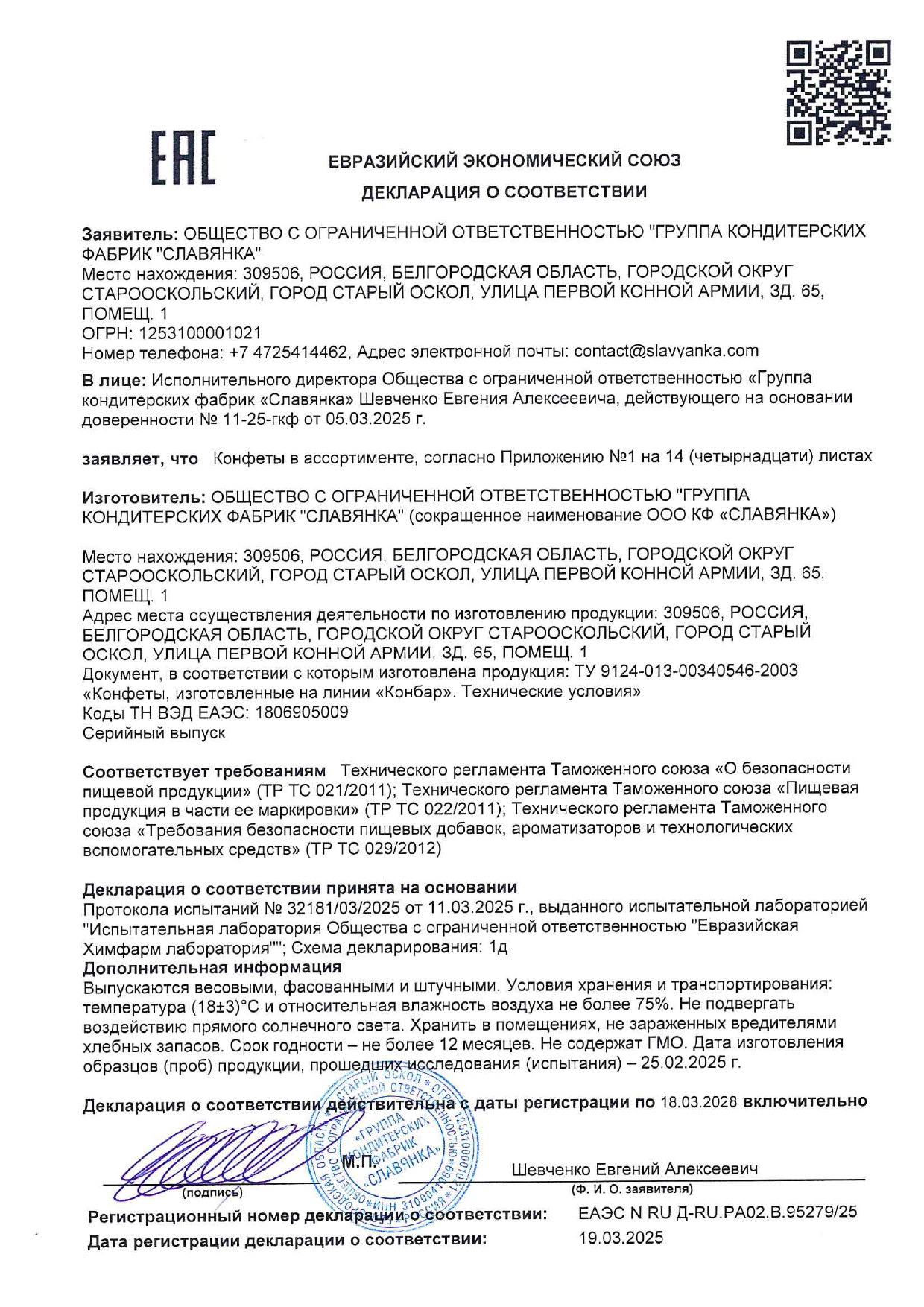 Конфеты глазированные СЛАВЯНКА "Сласть", шоколадная нуга с карамелью, 1000 г Код товара: 624641 623,62 ₽ Купить Производитель:СЛАВЯНКА Конфеты глазированные СЛАВЯНКА "Сласть" – это сочетание шоколадной нуги и карамели, которое подарит вам истинное наслаждение. Состав: патока, сахар, молоко цельное сгущенное с сахаром (молоко нормализованное, сахара (сахароза, лактоза)), эквивалент масла какао (масла растительные, эмульгатор лецитин подсолнечный), какао тёртое, жир растительный (масла растительные, эмульгатор лецитин соевый, антиокислители (Е319, лимонная кислота)), сыворотка молочная сухая, яичные продукты, заменитель масла какао (масла растительные, эмульгаторы (Е492, лецитин соевый), антиокислитель концентрат смеси токоферолов), молоко сухое обезжиренное, соль, какао-порошок, эмульгаторы (лецитин соевый, эфиры полиглицерина и взаимоэтерифицированных рициноловых кислот), ароматизаторы.Производство: РоссияВес нетто: 1000 гУпаковка: мягкий пакетВид начинки: карамель, нугаВкус: "Сласть" нуга с карамельюСрок годности: 8 мес.Фирма-производитель: "Славянка КФ"Срок годности: 8 месВес: 1,07 кгРазмер упаковки: 5.9 × 26.3 × 21.3 смОбъём: 0.0036 м3Промежуточная упаковка: 6 штТранспортная упаковка: 6 штШтрих-код: 4605142021072 Файлы Сертификат-1.jpg Сертификат-2.jpg Сертификат-3.jpg Сертификат-4.jpg Сертификат-5.jpg Сертификат-6.jpg Сертификат-7.jpg Сертификат-8.jpg Сертификат-9.jpg Сертификат-10.jpg Сертификат-11.jpg Сертификат-12.jpg Сертификат-13.jpg Сертификат-14.jpg Сертификат-15.jpg Сертификат-16.jpg Сертификат-17.jpg