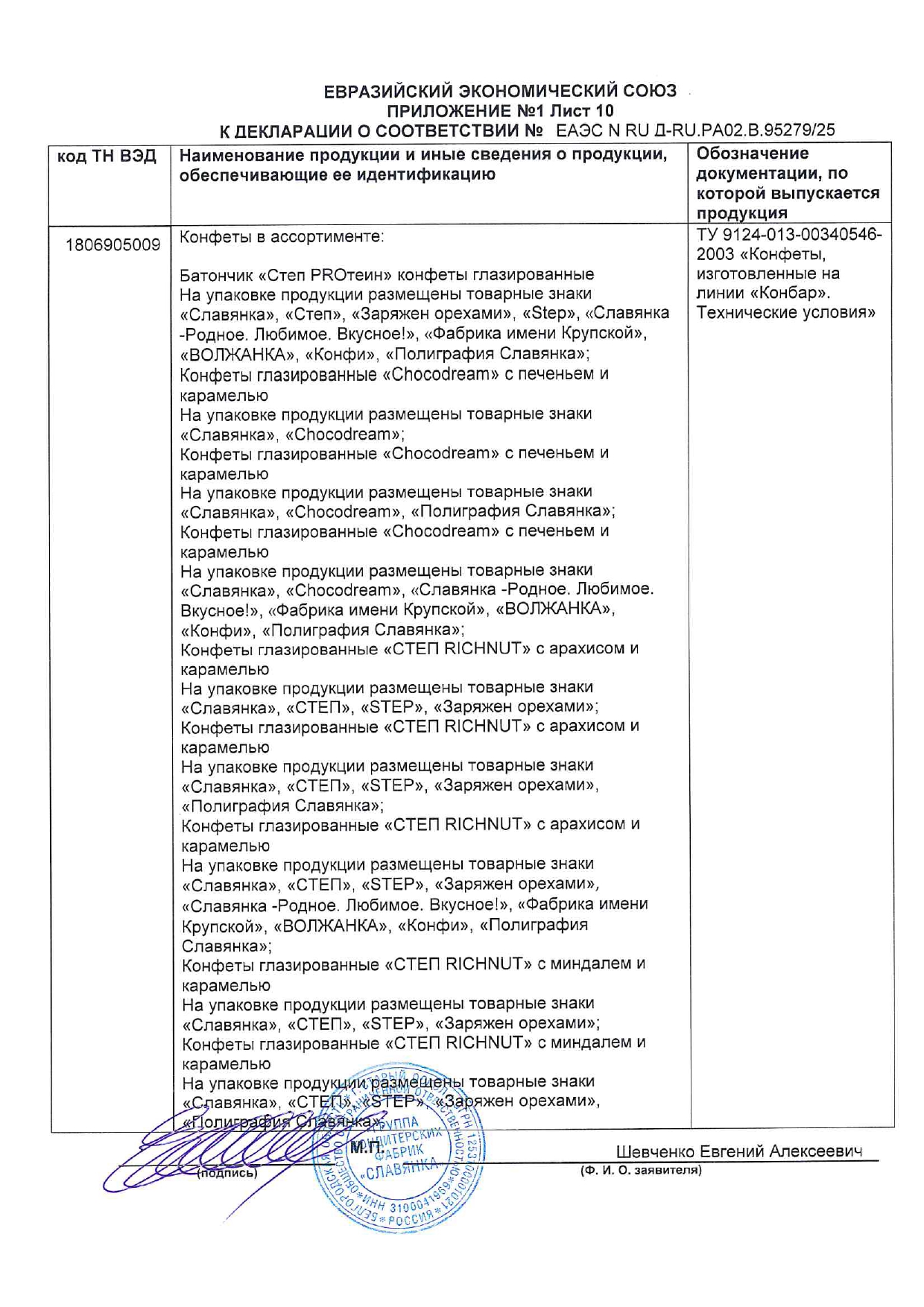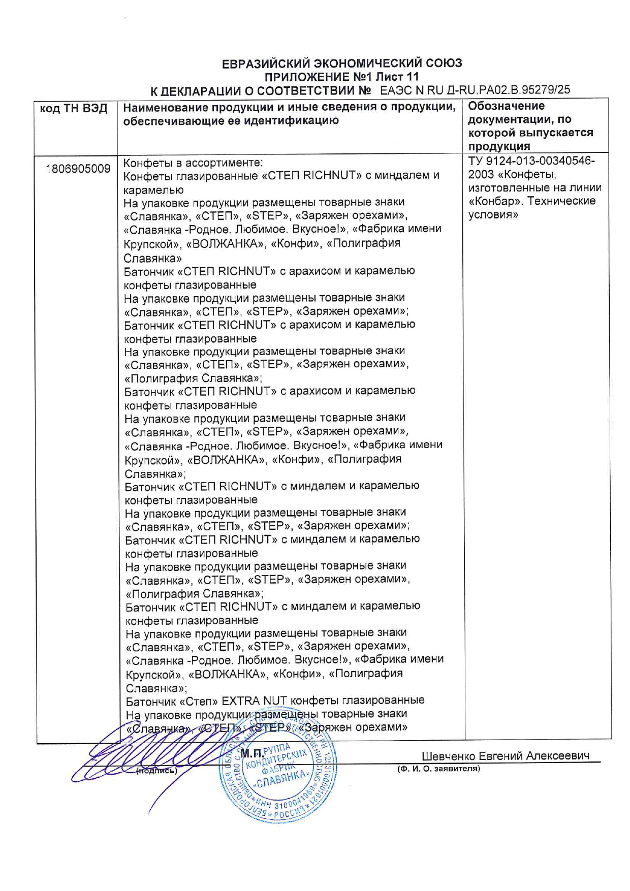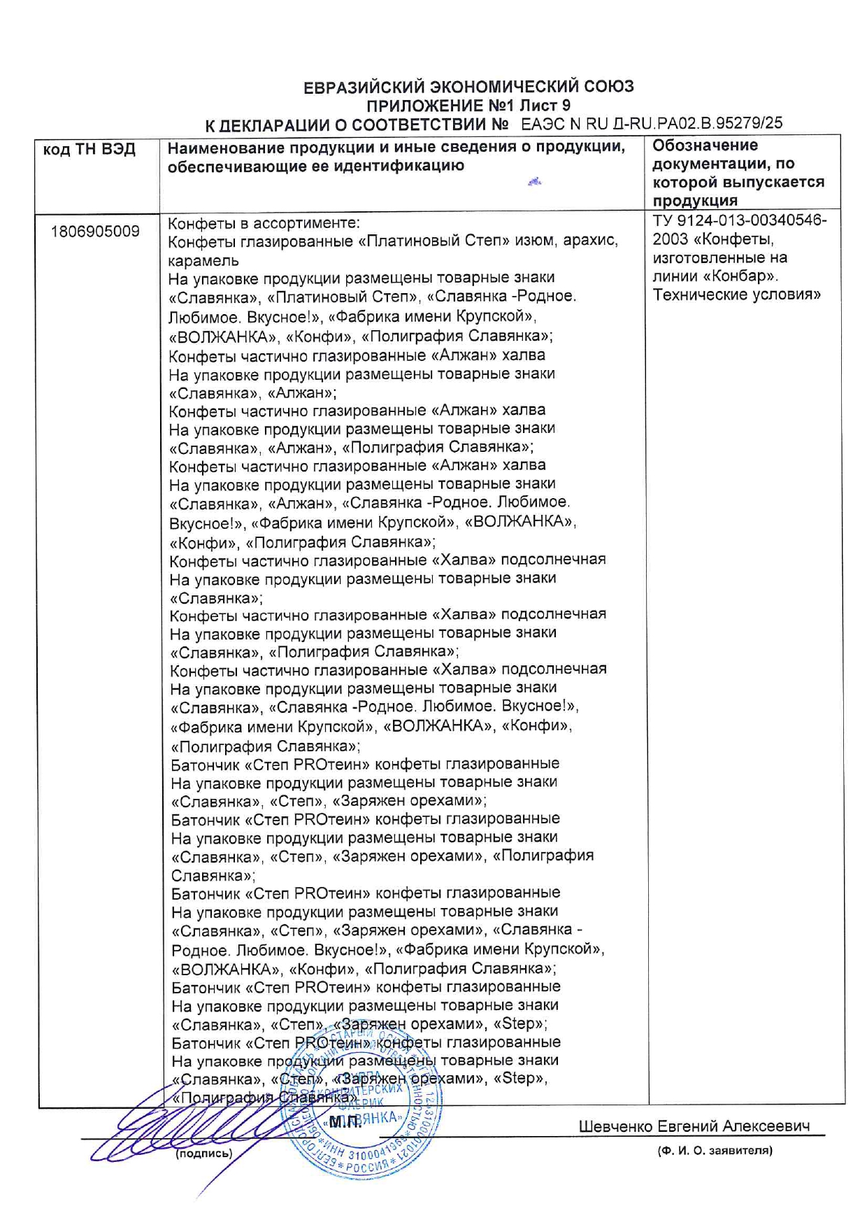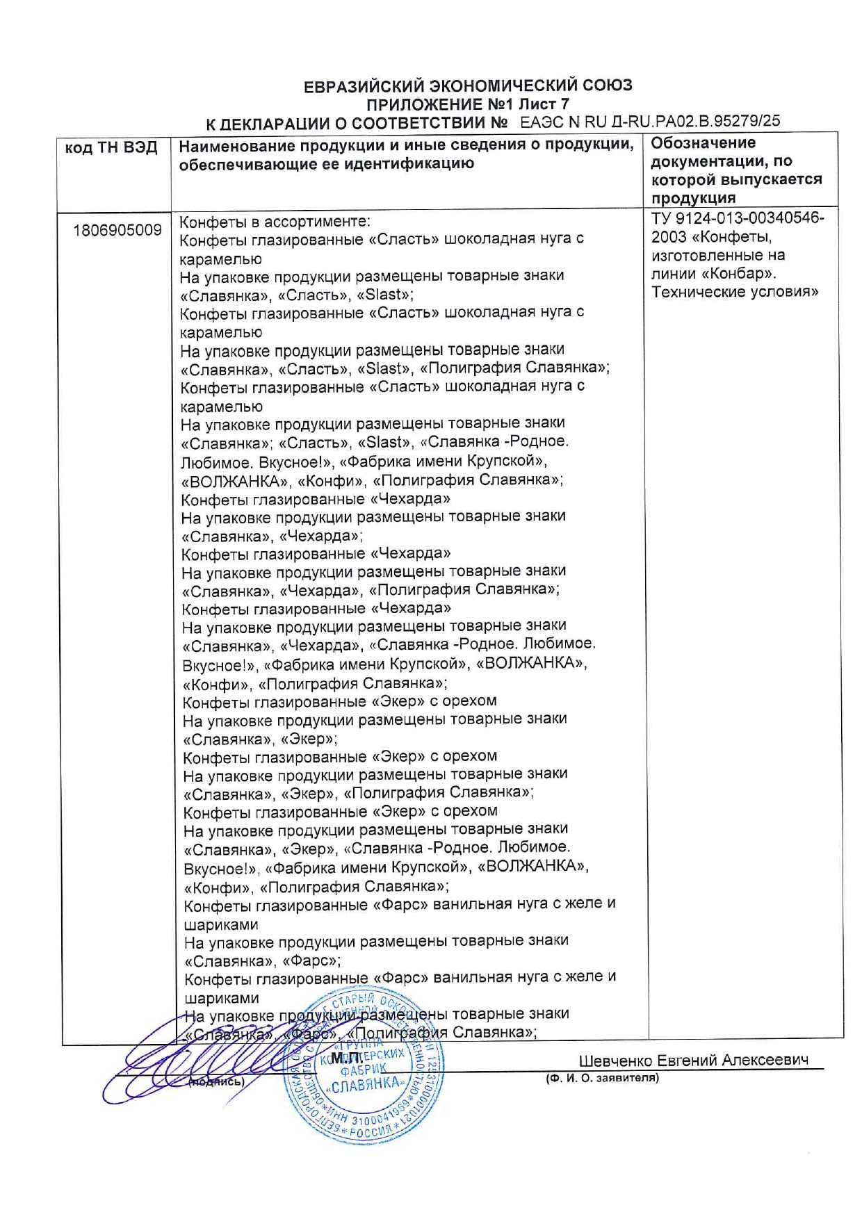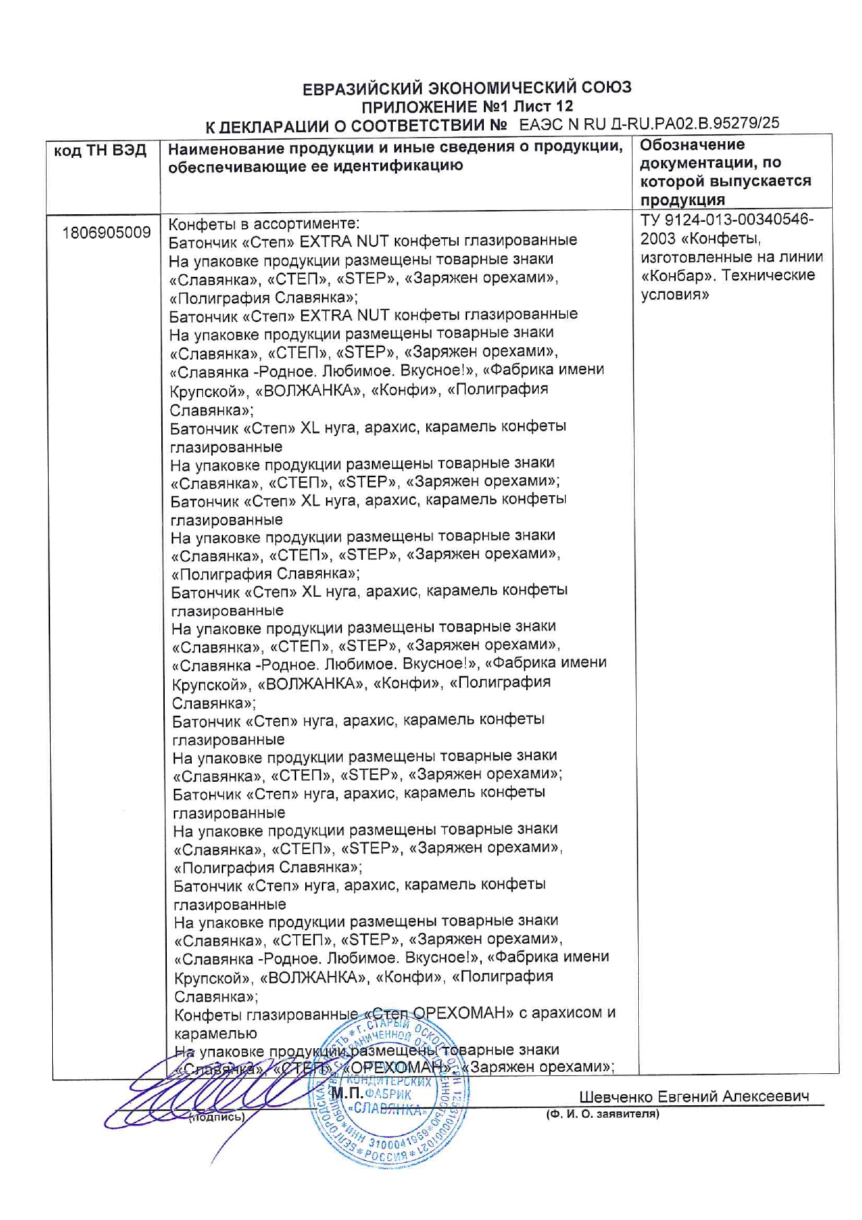 Конфеты глазированные СЛАВЯНКА "Сласть", шоколадная нуга с карамелью, 1000 г Код товара: 624641 623,62 ₽ Купить Производитель:СЛАВЯНКА Конфеты глазированные СЛАВЯНКА "Сласть" – это сочетание шоколадной нуги и карамели, которое подарит вам истинное наслаждение. Состав: патока, сахар, молоко цельное сгущенное с сахаром (молоко нормализованное, сахара (сахароза, лактоза)), эквивалент масла какао (масла растительные, эмульгатор лецитин подсолнечный), какао тёртое, жир растительный (масла растительные, эмульгатор лецитин соевый, антиокислители (Е319, лимонная кислота)), сыворотка молочная сухая, яичные продукты, заменитель масла какао (масла растительные, эмульгаторы (Е492, лецитин соевый), антиокислитель концентрат смеси токоферолов), молоко сухое обезжиренное, соль, какао-порошок, эмульгаторы (лецитин соевый, эфиры полиглицерина и взаимоэтерифицированных рициноловых кислот), ароматизаторы.Производство: РоссияВес нетто: 1000 гУпаковка: мягкий пакетВид начинки: карамель, нугаВкус: "Сласть" нуга с карамельюСрок годности: 8 мес.Фирма-производитель: "Славянка КФ"Срок годности: 8 месВес: 1,07 кгРазмер упаковки: 5.9 × 26.3 × 21.3 смОбъём: 0.0036 м3Промежуточная упаковка: 6 штТранспортная упаковка: 6 штШтрих-код: 4605142021072 Файлы Сертификат-1.jpg Сертификат-2.jpg Сертификат-3.jpg Сертификат-4.jpg Сертификат-5.jpg Сертификат-6.jpg Сертификат-7.jpg Сертификат-8.jpg Сертификат-9.jpg Сертификат-10.jpg Сертификат-11.jpg Сертификат-12.jpg Сертификат-13.jpg Сертификат-14.jpg Сертификат-15.jpg Сертификат-16.jpg Сертификат-17.jpg