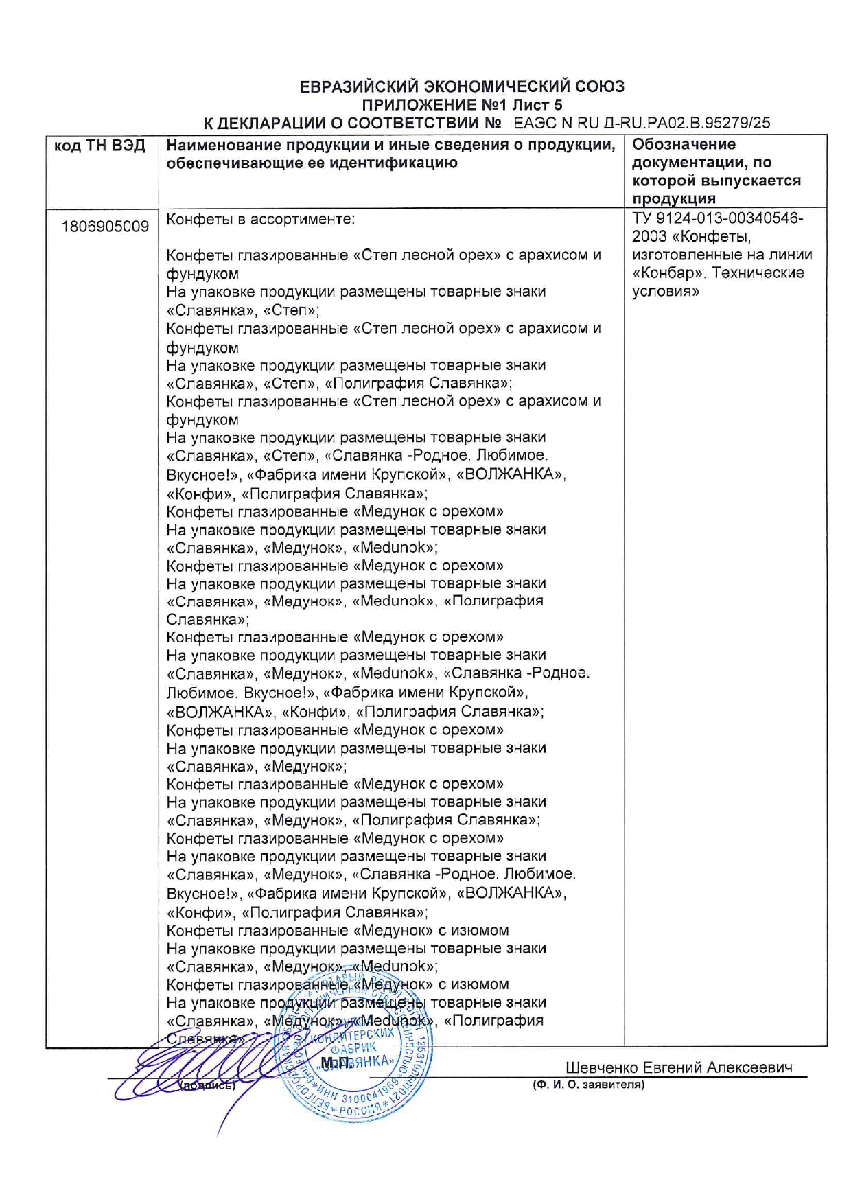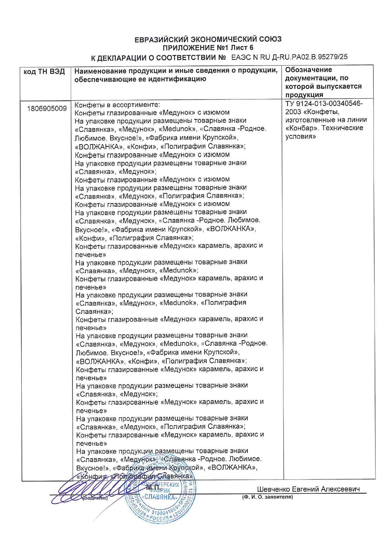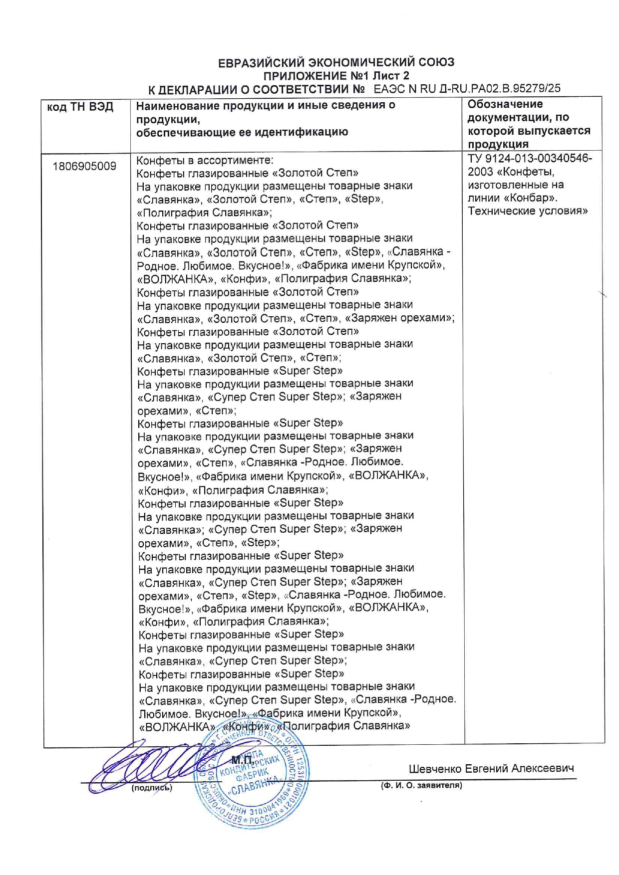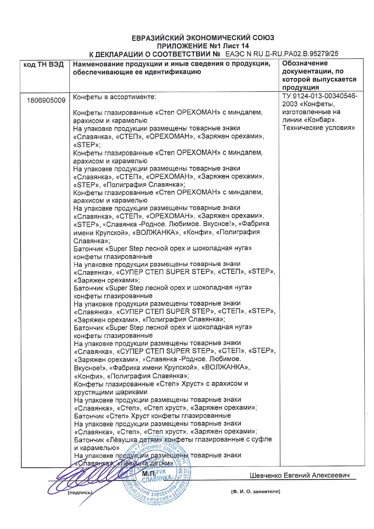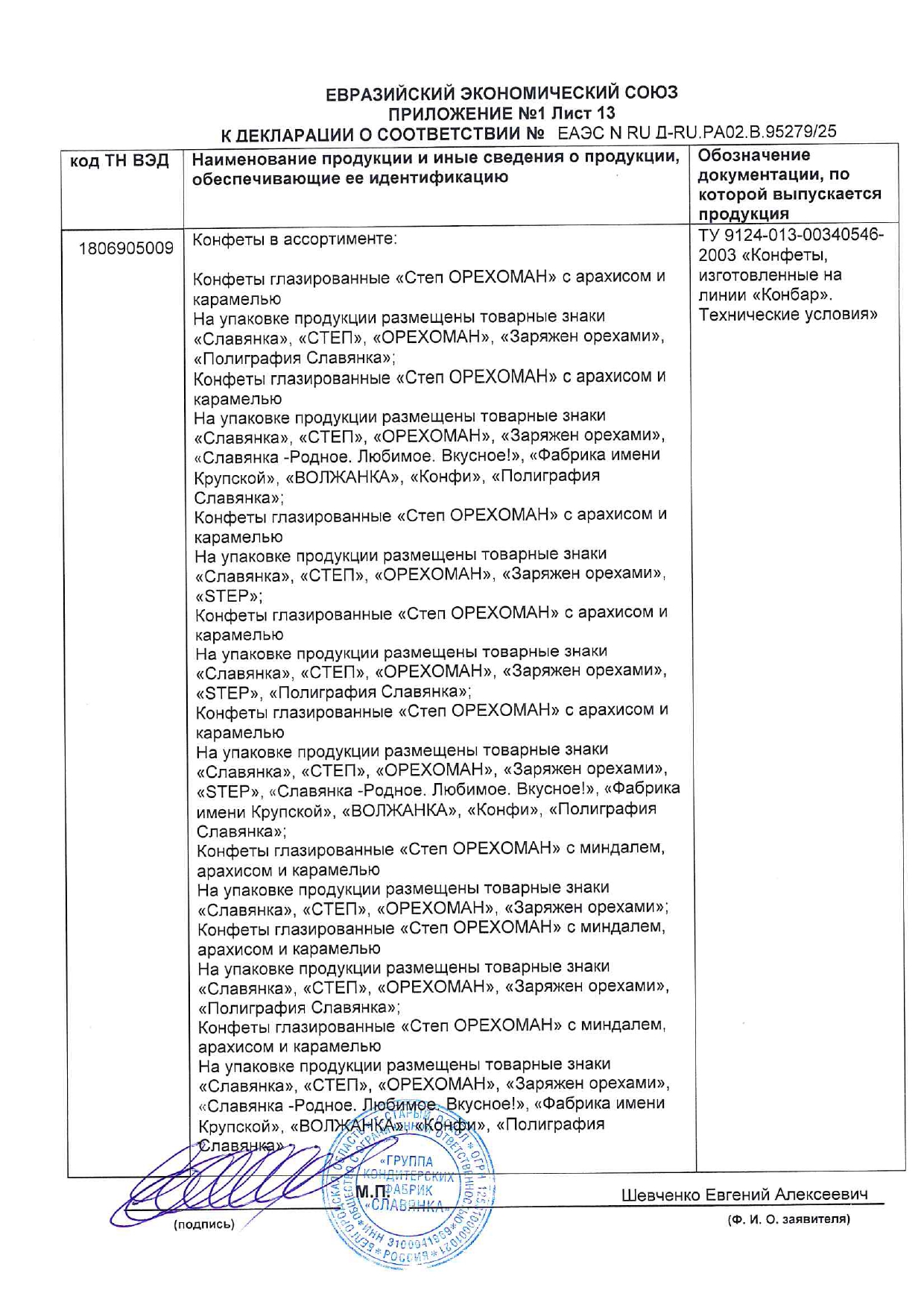 Конфеты глазированные СЛАВЯНКА "Сласть", шоколадная нуга с карамелью, 1000 г Код товара: 624641 623,62 ₽ Купить Производитель:СЛАВЯНКА Конфеты глазированные СЛАВЯНКА "Сласть" – это сочетание шоколадной нуги и карамели, которое подарит вам истинное наслаждение. Состав: патока, сахар, молоко цельное сгущенное с сахаром (молоко нормализованное, сахара (сахароза, лактоза)), эквивалент масла какао (масла растительные, эмульгатор лецитин подсолнечный), какао тёртое, жир растительный (масла растительные, эмульгатор лецитин соевый, антиокислители (Е319, лимонная кислота)), сыворотка молочная сухая, яичные продукты, заменитель масла какао (масла растительные, эмульгаторы (Е492, лецитин соевый), антиокислитель концентрат смеси токоферолов), молоко сухое обезжиренное, соль, какао-порошок, эмульгаторы (лецитин соевый, эфиры полиглицерина и взаимоэтерифицированных рициноловых кислот), ароматизаторы.Производство: РоссияВес нетто: 1000 гУпаковка: мягкий пакетВид начинки: карамель, нугаВкус: "Сласть" нуга с карамельюСрок годности: 8 мес.Фирма-производитель: "Славянка КФ"Срок годности: 8 месВес: 1,07 кгРазмер упаковки: 5.9 × 26.3 × 21.3 смОбъём: 0.0036 м3Промежуточная упаковка: 6 штТранспортная упаковка: 6 штШтрих-код: 4605142021072 Файлы Сертификат-1.jpg Сертификат-2.jpg Сертификат-3.jpg Сертификат-4.jpg Сертификат-5.jpg Сертификат-6.jpg Сертификат-7.jpg Сертификат-8.jpg Сертификат-9.jpg Сертификат-10.jpg Сертификат-11.jpg Сертификат-12.jpg Сертификат-13.jpg Сертификат-14.jpg Сертификат-15.jpg Сертификат-16.jpg Сертификат-17.jpg