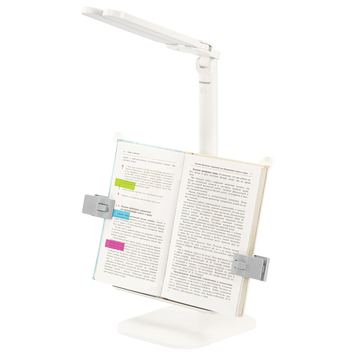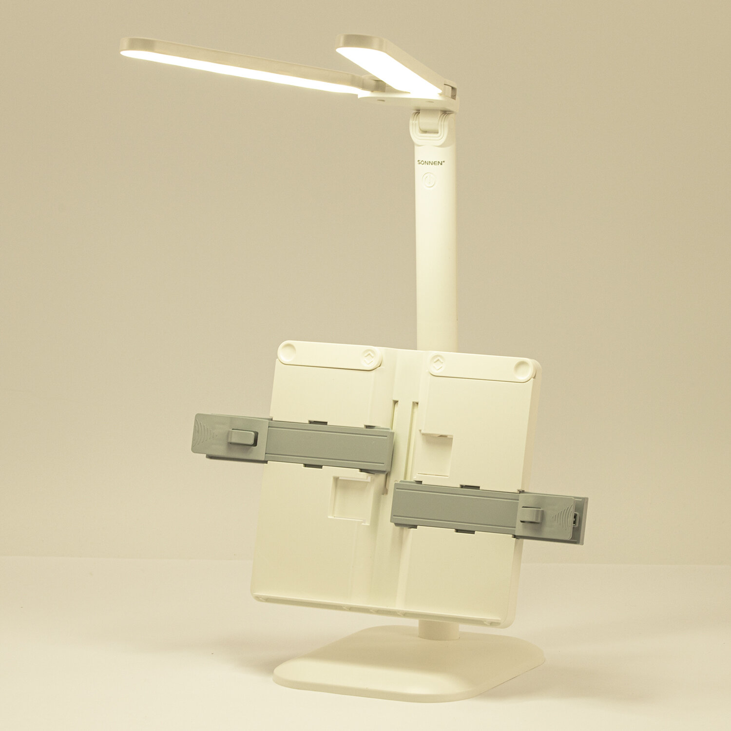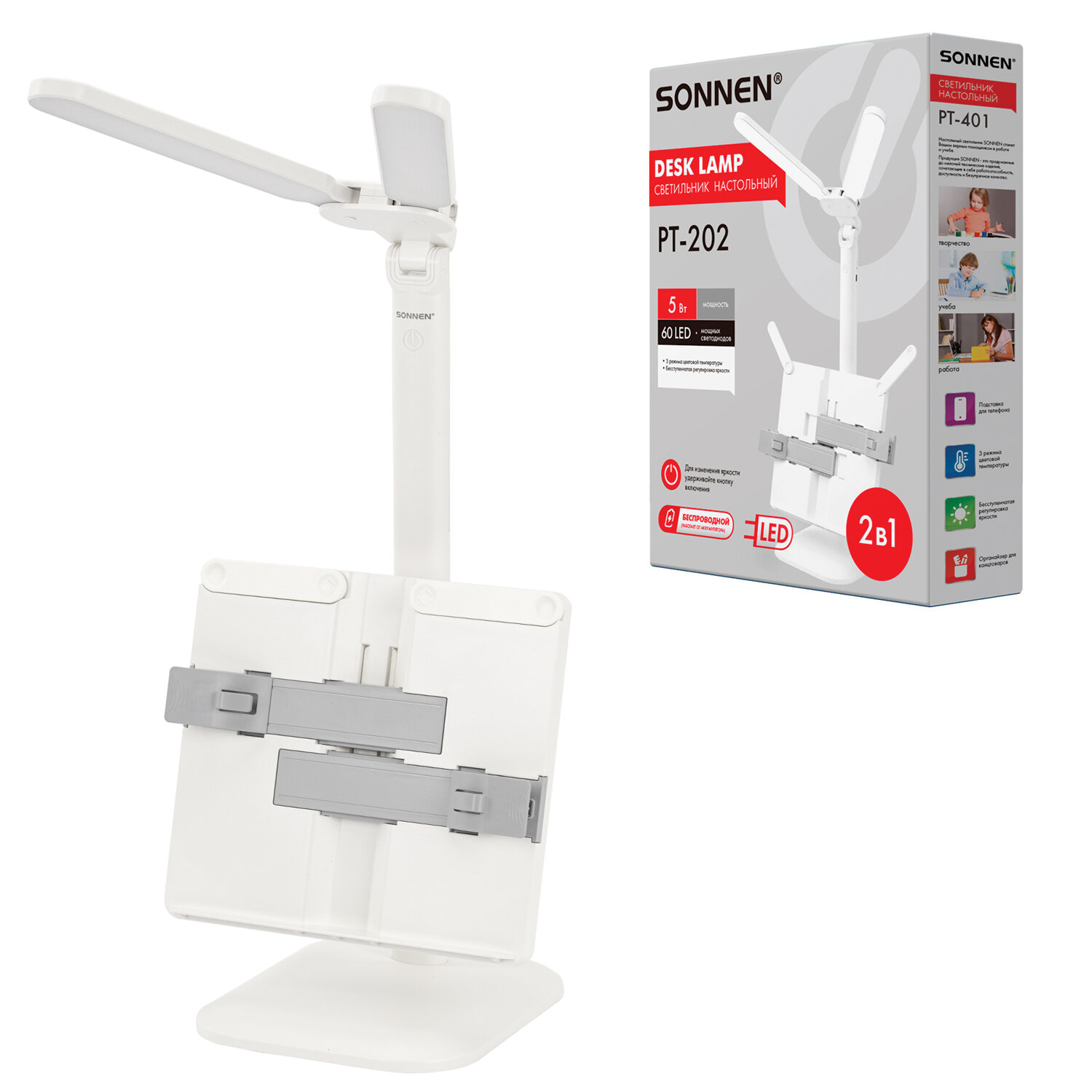 Настольная лампа / светильник беспроводная SONNEN PT-202, подставка для книг, USB, LED, 5 Вт, 3 режима Код товара: 238780 1 038,45 ₽ Купить Производитель:SONNEN Настольная лампа-светильник SONNEN PT-202 предназначена для освещения рабочего места в офисе или дома. Конструкция светильника обеспечивает произвольную регулировку направления света. Многофункциональный светодиодный светильник 5 Вт – идеальное решение для офиса и дома. Светильник оснащен 60 яркими диодами, что обеспечивает равномерное освещение и бережную нагрузку на глаза при длительной работе. Три режима цветовой температуры (тёплый, нейтральный, холодный свет) и бесступенчатая регулировка яркости позволяют настроить свет под любую задачу и время суток. Интегрированная подставка для книг позволит удобно расположить печатные издания перед собой. Встроенный аккумулятор обеспечит бесперебойную работу светильника.Производство: КитайТип лампы: светодиоднаяТип крепления: подставкаМощность: 5 ВтЦоколь: нетНазначение: универсальныйСерия: PT-20Цветность света: нейтральный белый - 3500-4500 К, теплый белый - 2700-3400 К, холодный белый - от 6100 и болееСветовой поток: 450 ЛюменКол-во режимов свечения: 3Источник света: 60 LEDИсточник питания: сеть, аккумуляторРасположение кнопки выключателя: на корпусеСенсорный выключатель: даПроизвольная регулировка направления подсветки: даОтсутствие мерцания и шумов: даСкладная конструкция: даВысота: 53 смДлина шнура: 1.2 мМатериал корпуса: пластикЦвет корпуса: белыйВес: 791 грРазмер упаковки: 8.2 × 28.4 × 22.2 смОбъём: 0.006 м3Промежуточная упаковка: 24 штТранспортная упаковка: 24 штШтрих-код: 4606224465968 Сертификат-1.jpg Сертификат-2.jpg