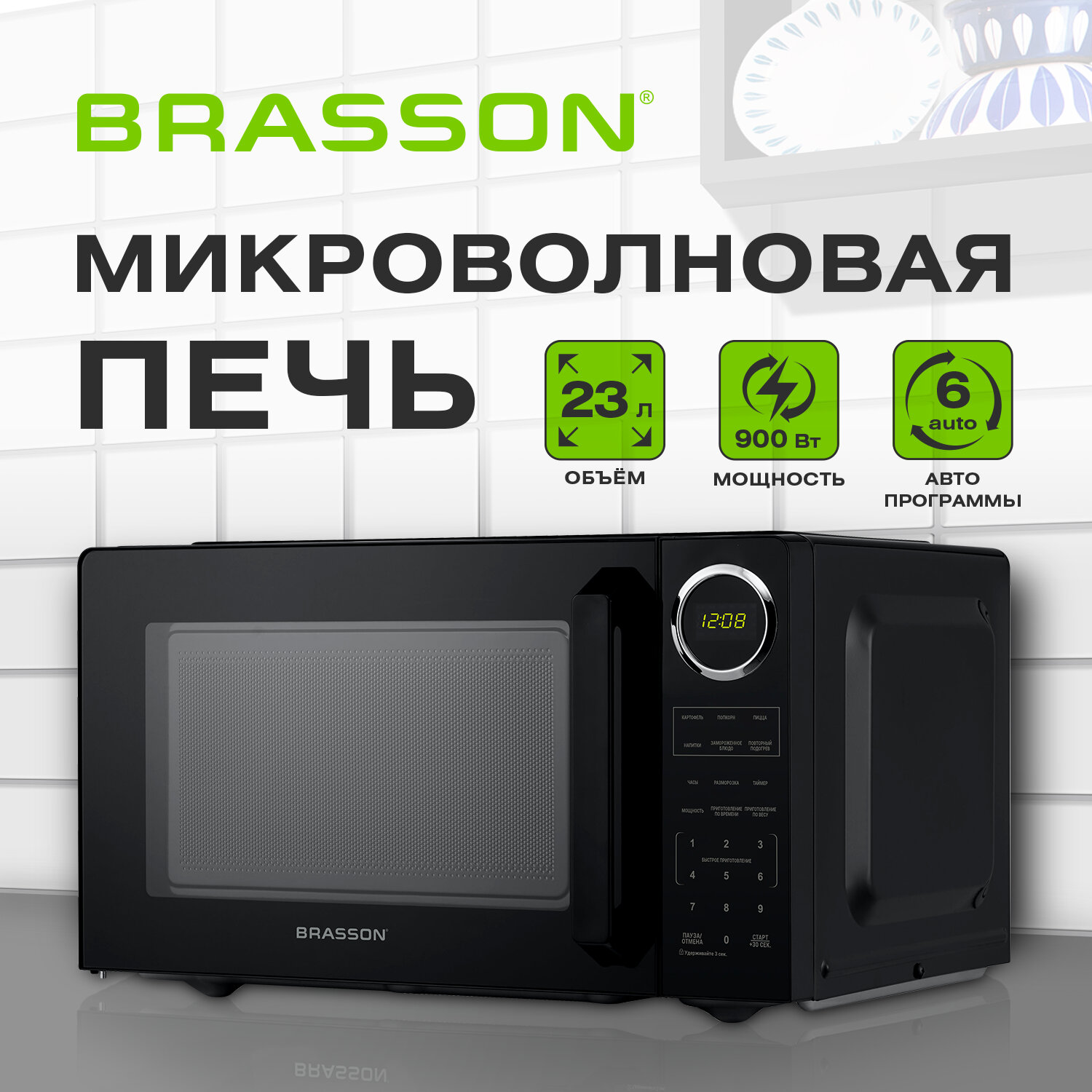 Микроволновая печь BRASSON (БРАССОН) MW2390D-6BL, 23 л, 900 Вт, сенсорное управление, дисплей, таймер, 6 АВТОПРОГРАММ, черная Код товара: 454980 8 725,66 ₽ Купить Производитель:BRASSON Микроволновая печь BRASSON MW2390D-6BL с легкостью выполнит все ваши кулинарные запросы. Мощная, вместительная и надежная – она надолго станет вашим главным помощником на кухне. Микроволновая печь BRASSON MW2390D-6BL имеет мощность 900 Вт и объем 23 литра. Печь вместительна, при этом не займет много места на кухне за счет эргономичной сборки. Вы можете выбрать более 11 режимов мощности, что позволяет сохранить сочность, а также равномерно разогреть блюда. На корпусе расположена интуитивно понятная сенсорная панель управления. С ее помощью вы можете регулировать подогрев, приготовления, разморозку продуктов и выбирать из 6 автоматических программ. Автопрограммы значительно упрощают процесс приготовления блюд и делают его более удобным и эффективным. Яркий дисплей показывает время, оставшееся время приготовления, номер автопрограммы и режим мощности. Диаметр внутренней тарелки – 270 мм: на ней можно готовить и разогревать крупные и объемные блюда. Микроволновая печь имеет функцию защиты от детей, которая предотвращает случайные включения изделия и помогает защитить ребенка от ожогов.Производство: КитайОбъем: 23 лМощность микроволн: 900 ВтУправление: электронноеВнутреннее покрытие: эмалированная стальФункционал: автоматическая разморозка, автоприготовление, режим размораживанияДисплей: даТаймер: 99 мин.Блокировка от детей: даВнутреннее освещение: даВстроенные часы: даНаличие звукового сигнала: даНаличие поворотного стола: даКоличество автоматических программ: 6 шт.Диаметр поддона: 27 смОткрывание дверцы: ручкаСерия: MWДизайн: MW2390D-6BLЦвет корпуса: черныйШирина: 27.6 смВысота: 37.5 смГлубина: 48.2 смВес: 11.8 кгРазмер упаковки: 29.3 × 51.5 × 42.9 смОбъём: 0.0647 м3Промежуточная упаковка: 1 штТранспортная упаковка: 1 штШтрих-код: 4606224441344 Файлы Сертификат-1.jpg Сертификат-2.jpg Сертификат-3.jpg Сертификат-4.jpg Сертификат-5.jpg Сертификат-6.jpg Сертификат-7.jpg