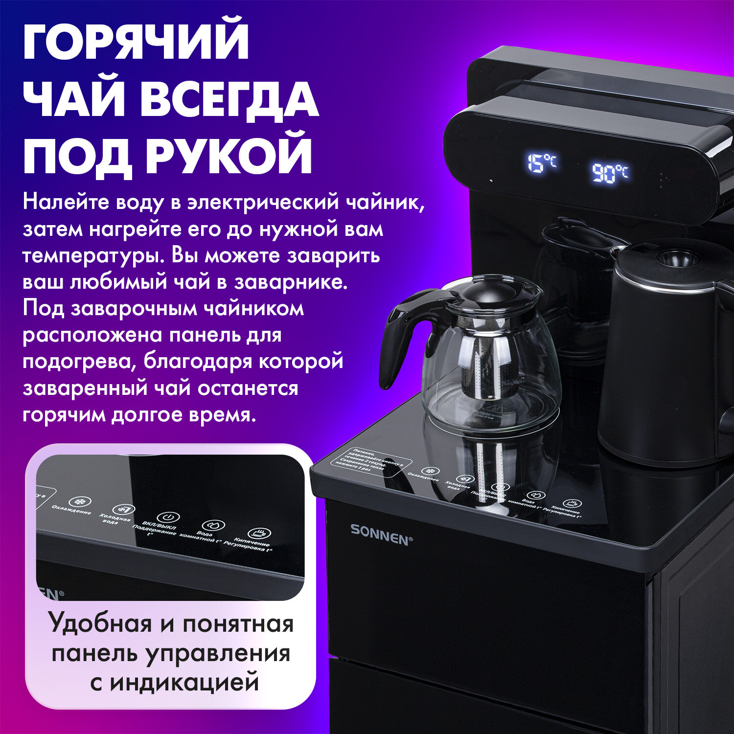 Кулер для воды с чайником SONNEN TBE-01 Tea Bar, напольный, ОХЛАЖДЕНИЕ ЭЛЕКТРОННОЕ, сенсорное управление, пульт ДУ, дисплей, шкафчик Код товара: 455749 17 253,08 ₽ Купить Производитель:SONNEN Кулер для воды SONNEN TBE-01 — это уникальное сочетание кулера и чайного столика, которое станет незаменимым помощником в вашем доме или офисе. Благодаря компактности и функциональности он идеально впишется в интерьер любого помещения. Устройство представляет собой кулер с нижней загрузкой и чайным столиком. На столике размещены заварочный и электрический чайники. Вода подаётся в электрический чайник через кран и затем нагревается. Под заварочным чайником расположена панель для подогрева, благодаря которой заваренный чай остаётся горячим долгое время. Модуль электронного охлаждения мощностью 70 Вт поддерживает температуру холодной воды на уровне 15 °C. На чайном столике расположена панель управления, с помощью которой можно получить холодную воду или воду комнатной температуры, охладить воду, выбрать температуру нагрева или отключить устройство. Доступен нагрев от 50 до 100 °C. Температуру горячей и холодной воды можно отслеживать на дисплее. Управление также возможно с помощью пульта ДУ. Под чайным столиком расположен небольшой шкафчик для хранения снеков к чаю. Перед первым использованием необходимо слить примерно 1 л воды для очистки бака холодной воды и внутренних трубок от скопившейся пыли после производства и транспортировки.Производство: КитайТип установки: напольныйТип охлаждения: электронныйПодача воды с нагревом: даПодача воды с охлаждением: даПодача воды комнатной температуры: даКоличество кранов подачи воды: 2 шт. Серия: TBEРекомендуемое количество пользователей: 10Наличие встроенного отделения для хранения: шкафчикРазмещение бутыли с водой: нижнее размещениеТип крана: сенсорМощность нагрева: 1280 ВтМощность охлаждения: 70 ВтПроизводительность нагрева: 13 л/часПроизводительность охлаждения: 0.75 л/часТемпература нагревания воды: 100 градусТемпература охлаждения воды: 15 градусЕмкость бака для горячей воды: 0 лЕмкость бака для холодной воды: 0.4 лТип нагревательного элемента: ТЭНРегулировка температуры нагрева и охлаждения: даИнформационный дисплей: даЗащита от протечек воды: даПодсветка: даОбъем шкафчика: 6 лНапряжение: 220 ВМатериал корпуса: металл/стекло/пластикЦвет корпуса: черныйДлина шнура: 1.2 мВысота: 1040 ммШирина: 325 ммГлубина: 340 ммВес (без упаковки): 6.2 кгВес: 9,82 кгРазмер упаковки: 77.9 × 37.9 × 39 смОбъём: 0.1151 м3Промежуточная упаковка: 1 штТранспортная упаковка: 1 штШтрих-код: 4606224439983 Файлы Приложение-1.pdf Сертификат-1.jpg Сертификат-2.jpg Сертификат-3.jpg Сертификат-4.jpg Сертификат-5.jpg