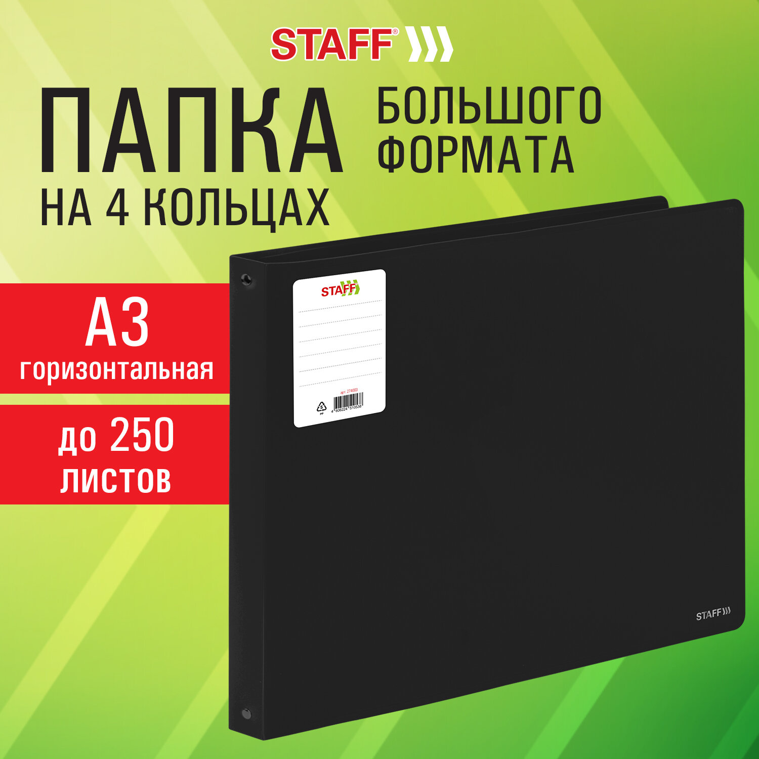 Папка на 4 кольцах БОЛЬШОГО ФОРМАТА А3, ГОРИЗОНТАЛЬНАЯ, 30 мм, до 250 листов, черная, 0,8 мм, STAFF Код товара: 274003 581,79 ₽ Купить Производитель:STAFF Папка на кольцах STAFF предназначена для временного или длительного хранения, систематизации, архивирования документов. Такие папки используются в работе офисными сотрудниками различных специальностей, направлений, должностей. Папка формата А3 вмещает до 250 листов. Изготовлена из высококачественного пластика толщиной 0,8 мм со стандартной фактурой "песок". Допускается влажная обработка поверхности. Для идентификации имеется бумажная наклейка. Ширина корешка составляет 30 мм. Папка оснащена четырьмя кольцами, которые обеспечивают надежное хранение документов. В неё можно вставить файлы или проколотые дыроколом листы и, при необходимости, заменить их на другие.Производство: РоссияКоличество колец: 4Формат: А3Положение папки: горизонтальноеВместимость: 250 листовШирина корешка: 30 ммСерия: нетДиаметр колец: 25 ммДопустима влажная обработка: даМатериал: пластикТолщина материала: 0.8 ммФактура: песокЦвет: черныйИндивидуальная упаковка: даВес: 325 грРазмер упаковки: 4 × 46 × 31.1 смОбъём: 0.0033 м3Промежуточная упаковка: 16 штТранспортная упаковка: 16 штШтрих-код: 4606224510538 Файлы